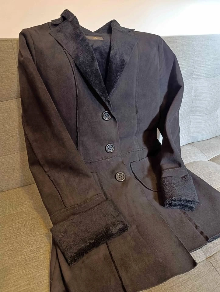 Black faux suede jacket/coat with a plush, soft sherpa lining. Very warm. Perfect for cold weather, offering great insulation and a chic look. Button-front closure, classic collar, and super soft internal lining. Excellent used condition, worn only a few times.