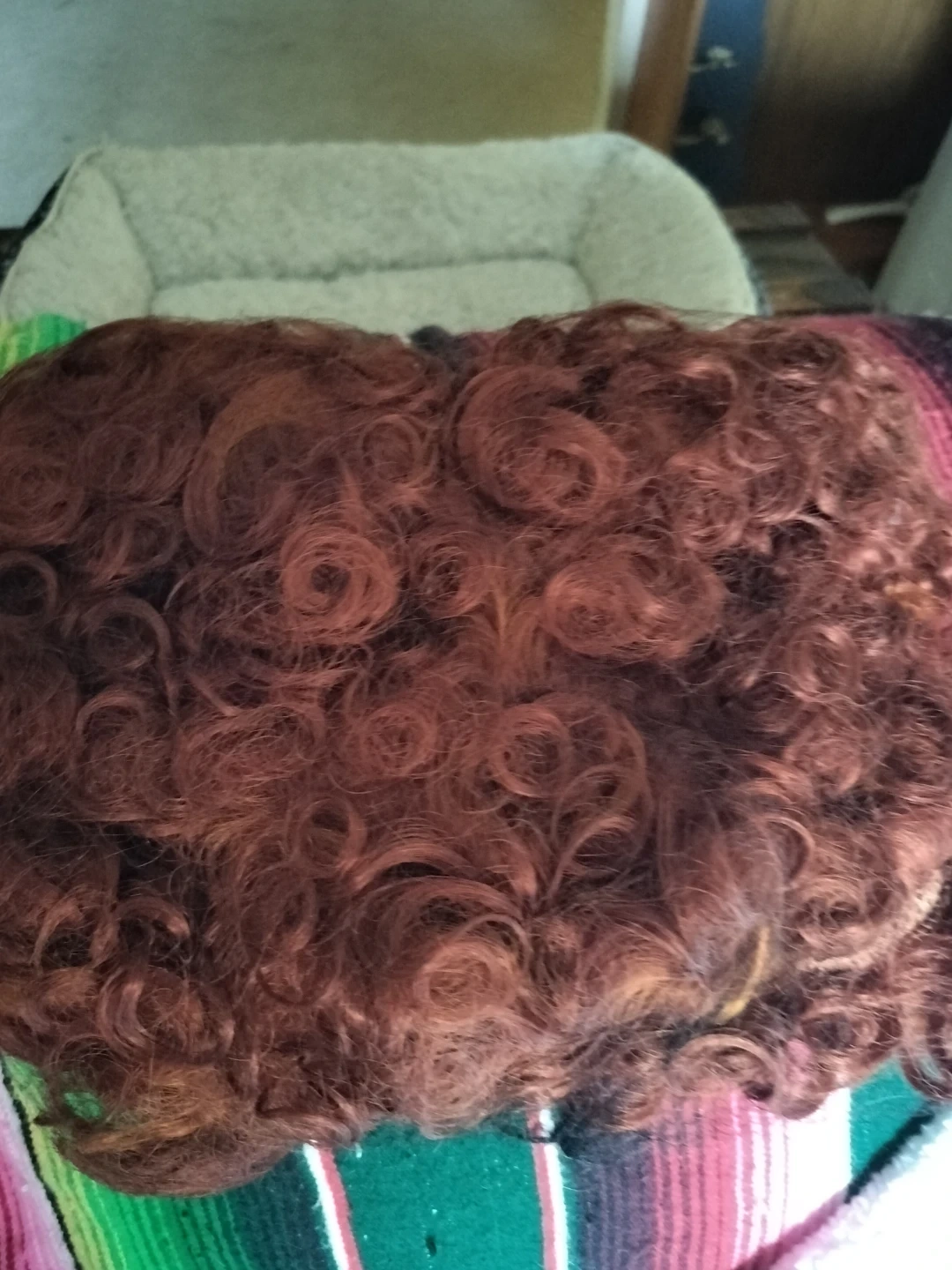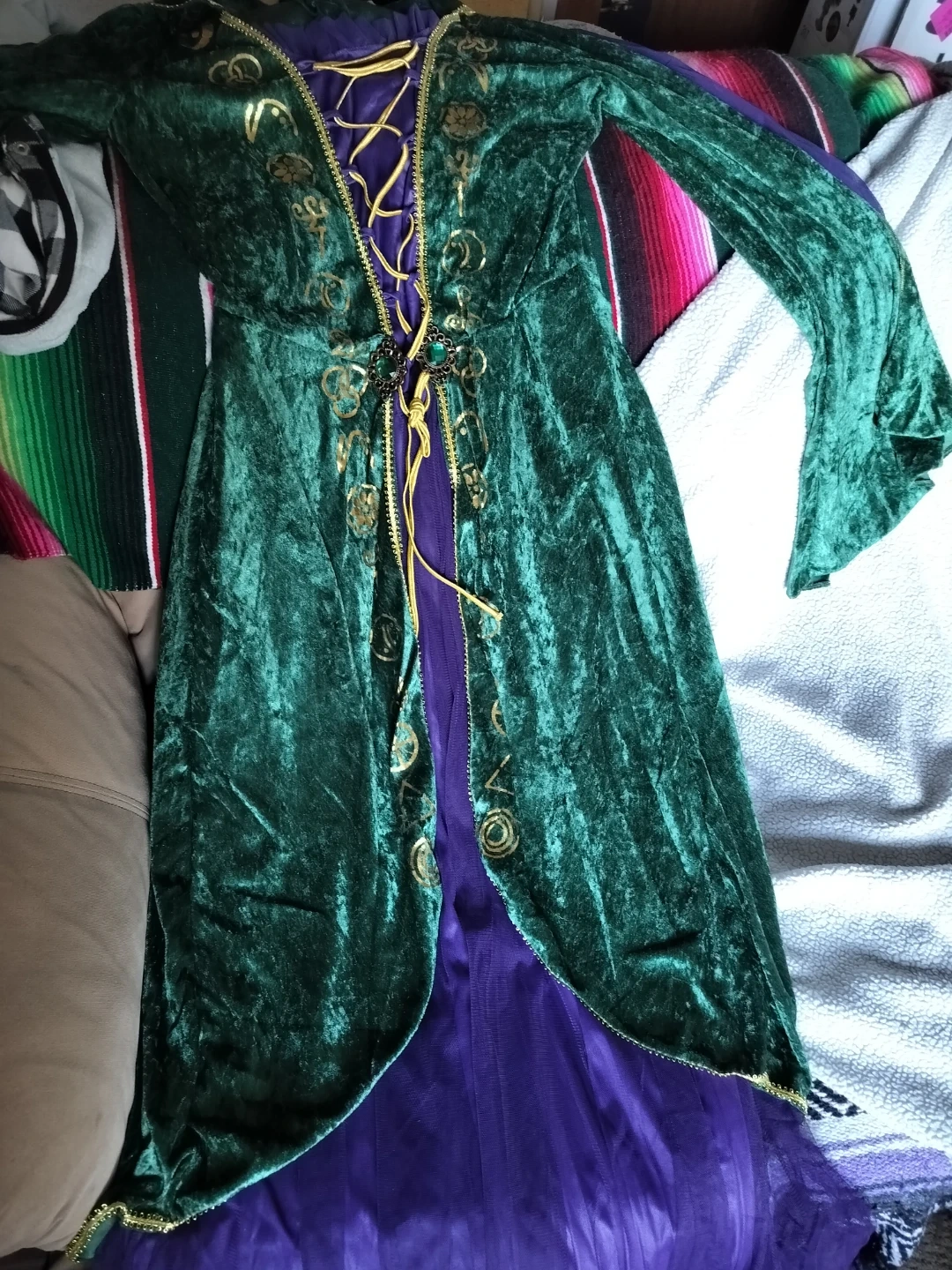 This Winifred Sanderson costume features a long green velvet dress with purple accents and gold embroidery. It has a lace-up front and bell sleeves. It's perfect for Halloween parties or dress-up events. Includes teeth, never used!! I ment to use them when I bought them, but ended up not to!! & Wig included. Costume only worn once. Size sm/med (6-9)