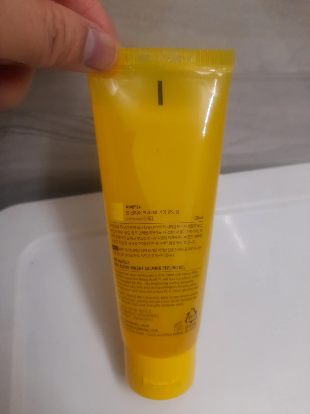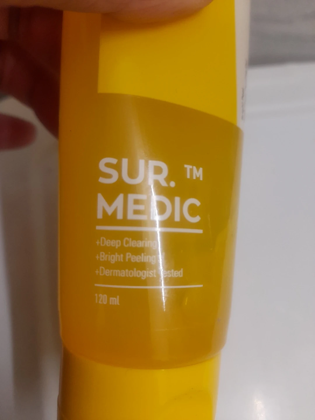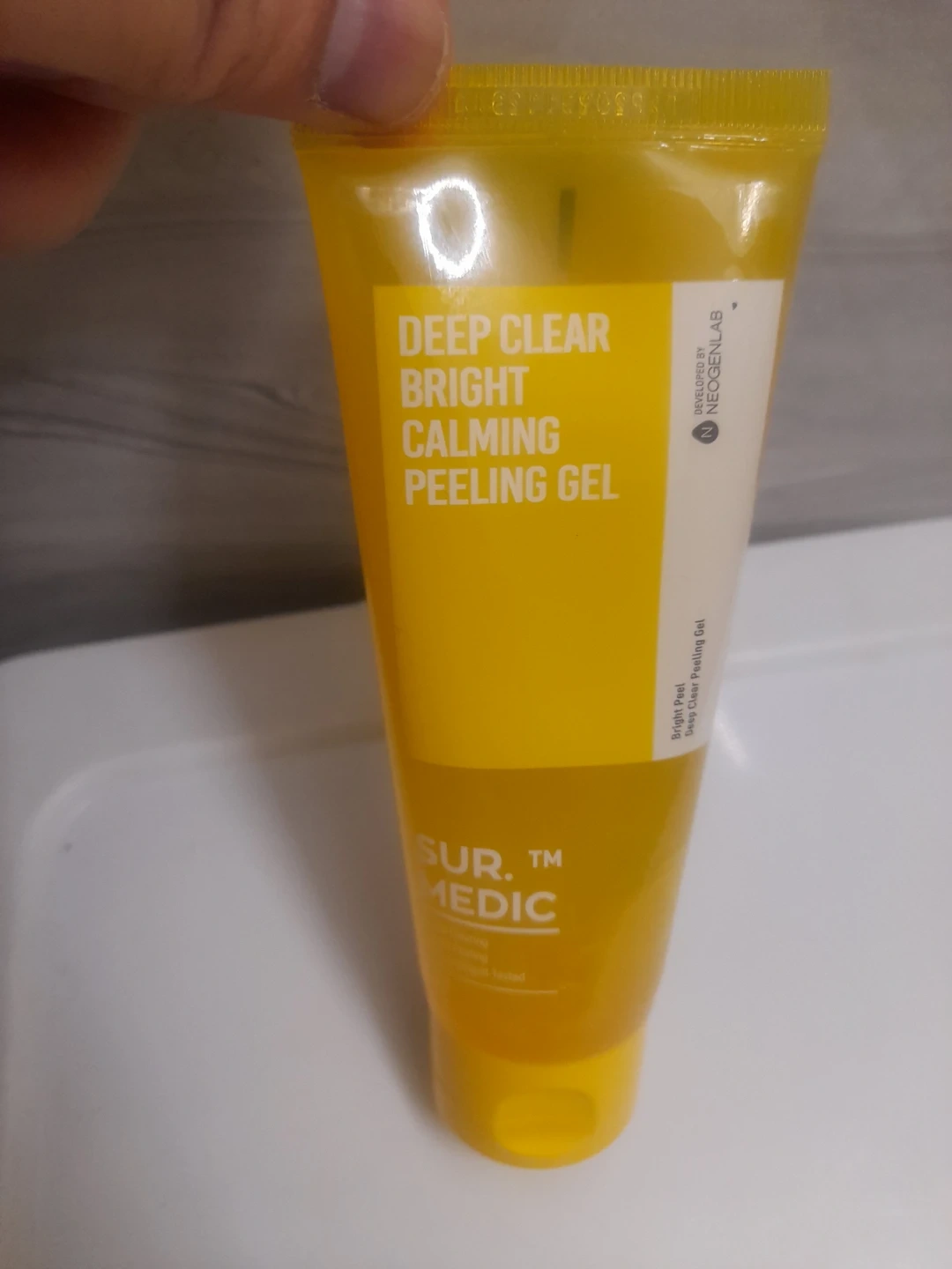 This is the SUR. MEDIC Deep Clear Bright Calming Peeling Gel. It's 120 ml and dermatologist tested. It helps with deep clearing and bright peeling.