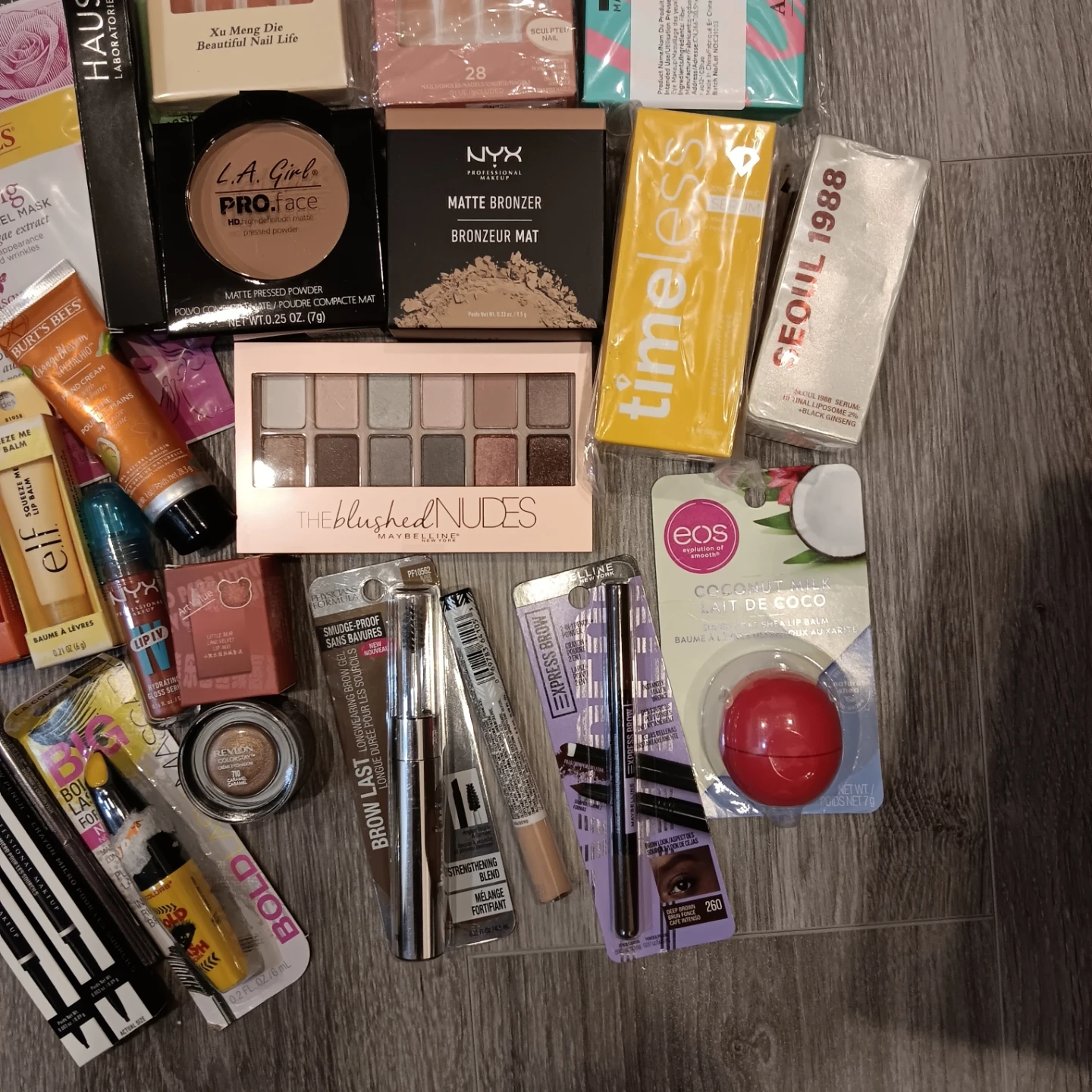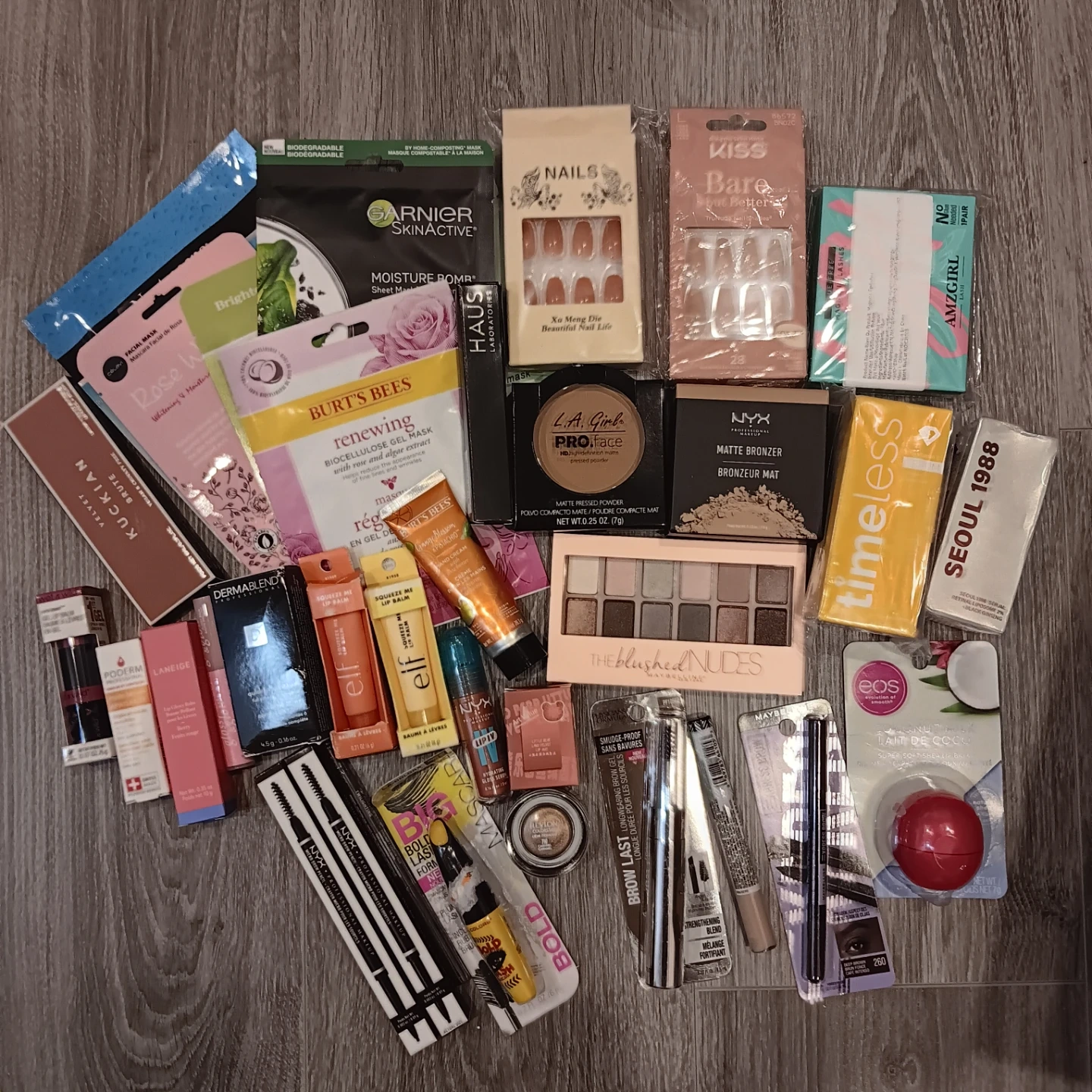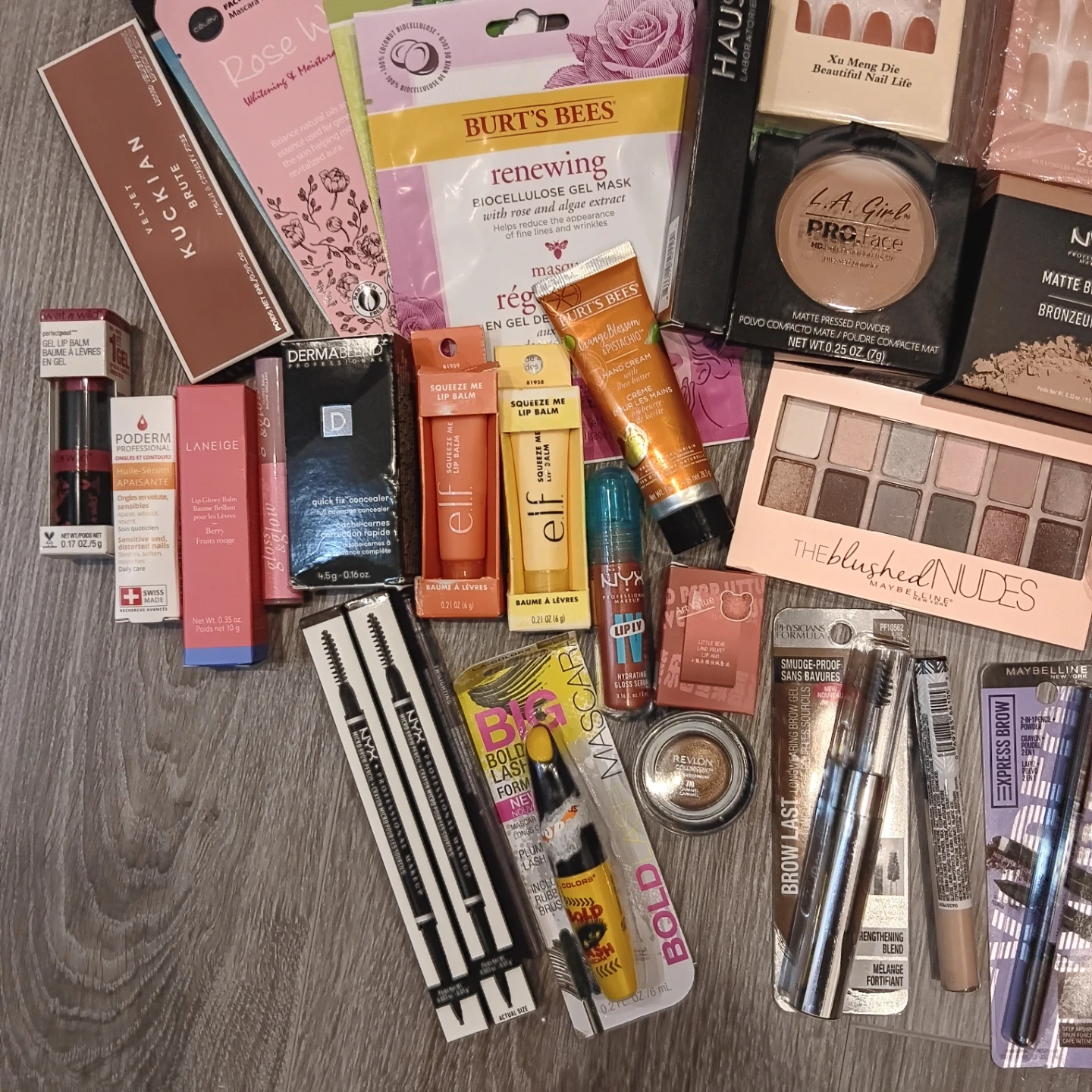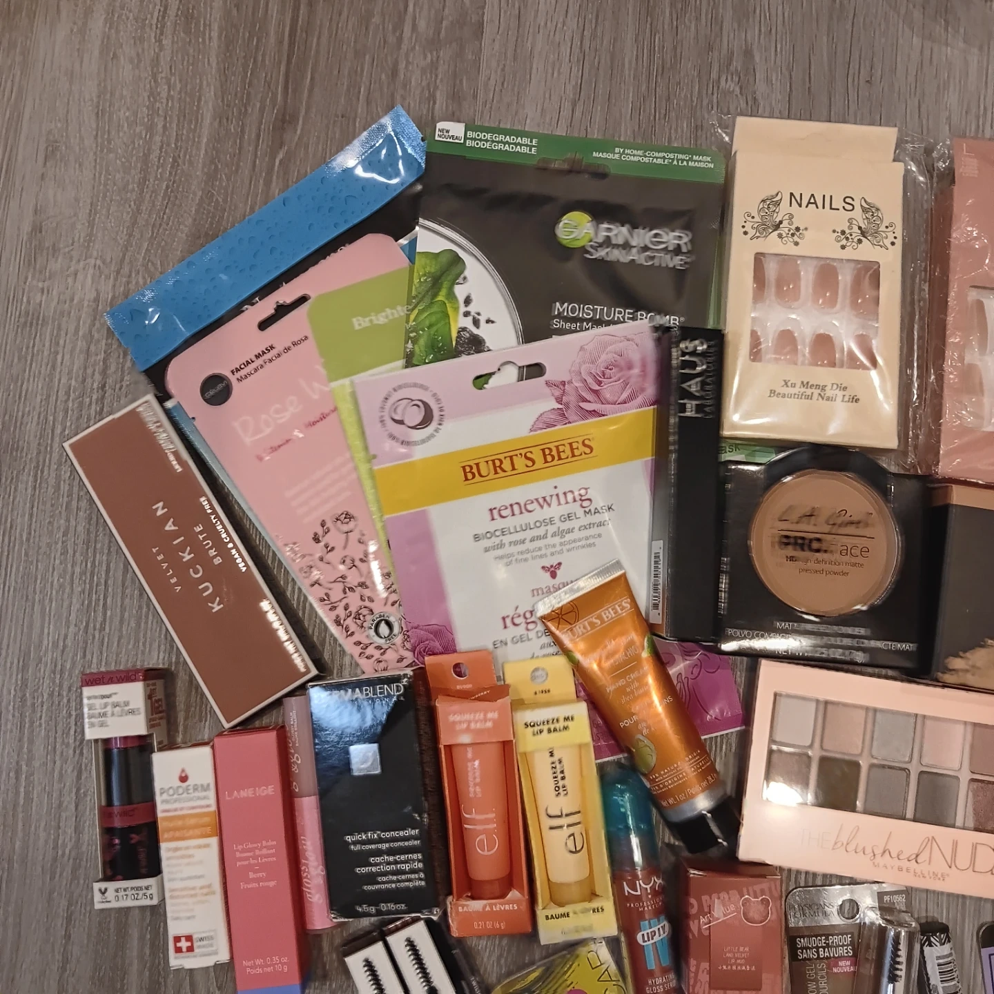 A collection of makeup and skincare products including lip balms, eyeshadow palettes, face masks, and makeup tools. Items from brands like Burt's Bees, NYX, and Elf are included. Various shades and formulas for beauty enthusiasts. (Over 30 items)