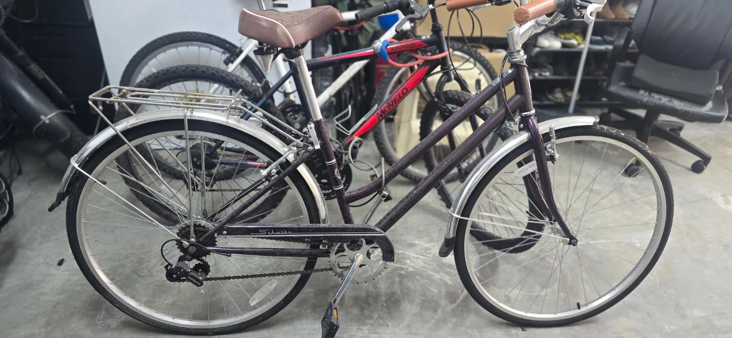 This is a Schwinn women's cruiser bike in a brown colour. It has fenders and a rear rack. Great for leisurely rides around town!