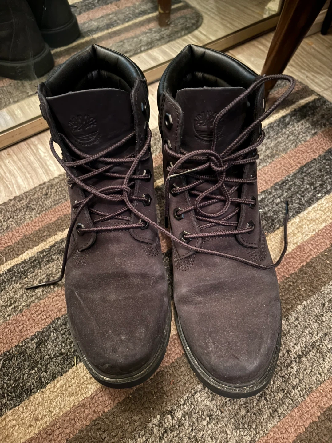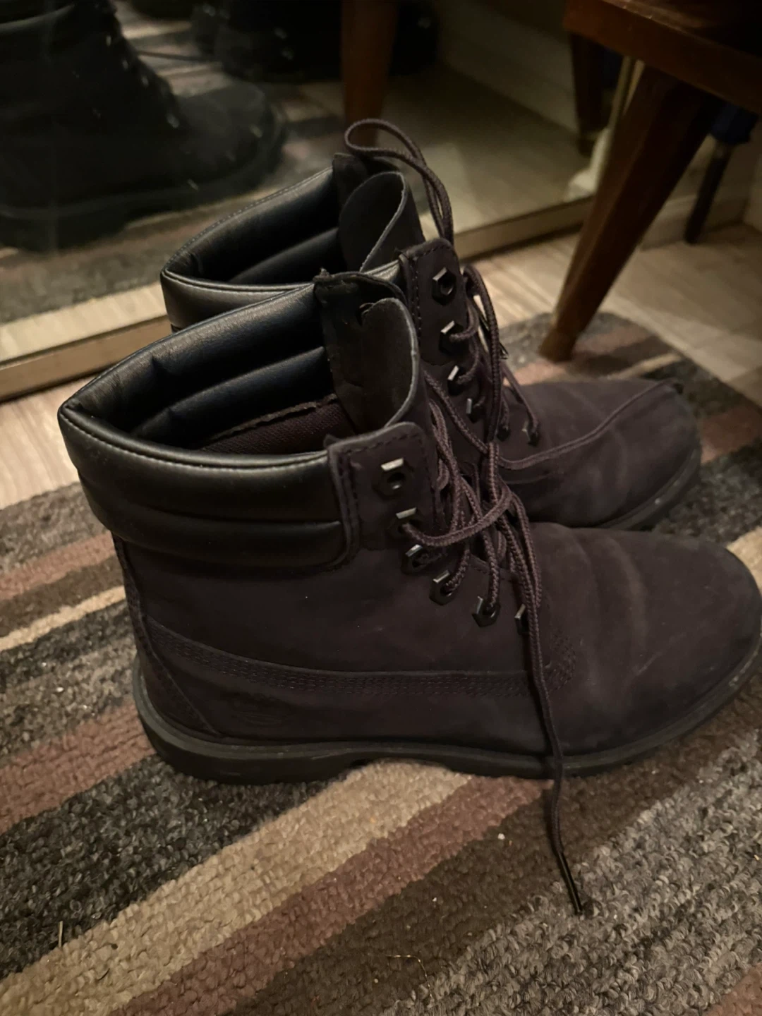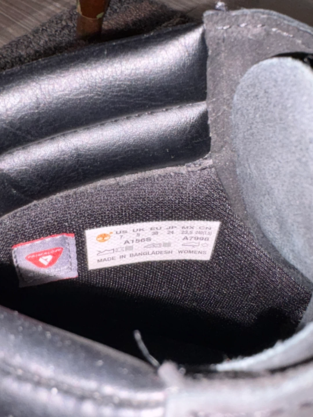 Timberland women's boots in a black suede finish. These are a size 7 US, 38 EU, and UK 5.5. Made in Bangladesh.