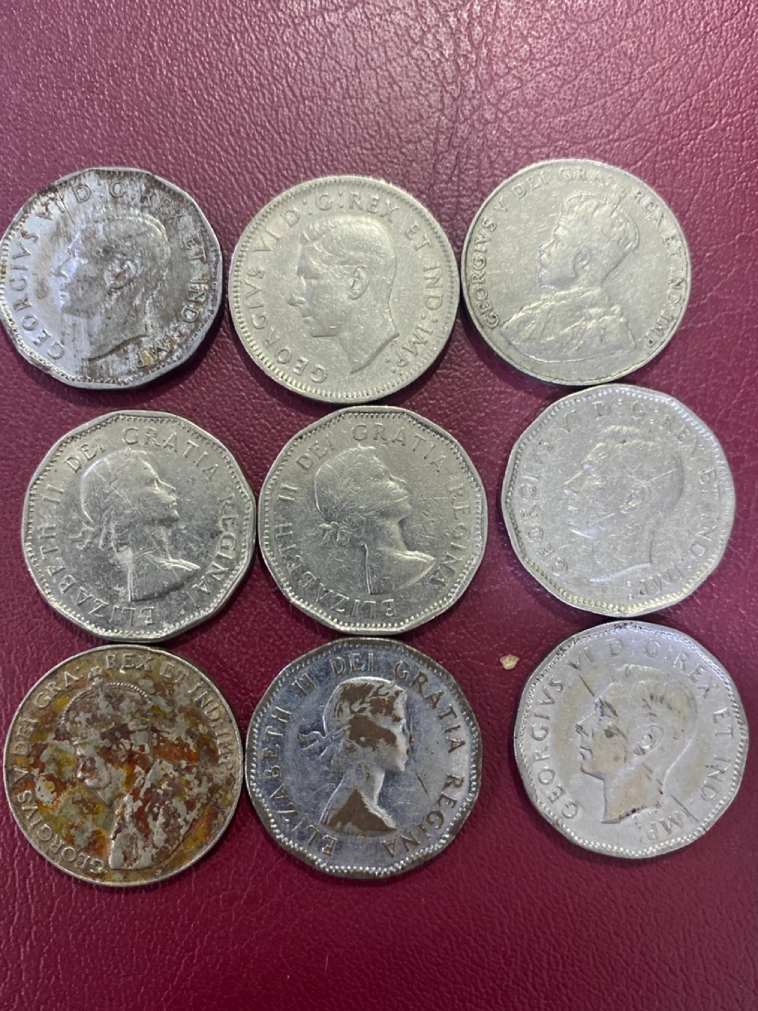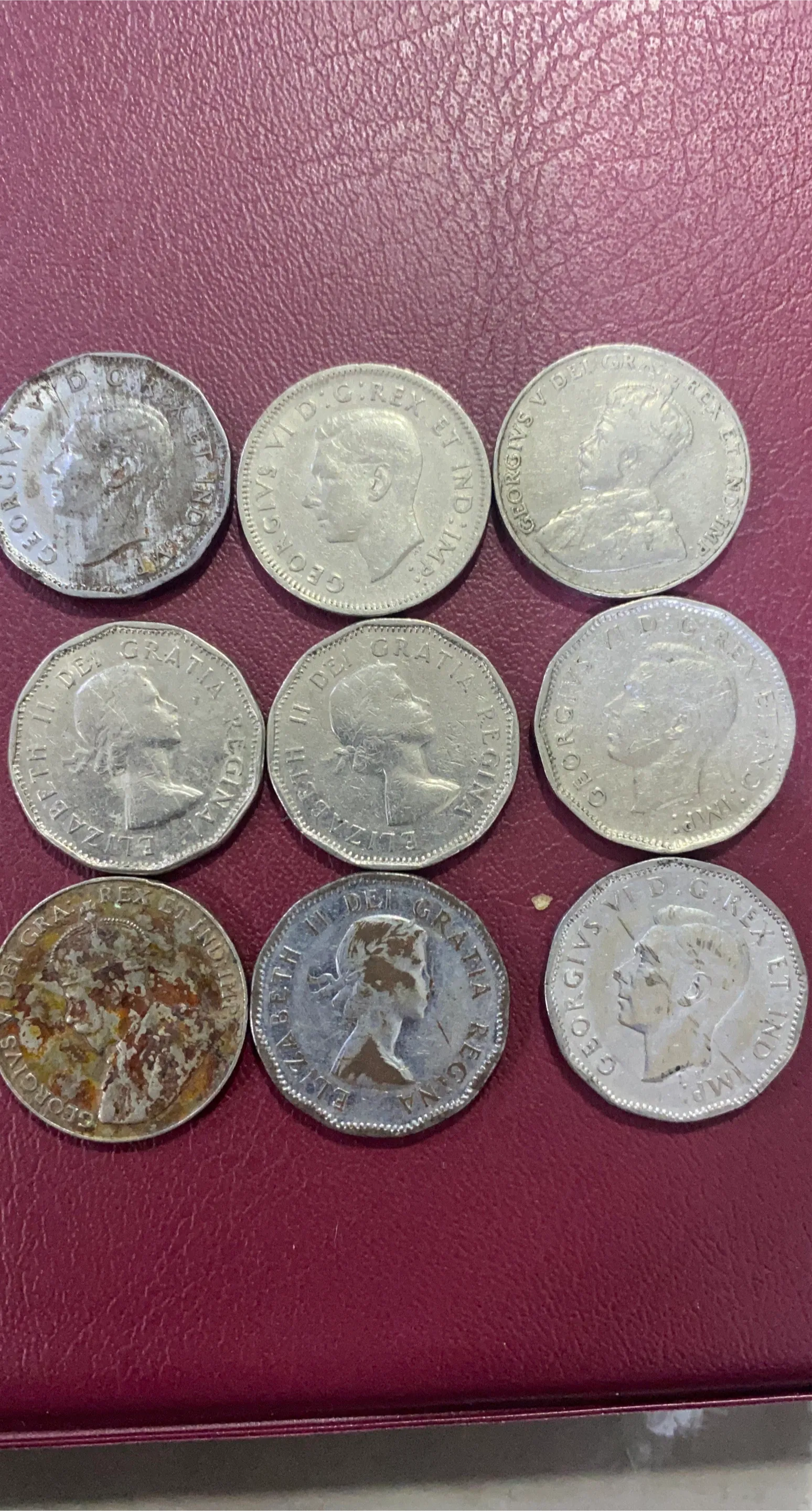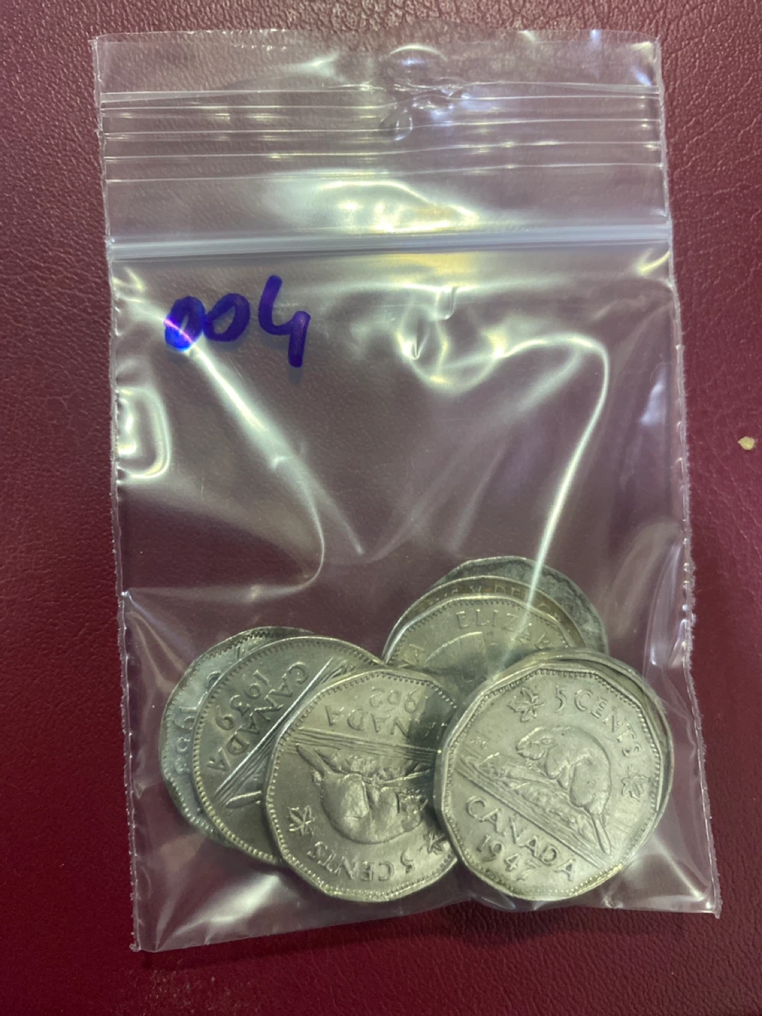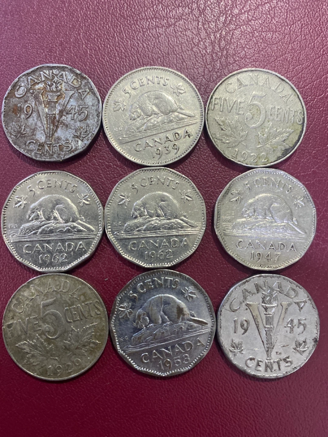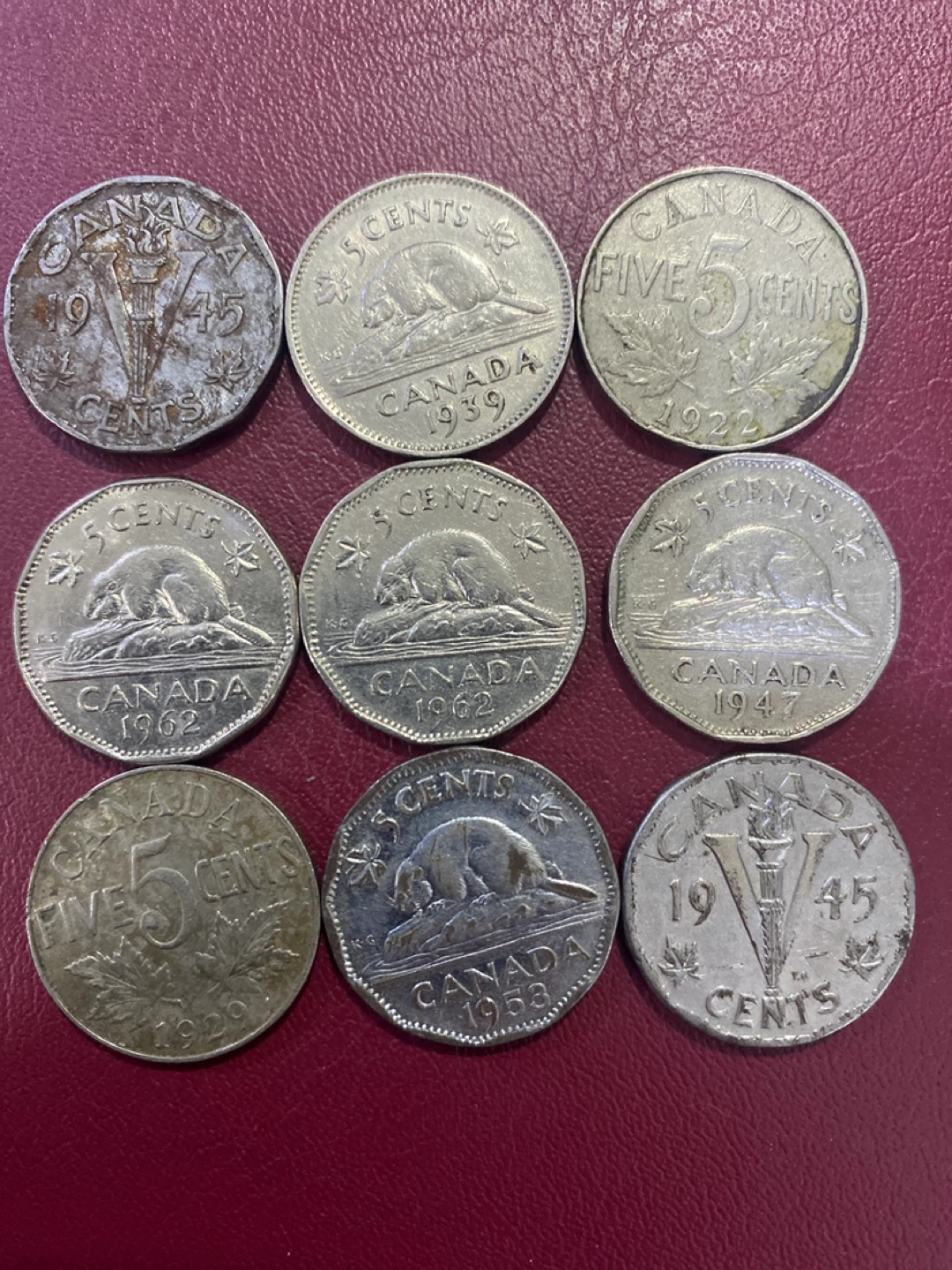 A collection of various Canadian 5 cent coins. Dates visible include 1922, 1939, 1947, 1953, 1962, and others. These coins feature the beaver and various Canadian monarchs. They show signs of age and wear.