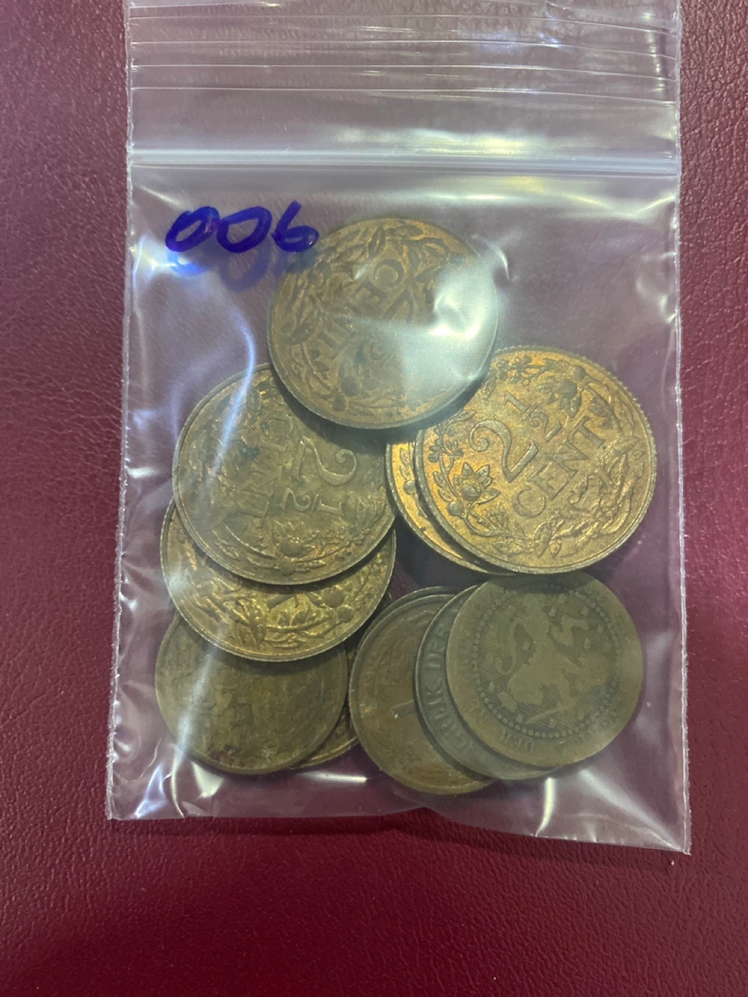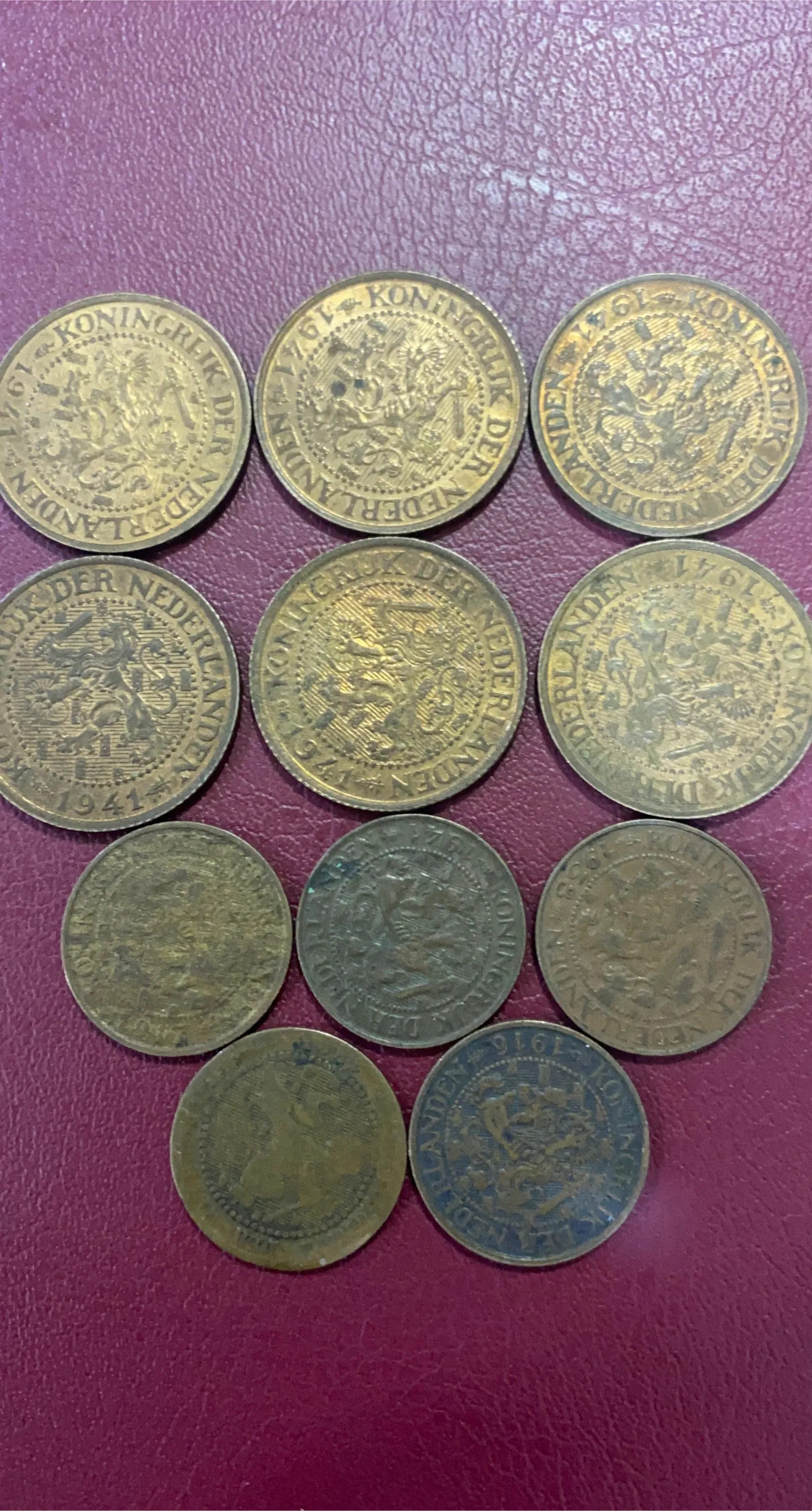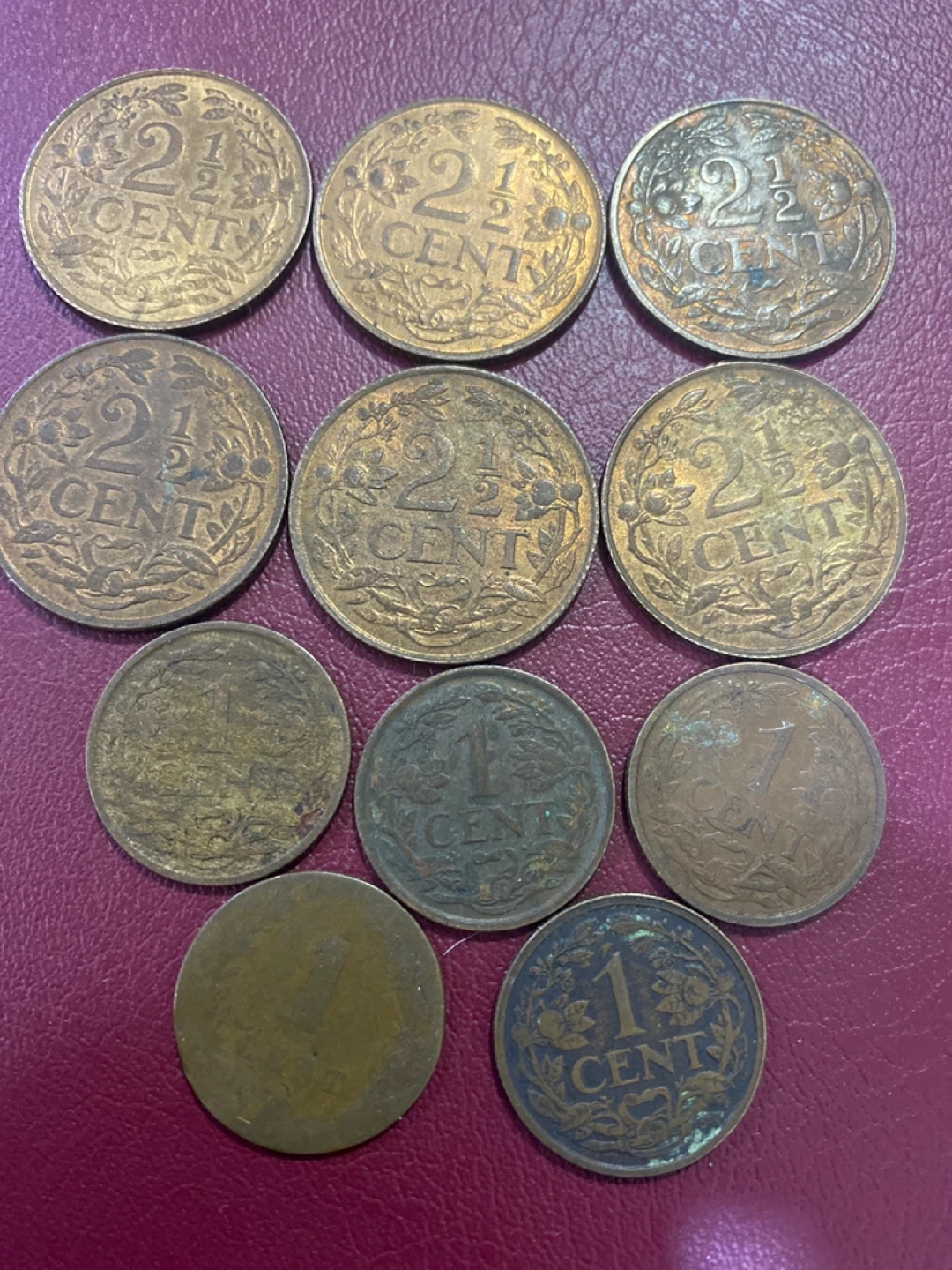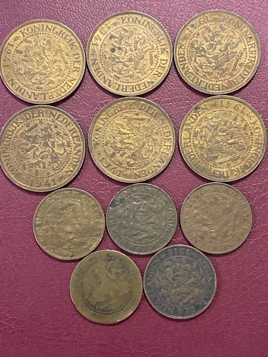 This collection includes several 2.5 cent and 1 cent coins from the Netherlands. Some coins are dated 1941 and 1916. They're made from a bronze-like metal. These coins are suitable for collectors or for educational purposes.