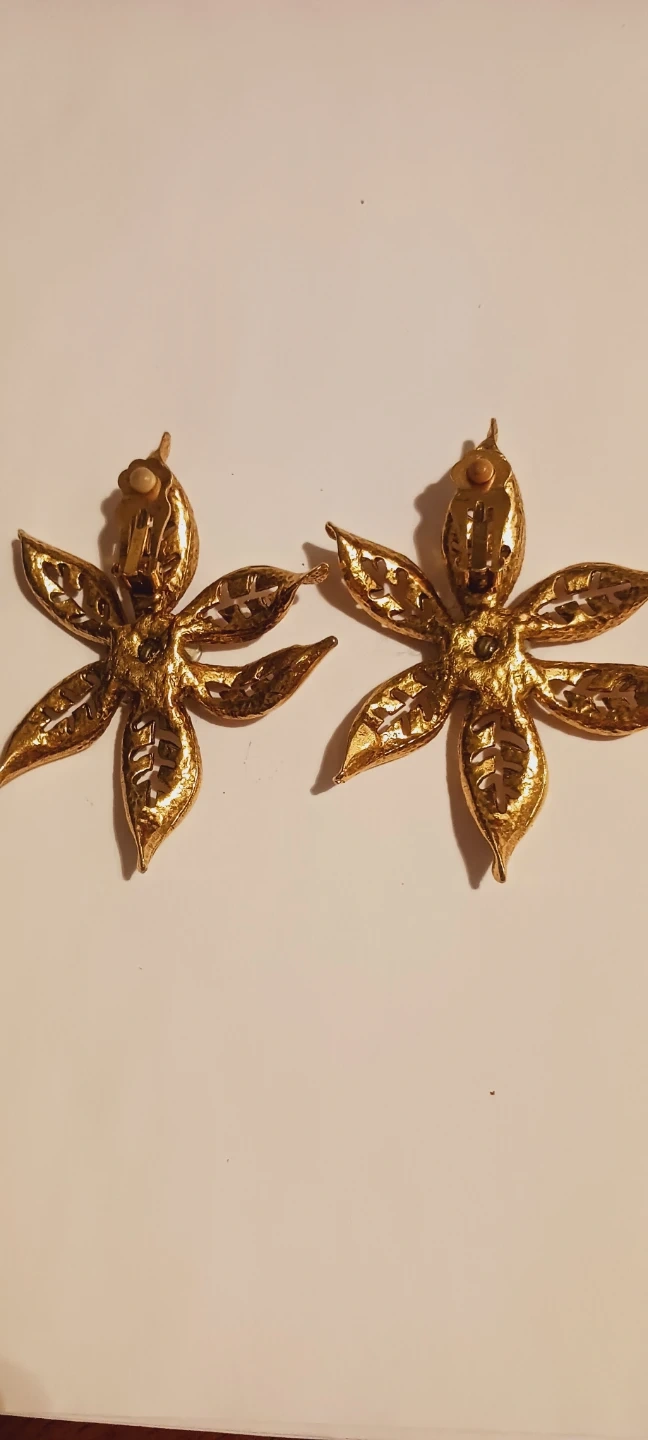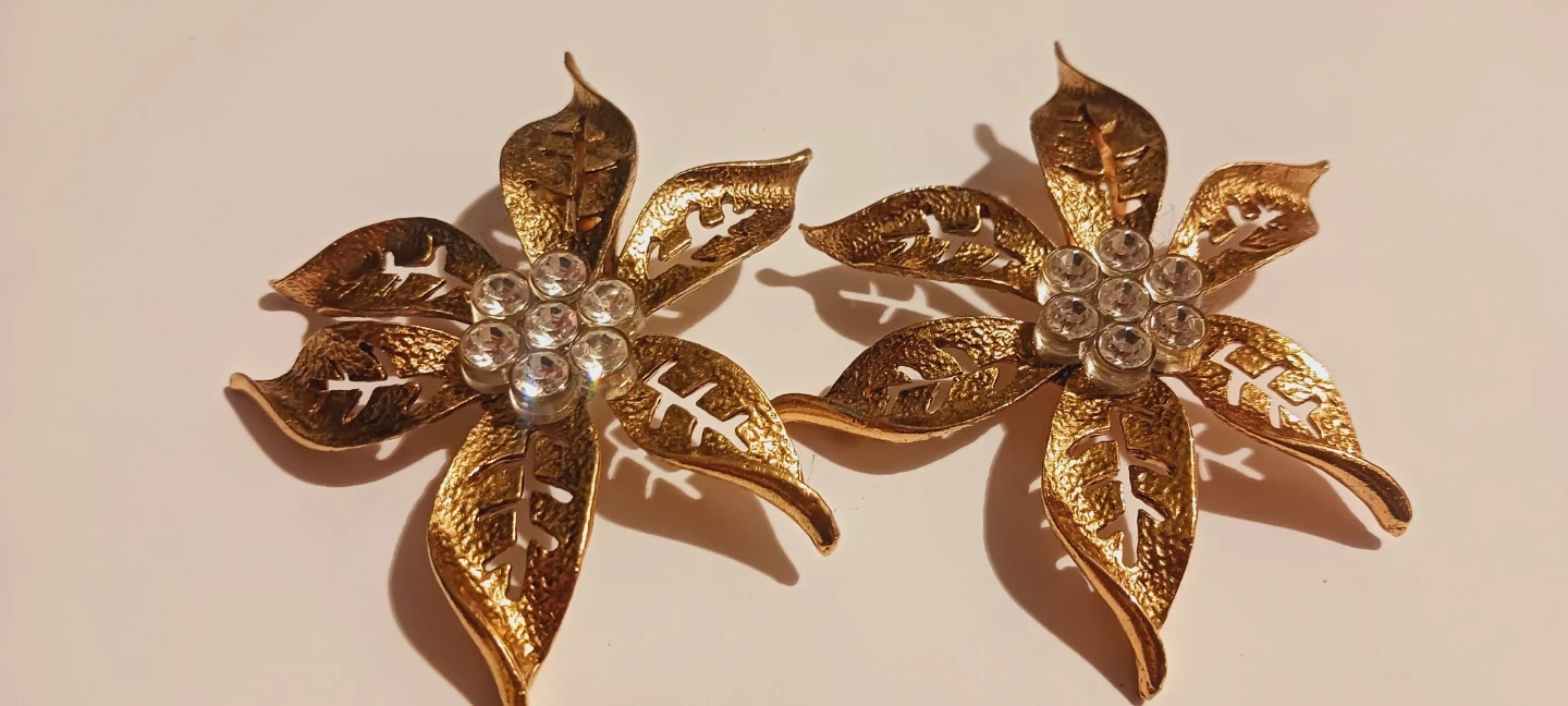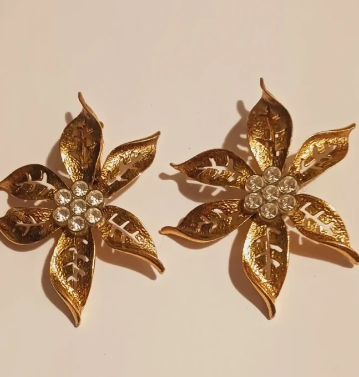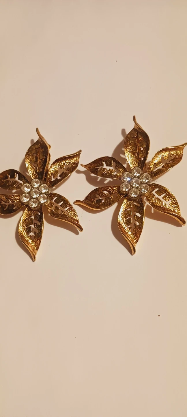 Gorgeous vintage statement gold-tone clip-on earrings shaped like flowers. They feature open-work petals and a cluster of clear rhinestones in the center. The clip-on backs are secure. These earrings would add a statement to any outfit!! Excellent condition, like new !! 3"×2". ALL MY PRICES ARE NEGOTIABLE !!
