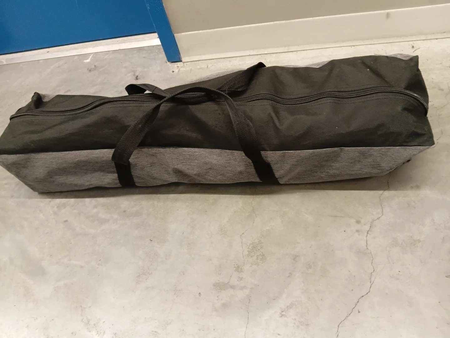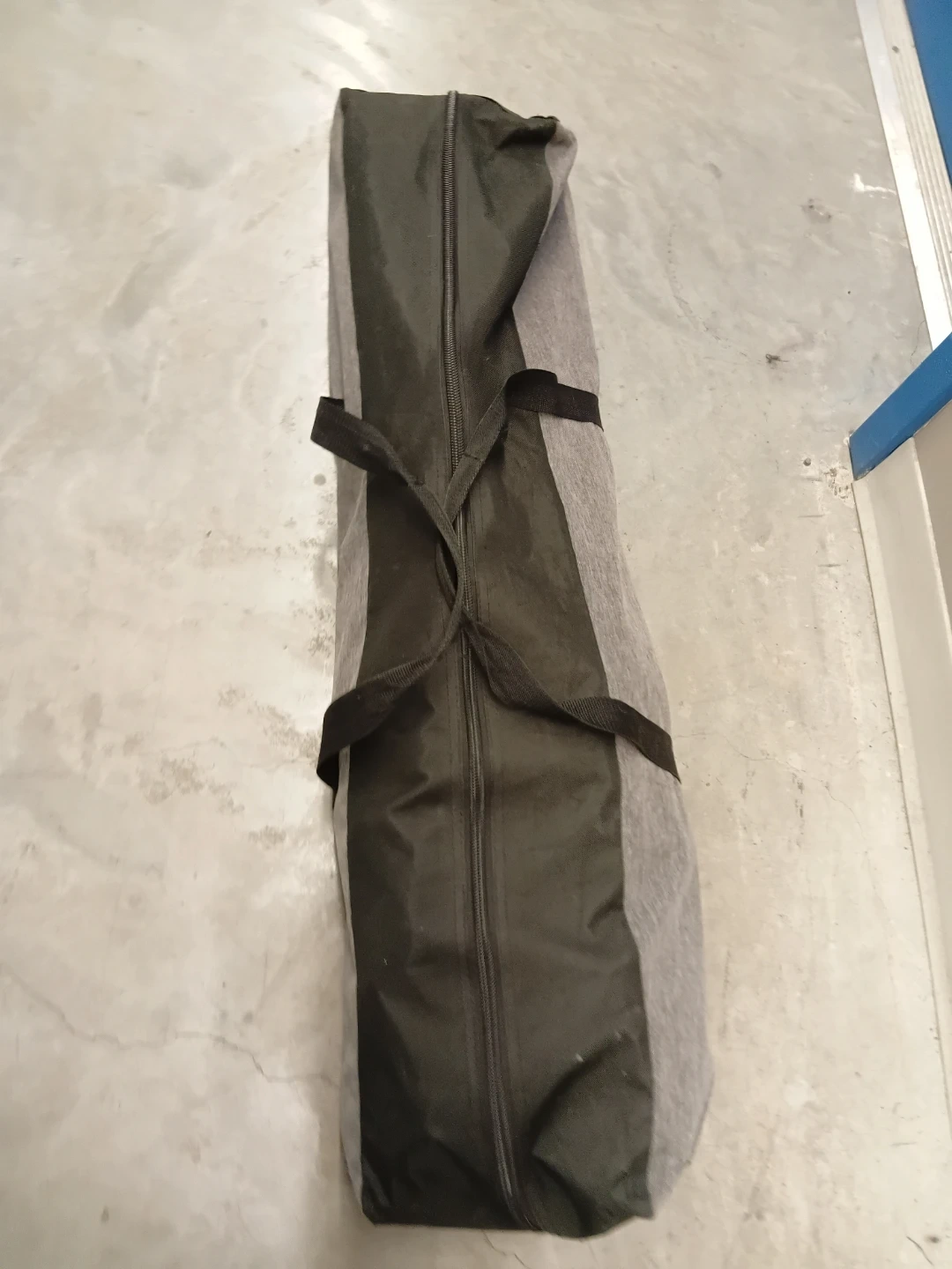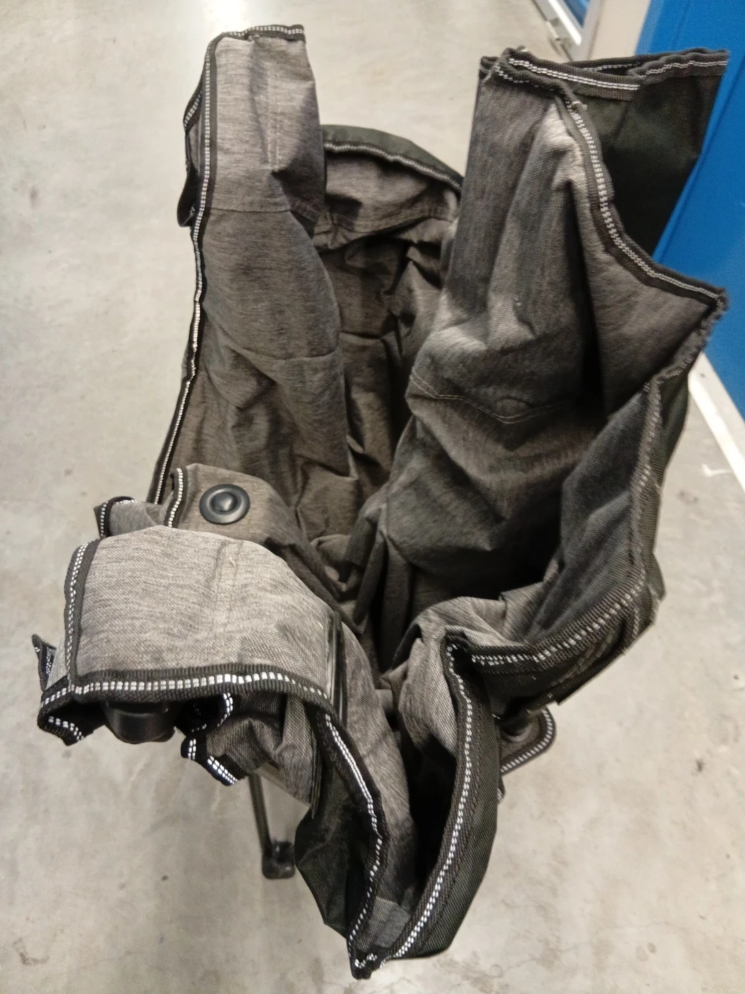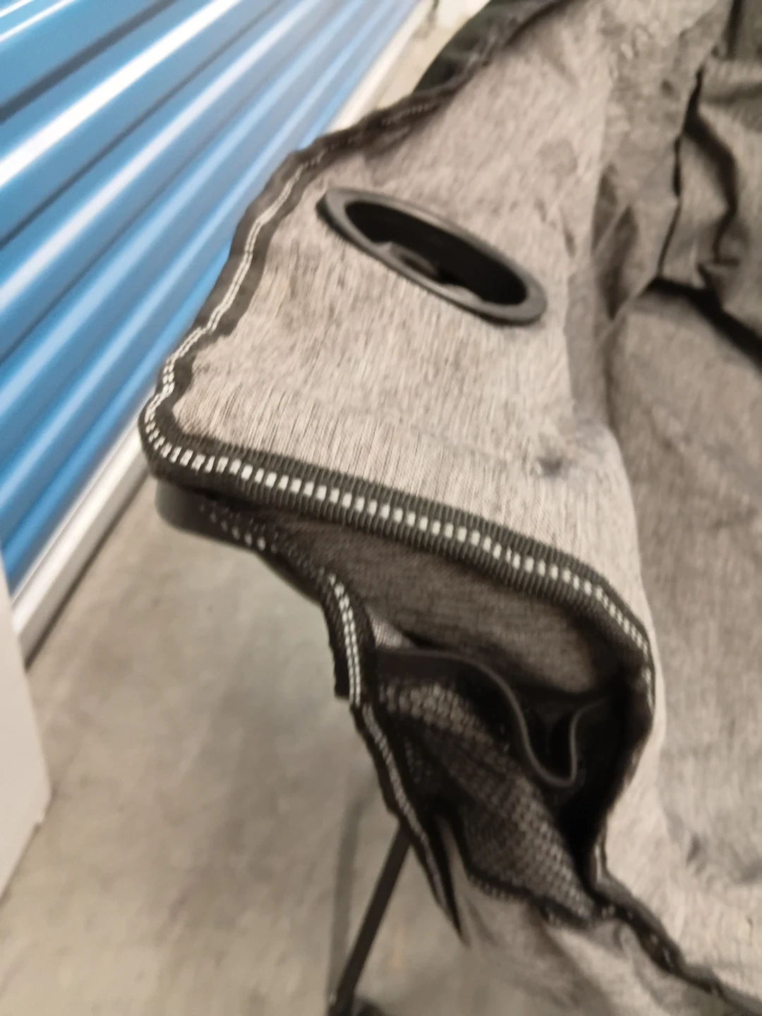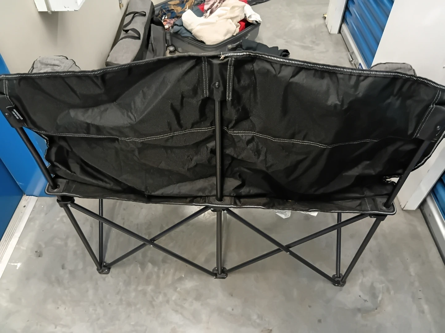 This is a foldable 2-person camping chair in grey. It's made of durable fabric with a sturdy metal frame. Includes a convenient carry bag for easy transport. Great for camping trips or backyard gatherings!
