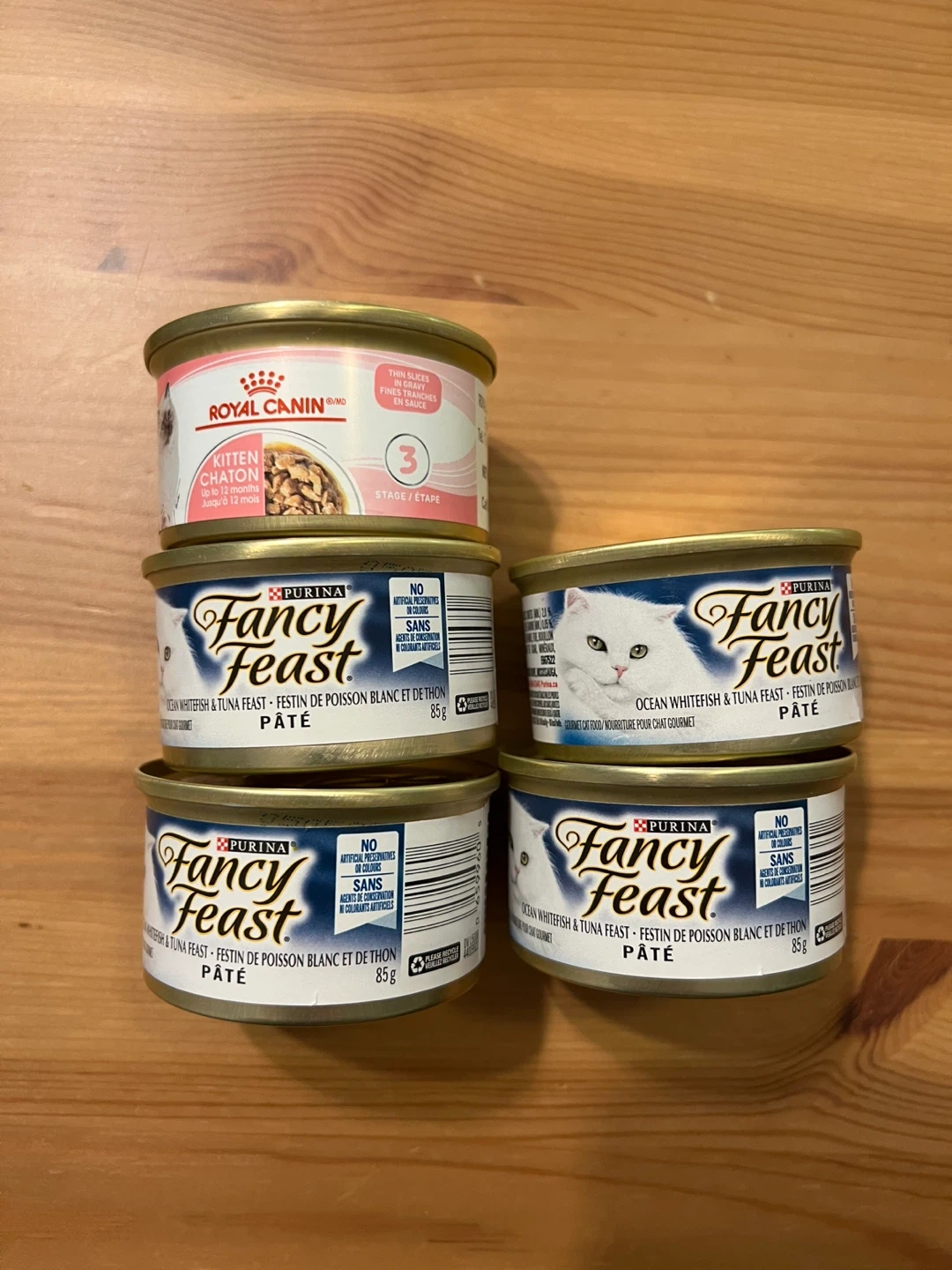 Purina Fancy Feast cat food (whitefish) 4 cans + Royal Canin kitten food 1 can