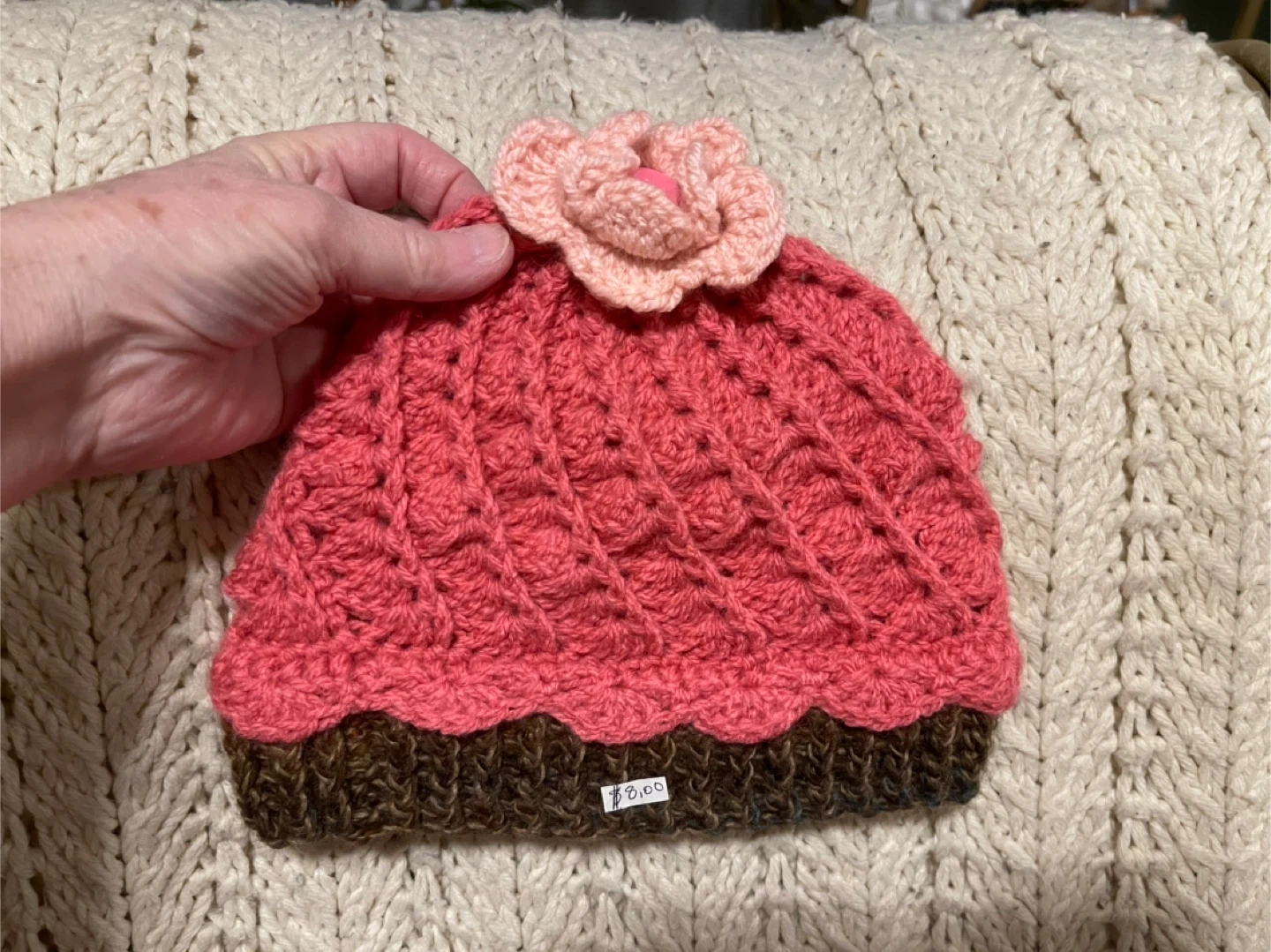 This is a darling handmade crocheted hat designed to look like a cupcake. It's made with soft yarn in a vibrant pink and a rich brown base, topped with a beautiful pink flower. It's a unique accessory!