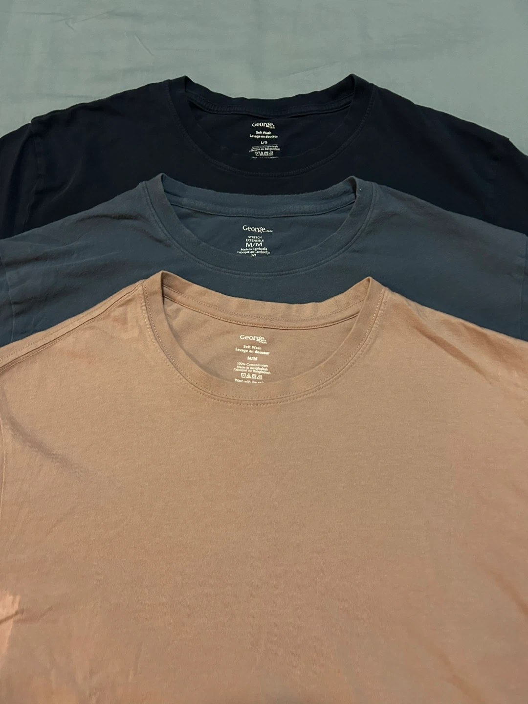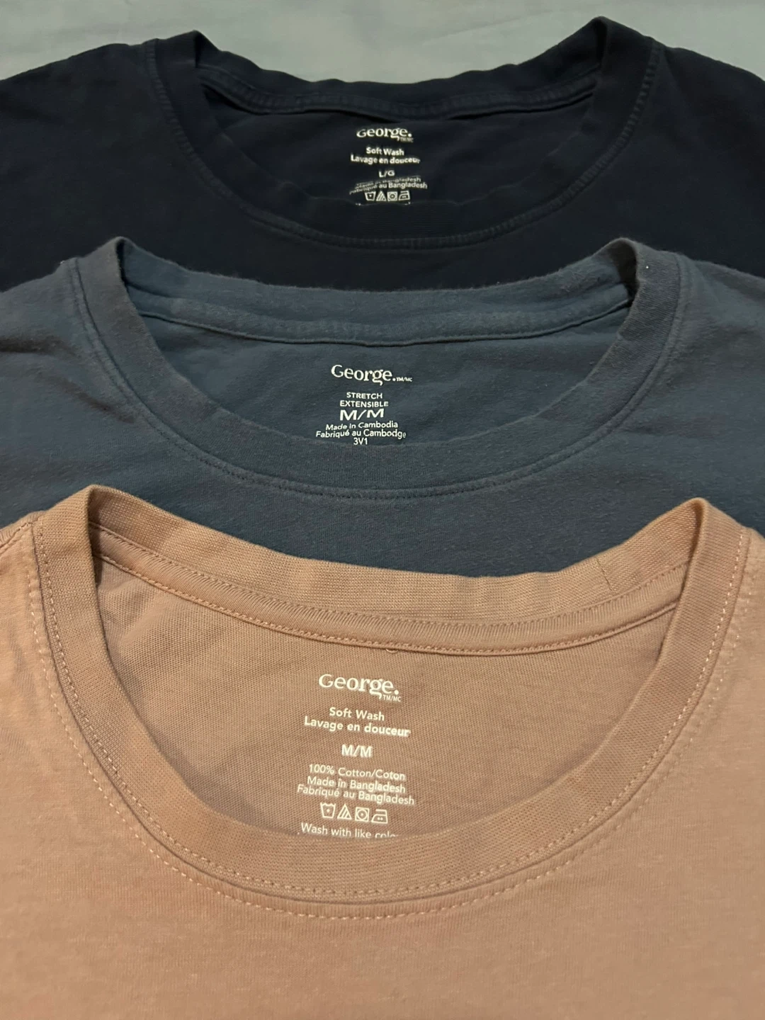 Bundle of three George t-shirts. Includes one light pink, one greyish blue , and one navy blue. All are size M & L and feature a soft wash finish. Made with 100% cotton. The pink one has slight discoloration.