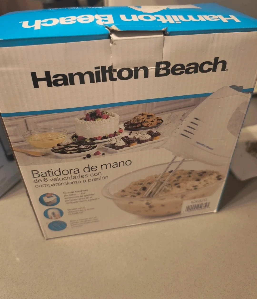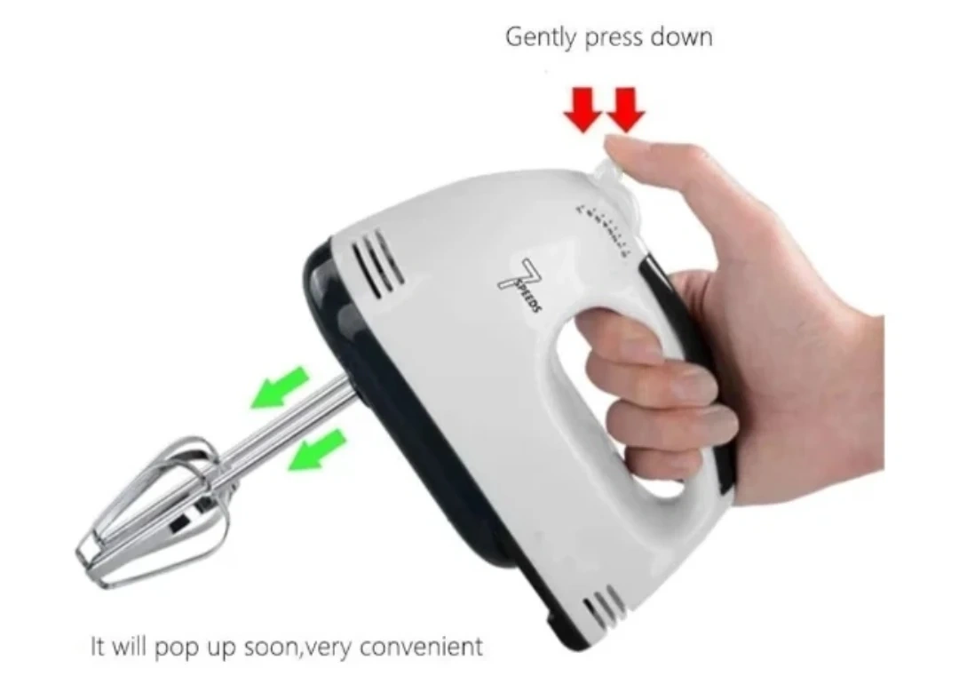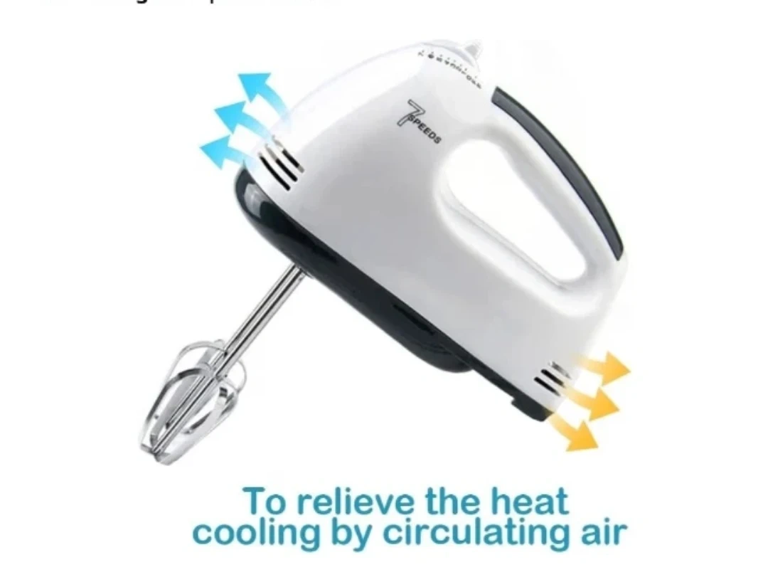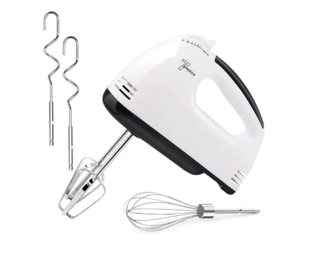 This white Hamilton Beach hand mixer comes with beaters, dough hooks, and a whisk. It has seven speed settings for various mixing needs, including low speed stirring for flour and high speed for cream. This mixer is great for whipping up batters, creams, and doughs.