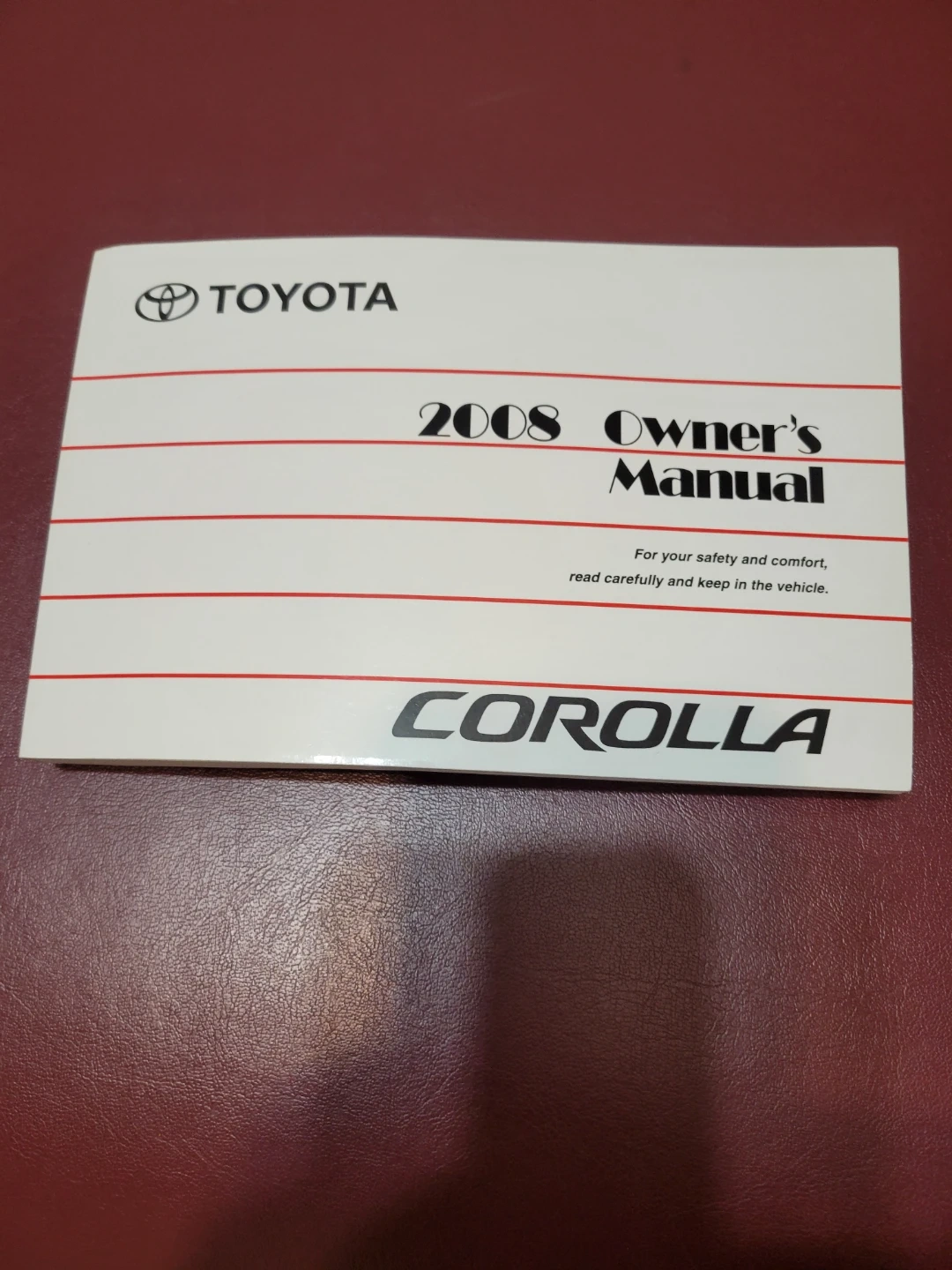 This is the owner's manual for a 2008 Toyota Corolla. It contains important information for your safety and comfort. Includes sections on gas station information, engine oil capacity, and fuel tank capacity. Has some water damage but no pages are stuck together.