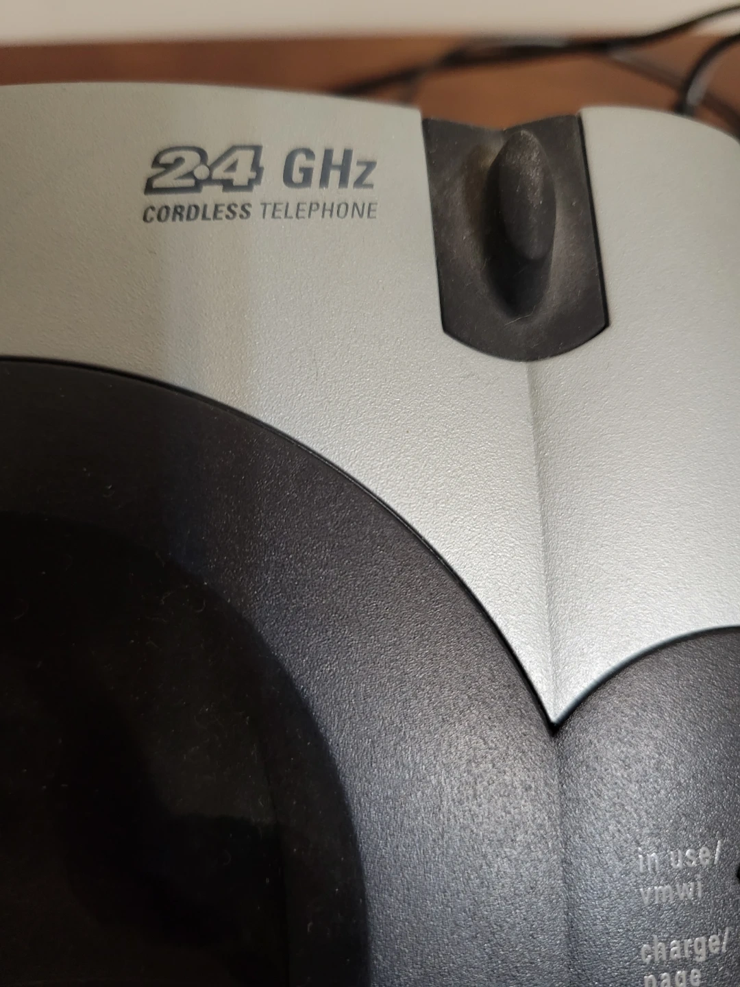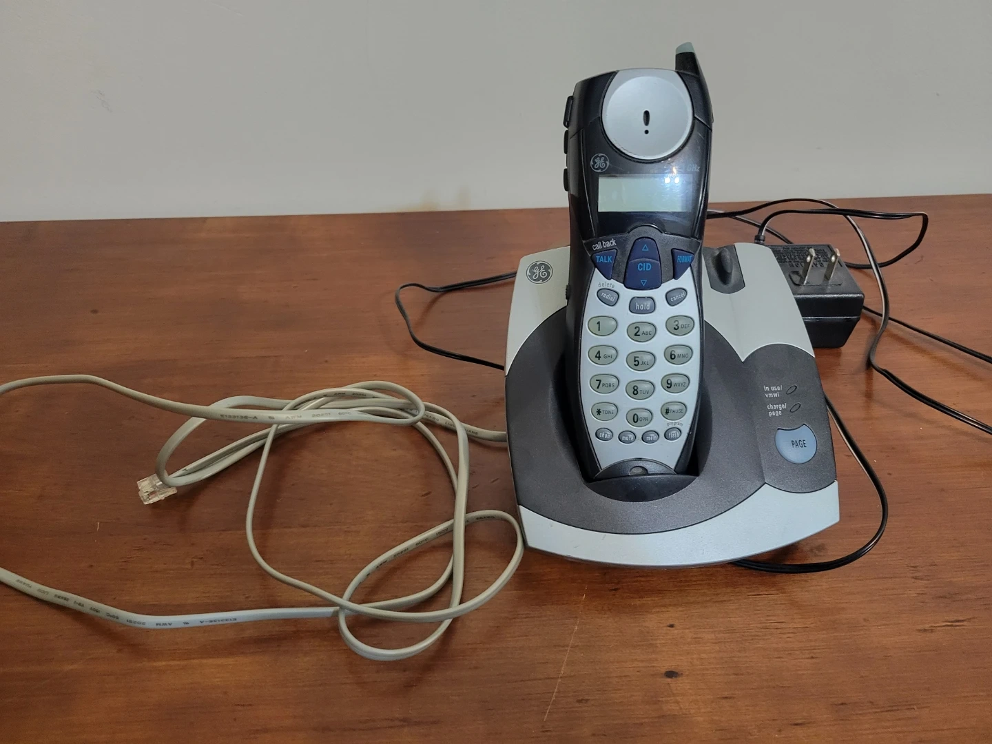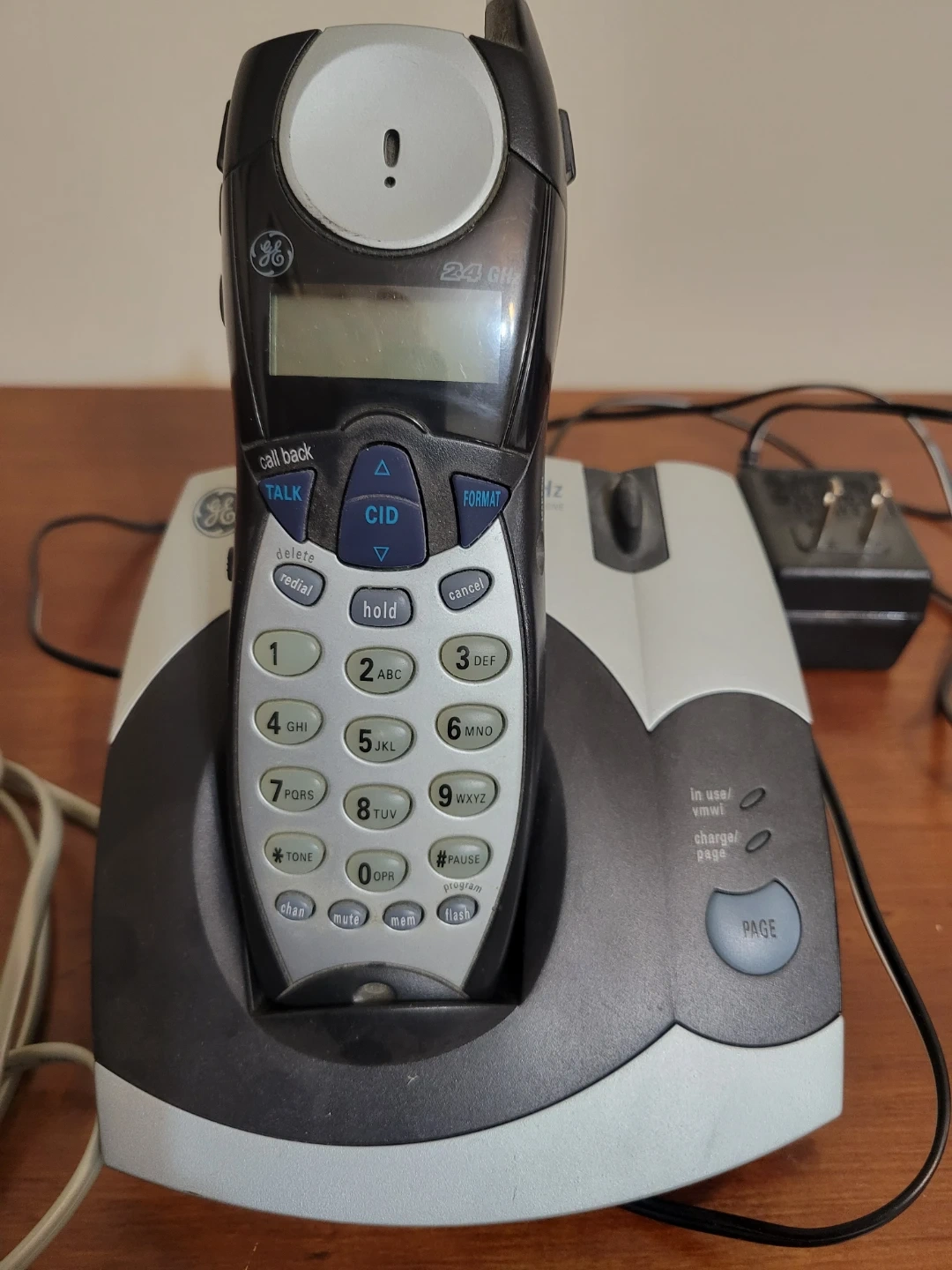 This is a GE 24 GHz cordless telephone. It comes with a base and a handset. The telephone's frequency is 24 GHz. Needs a new battery.
