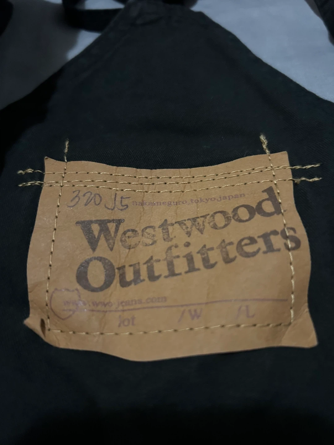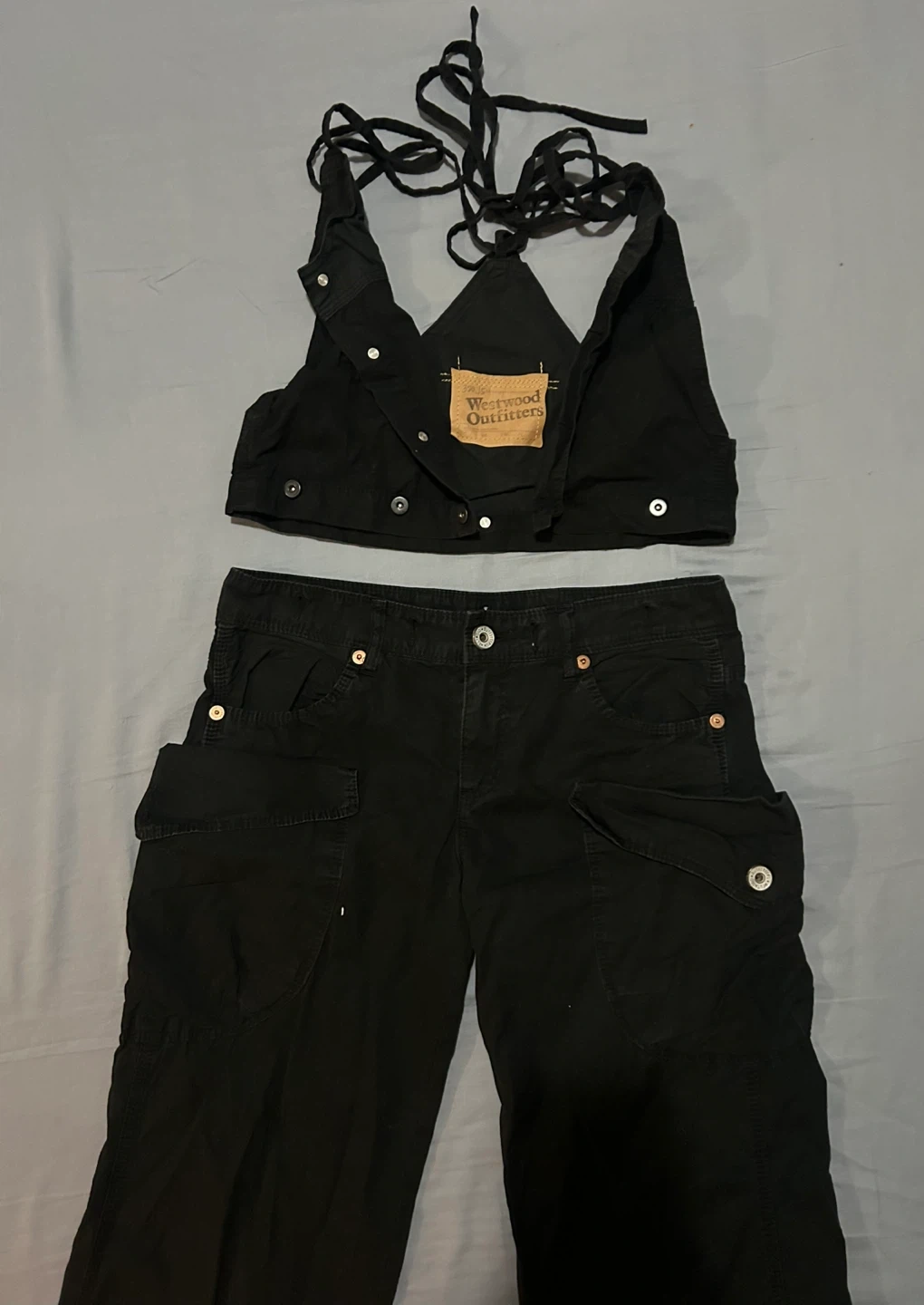 This is a black overall cargo pants from Westwood Outfitters. The pants have multiple pockets and a missing button but doesnt affect its fuction. It's a stylish and versatile outfit. Size L