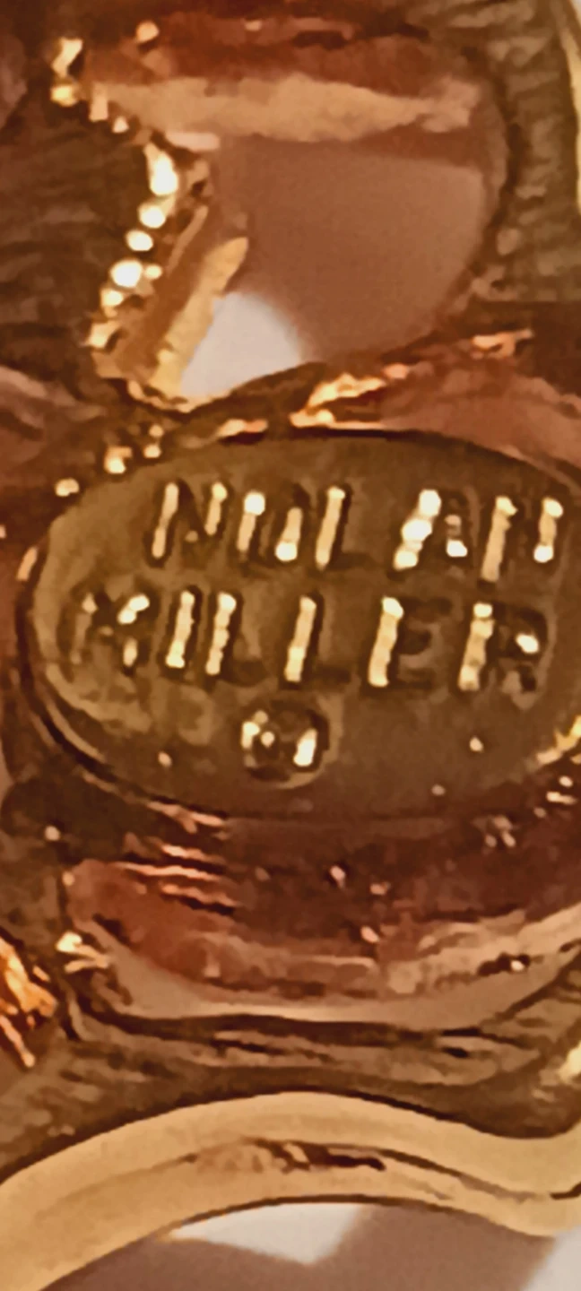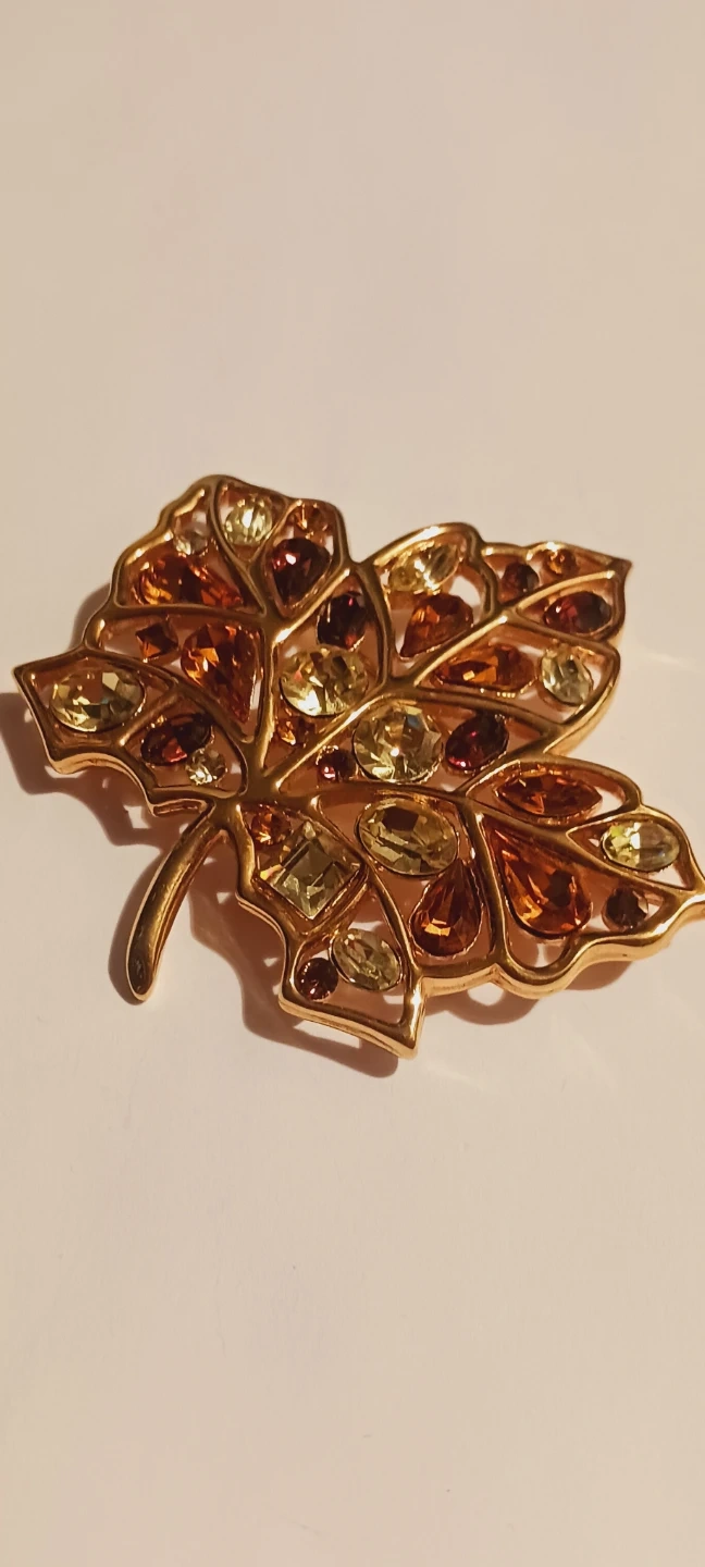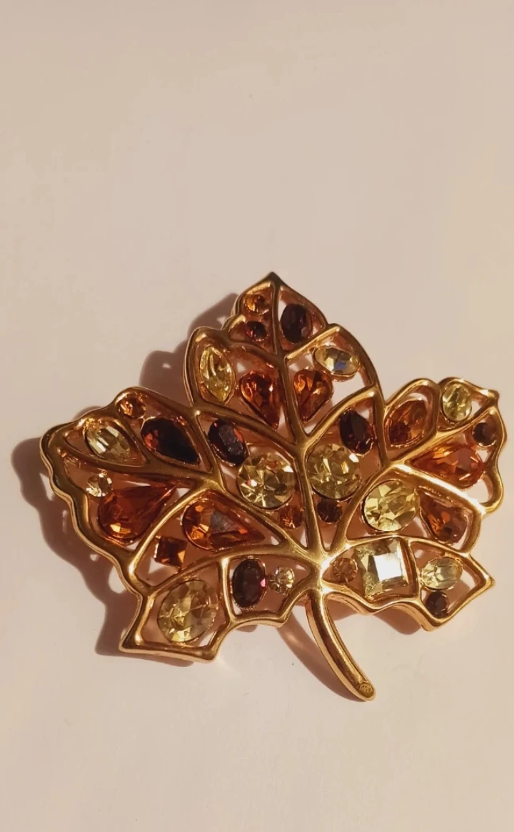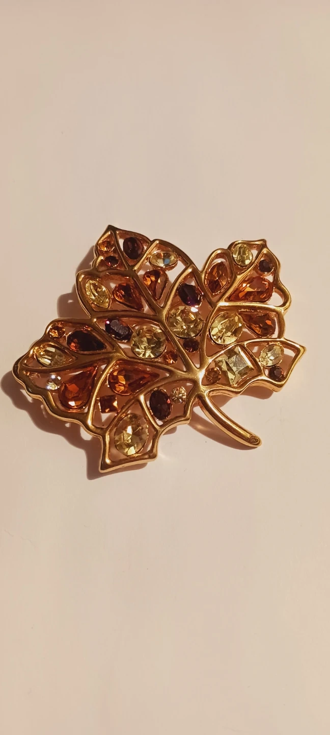 This NOLAN MILLER brooch is designed as a detailed autumn leaf, featuring a gold-tone metal frame. It's embellished with a mix of amber, citrine, and deep red-colored crystals. The piece secures with a pin backing, ready to add a touch of seasonal sparkle to any outfit! Excellent condition, like new. 2.5"×2.5". ALL MY PRICES ARE NEGOTIABLE !!