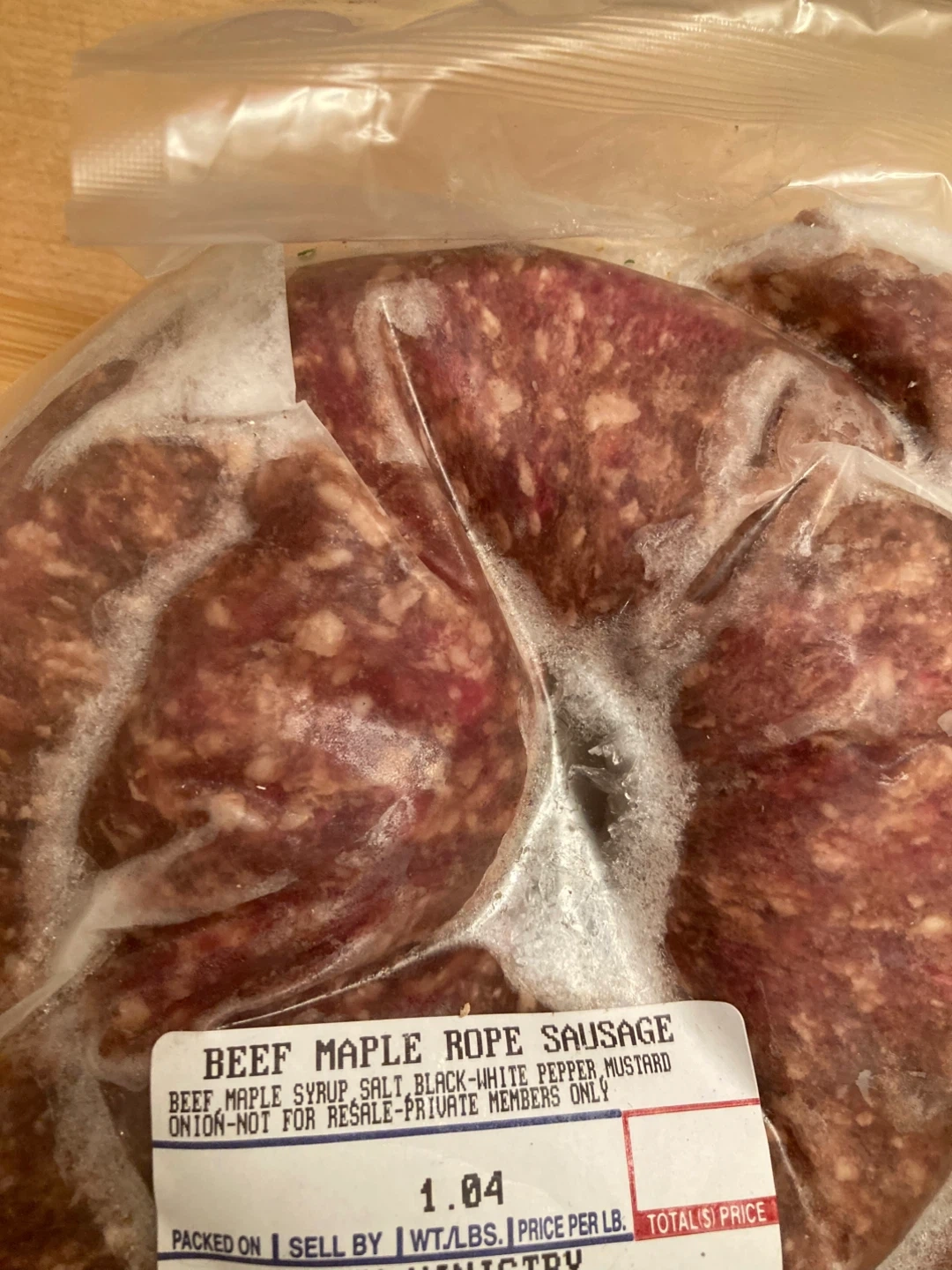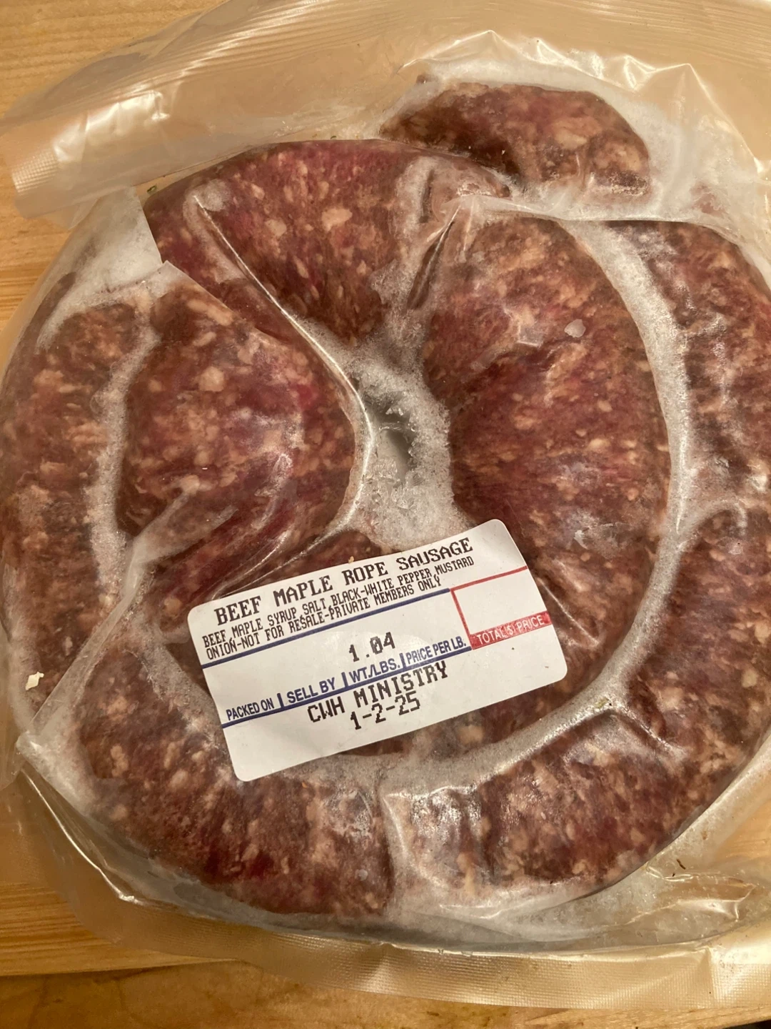 Grass fed Amish Beef Maple Rope Sausage. Ingredients include beef, maple syrup, salt, black-white pepper, mustard, and onion. It's great for grilling or cooking. Frozen.