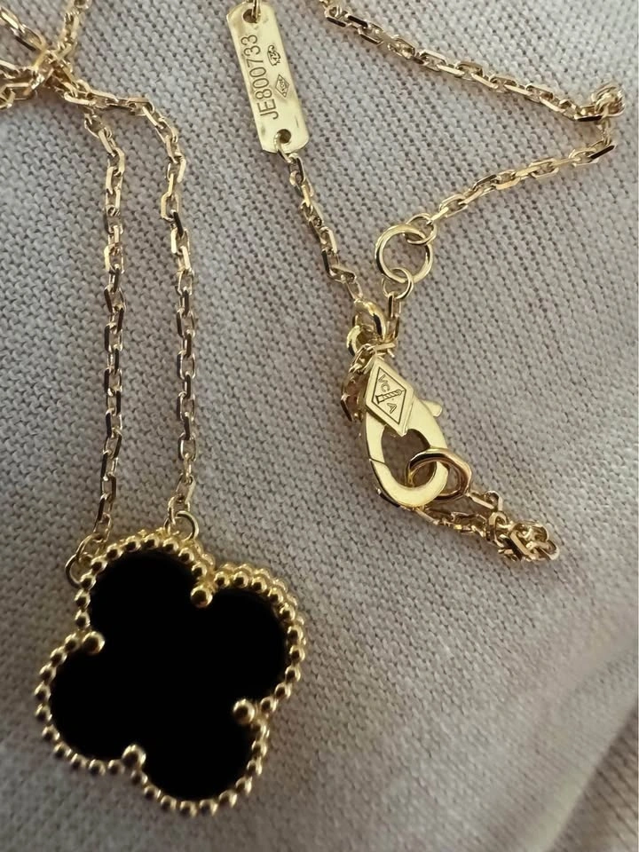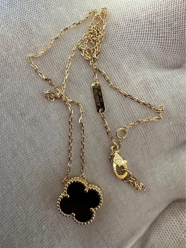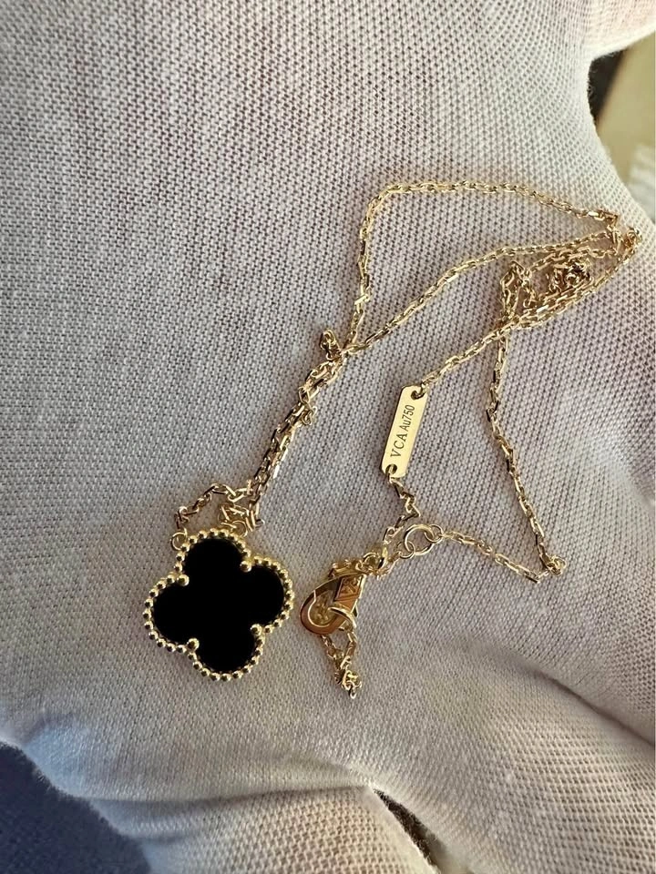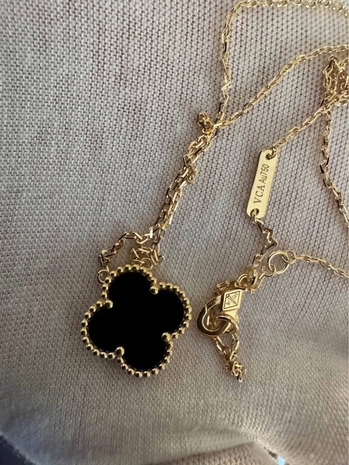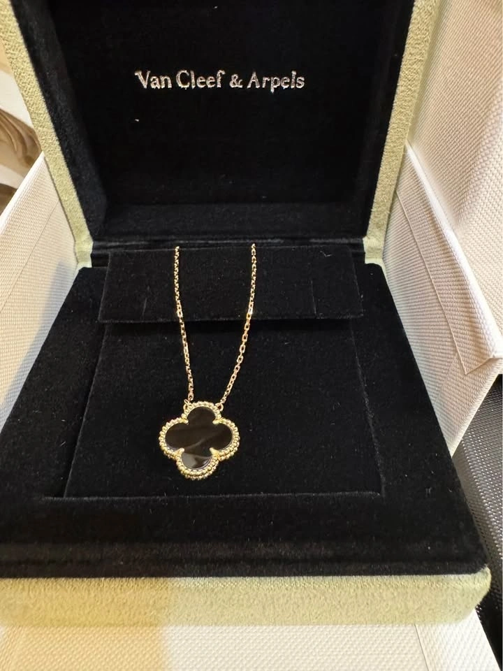 Van Cleef VCA SOLID 18k yellow gold with Black Onyx pendant. Chain is around 16.5 inches. Pendant is 15 mm. Comes with box, shopping bag, and card.
