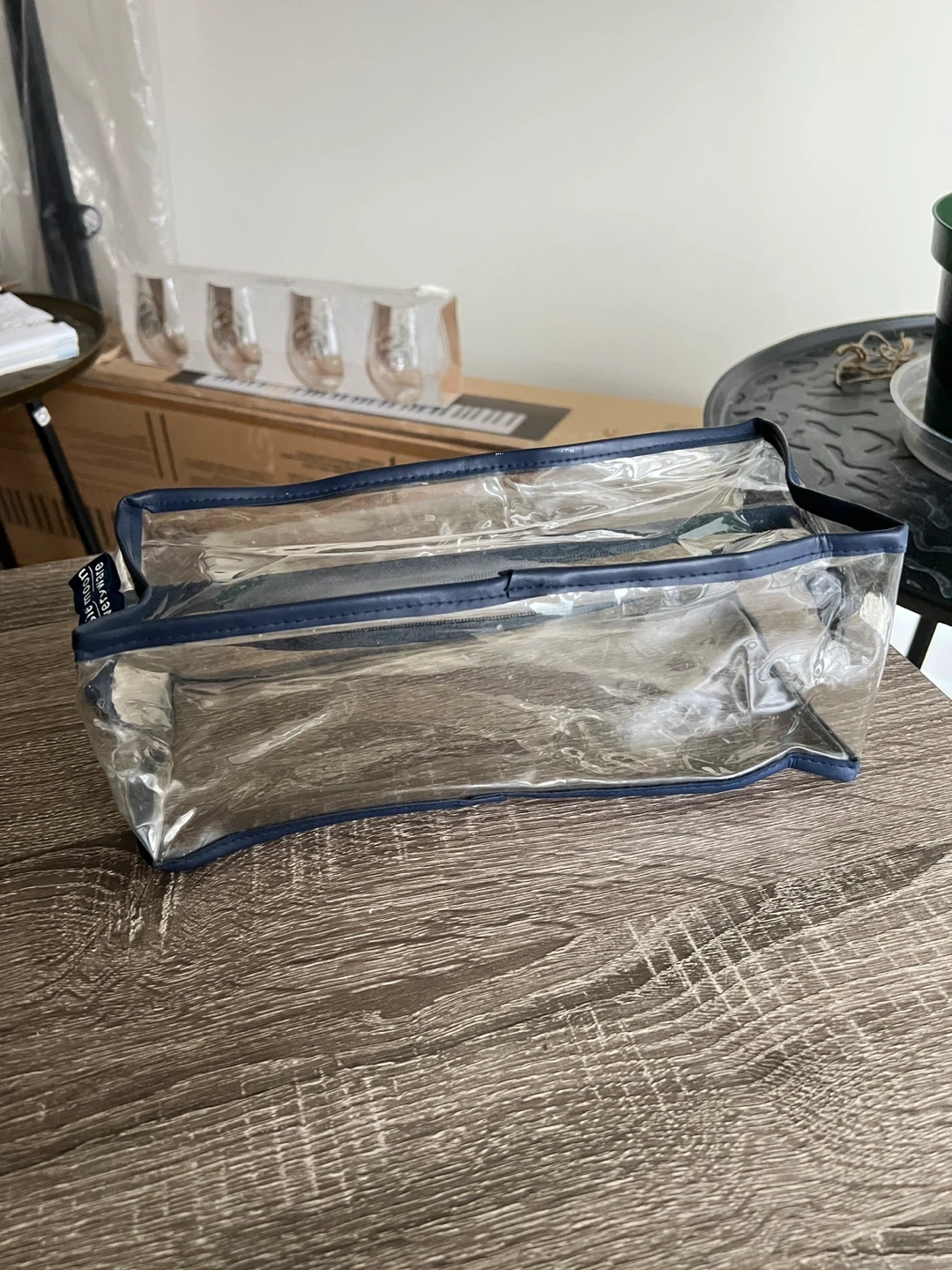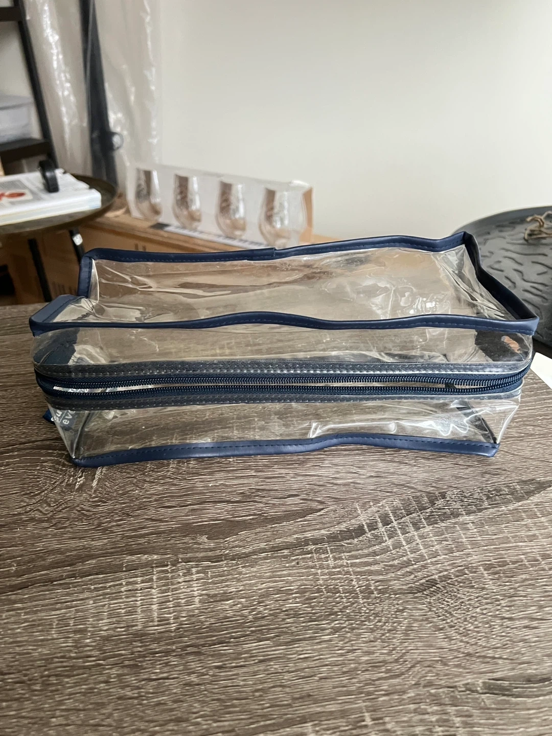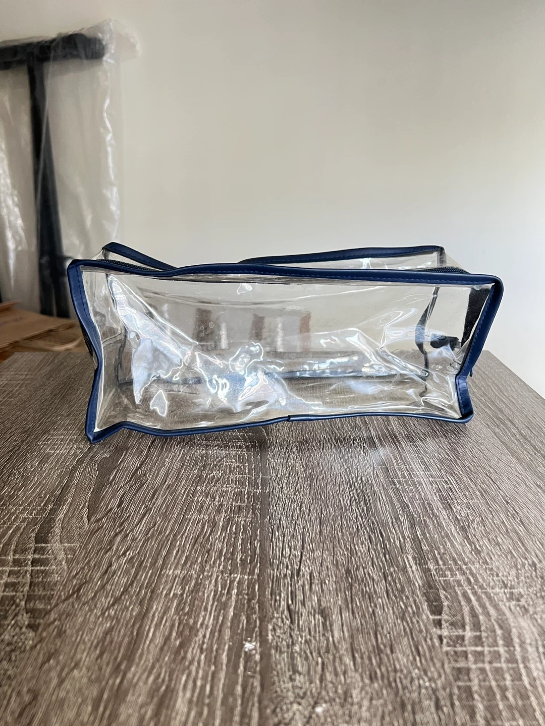 Clear plastic toiletries bag with navy trim. Measures 11W x 4.5D x 5H inches. Easy to clean. I rinsed it under running water. You can scrub it with soap and water since it’s made of plastic.