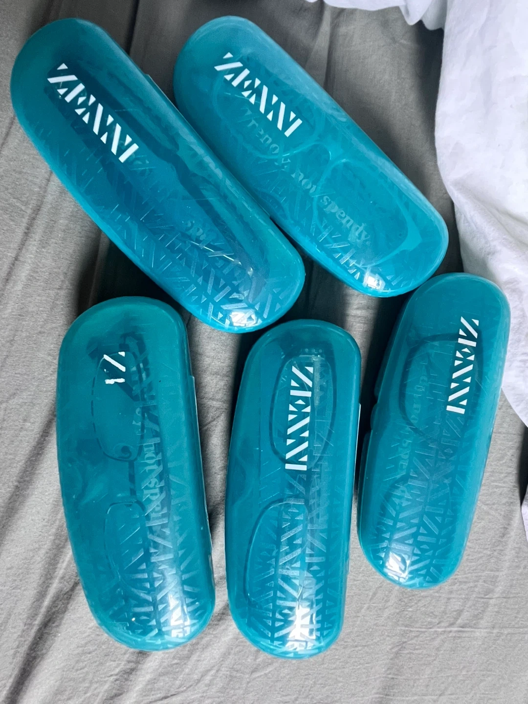 Get a set of five teal Zenni glasses cases with eye glasses. These hard cases offer protection for your eyewear. They're made of durable plastic.