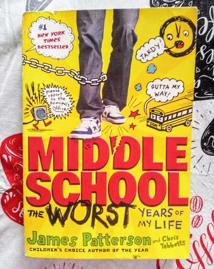 This is the "Middle School: The Worst Years of My Life" book by James Patterson and Chris Tebbetts. It's a #1 New York Times bestseller. The book is written for kids and is about the struggles of middle school life.