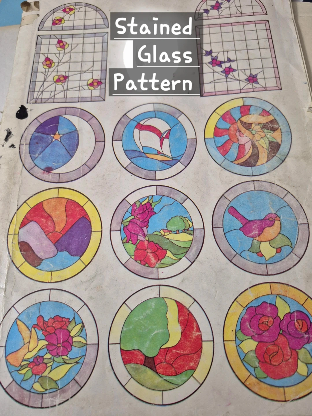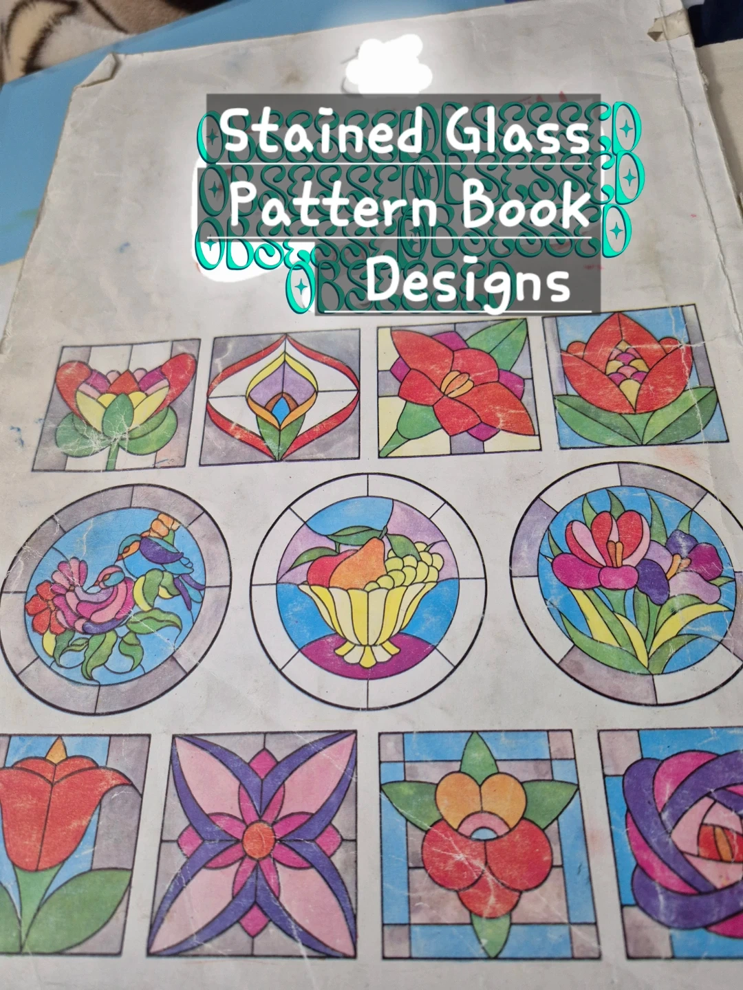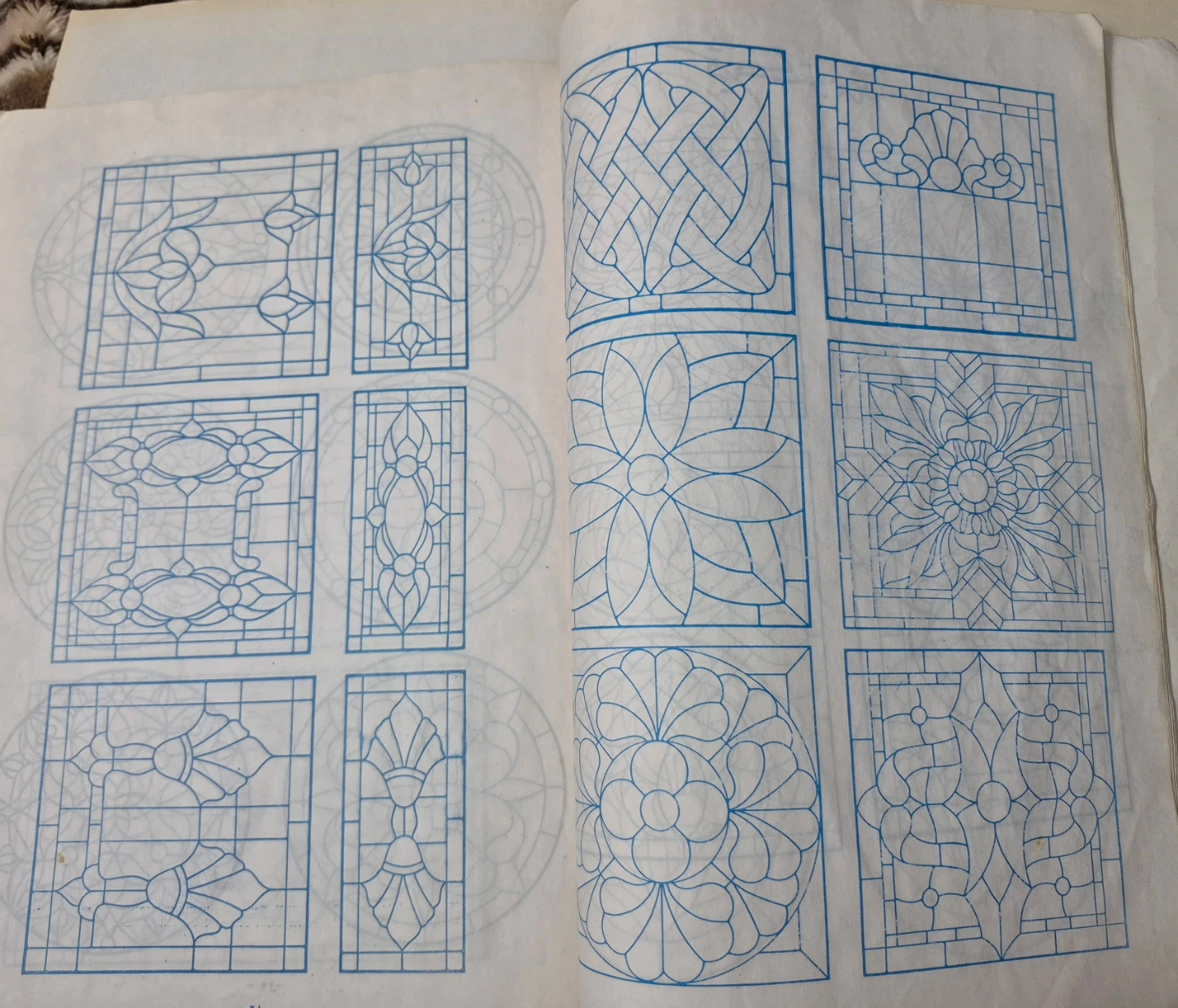 This is a stained glass pattern book featuring various designs. It includes circular and rectangular patterns of flowers, birds, and geometric shapes. The patterns are printed in blue outline.