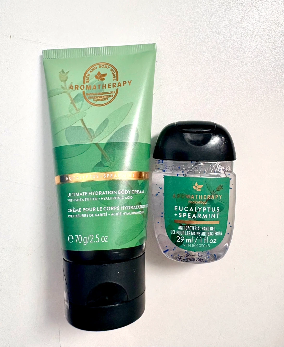 Bath & Body Works Aromatherapy Ultimate Hydration Body Cream in Eucalyptus + Spearmint. It's 70g / 2.5 oz. Also includes an Aromatherapy Eucalyptus + Spearmint Anti-Bacterial Hand Gel, 29 ml / 1 fl oz.