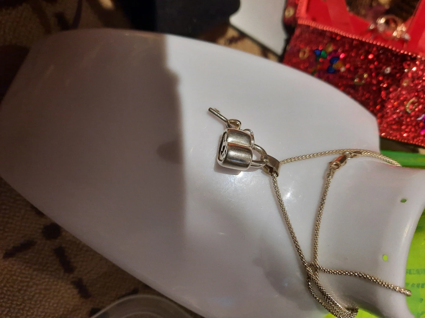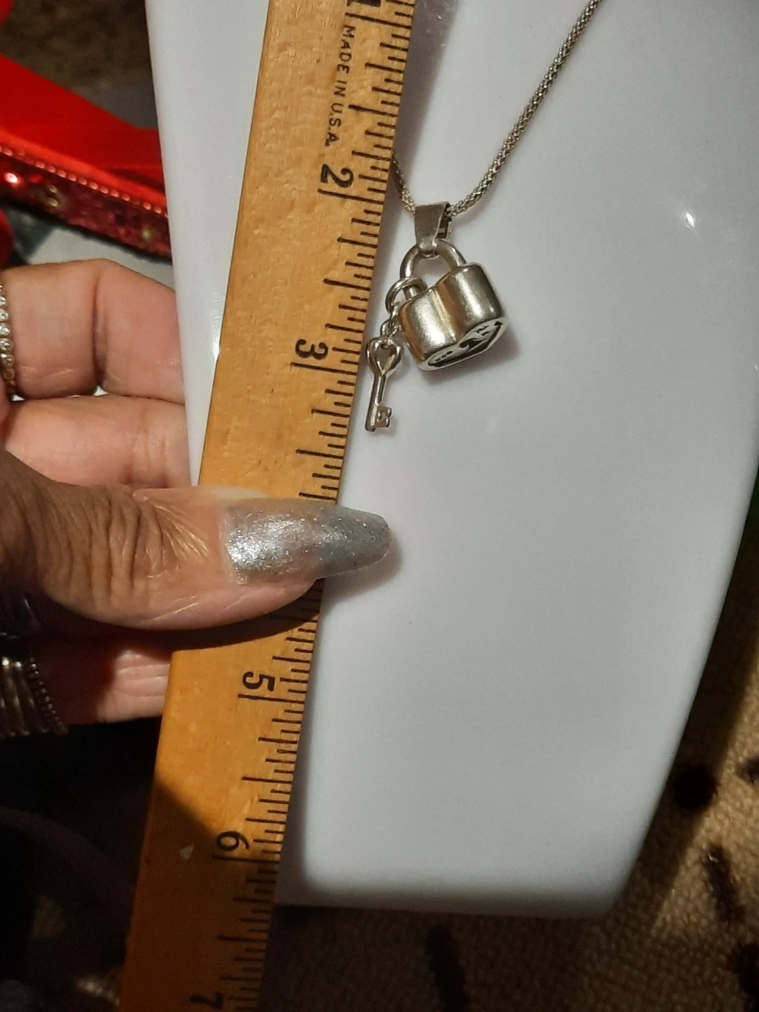 A lovely hefty chunky sterling silver pendant necklace featuring a lock and key design. The pendant is made of sterling silver, hallmarked '925'. It weighs 4 grams.