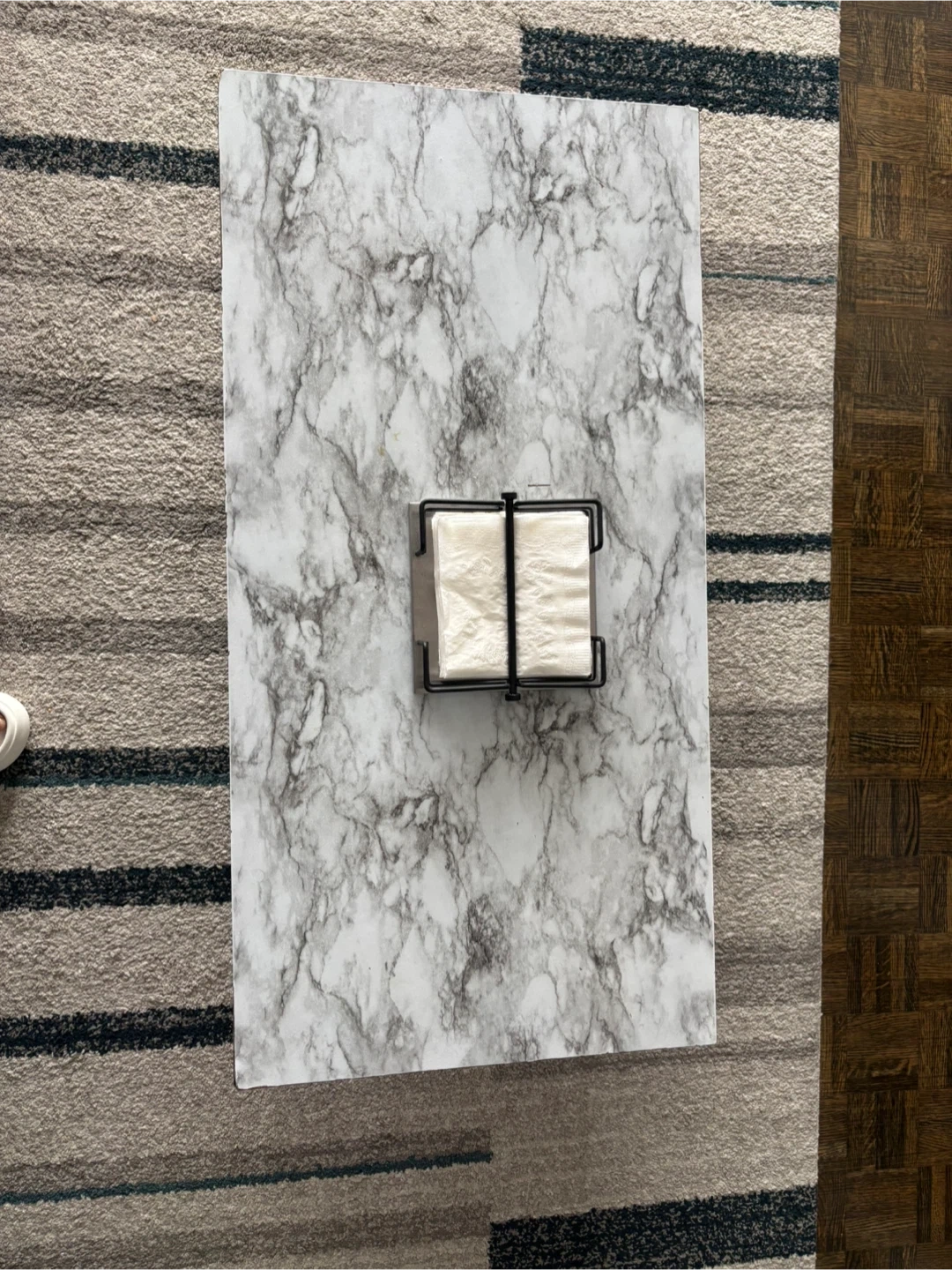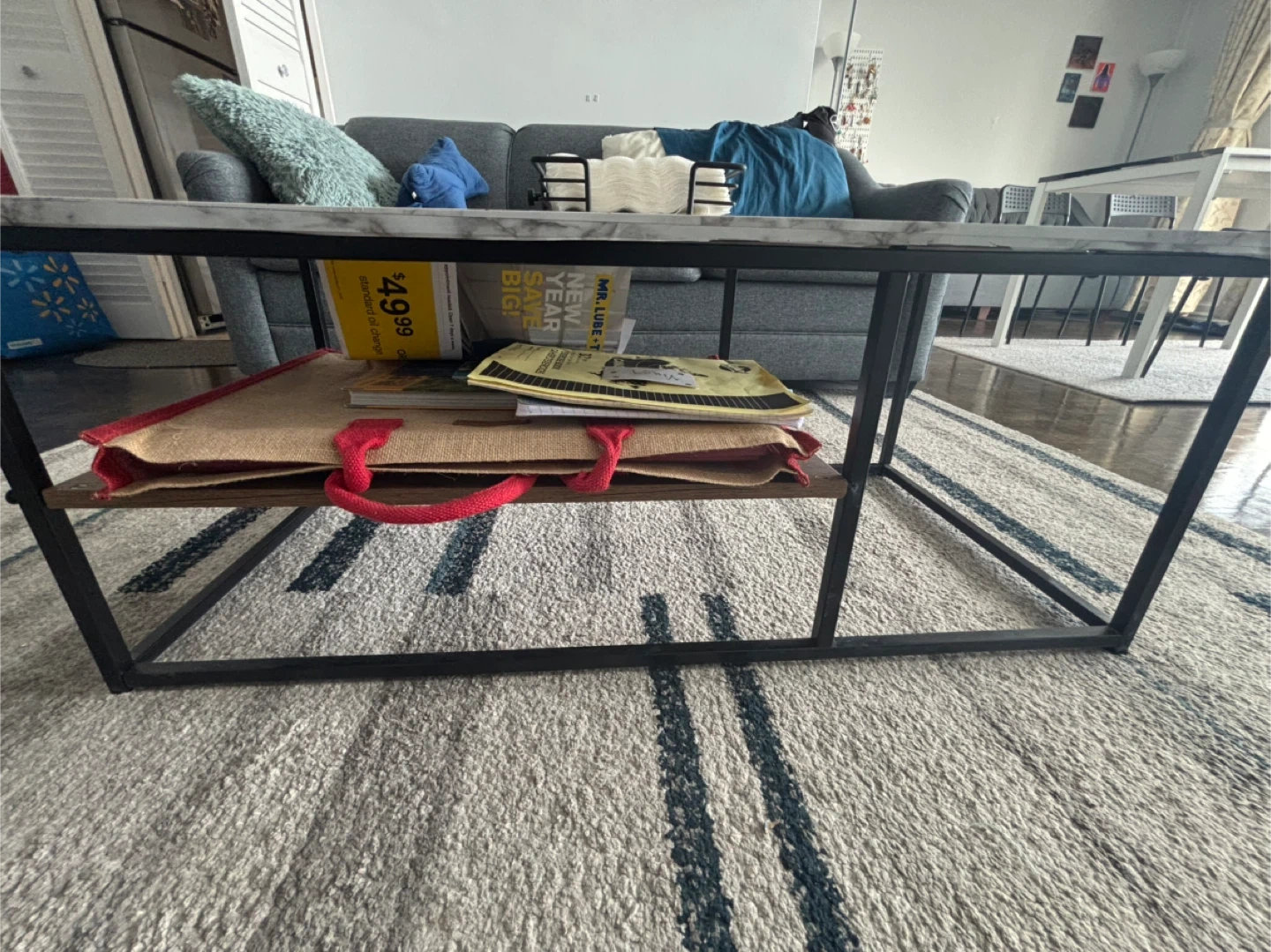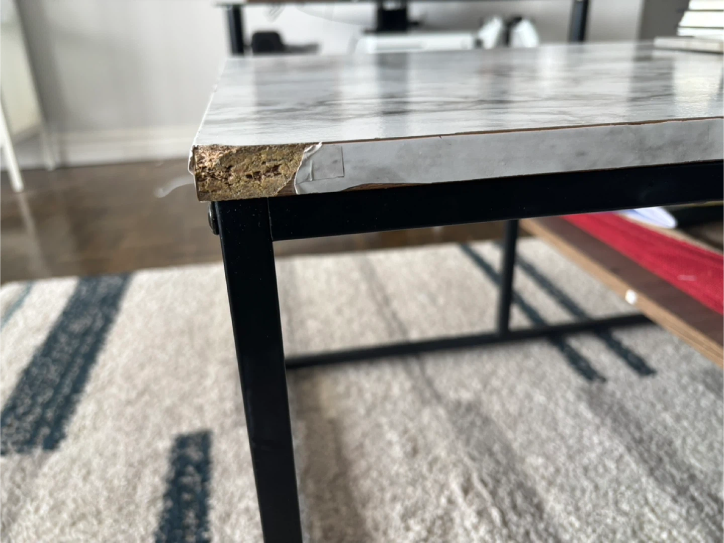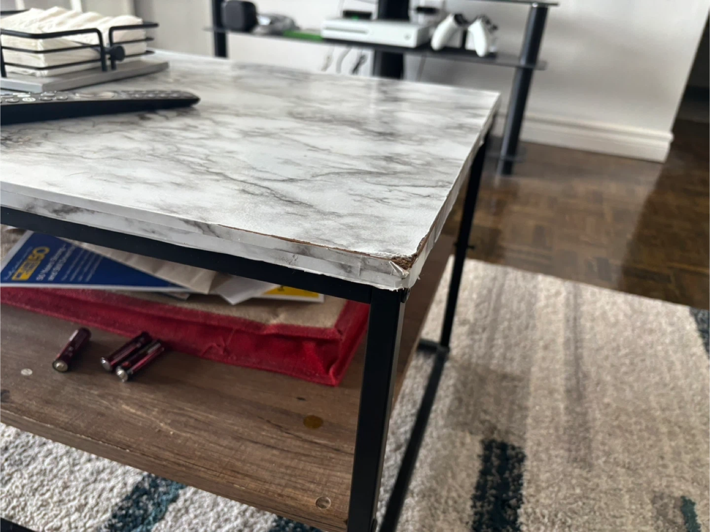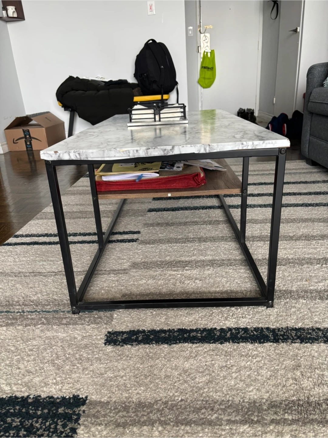 Rectangular coffee table featuring a marble-patterned top (it’s a wallpaper, not actually marble top-original top is wooden) and a wooden shelf for storage. It's a stylish addition to your living room. Black metal frame.