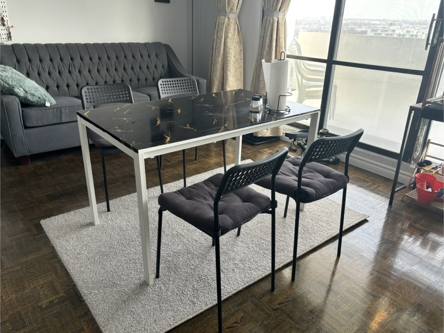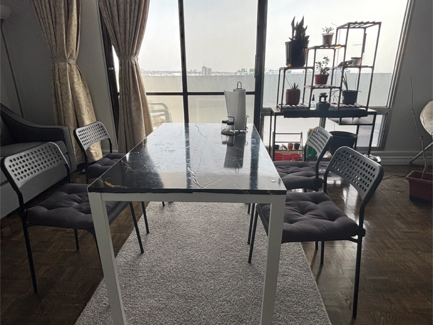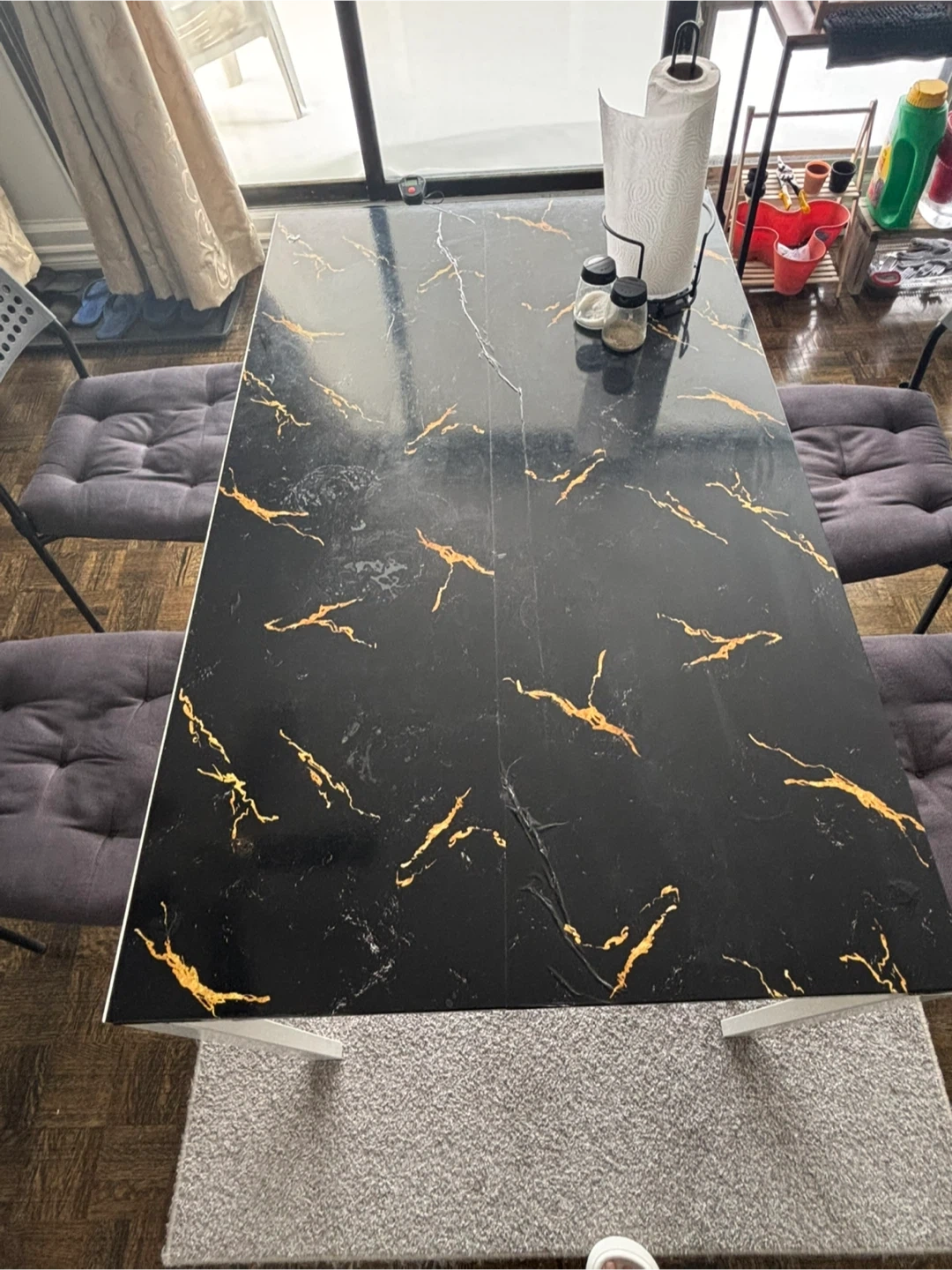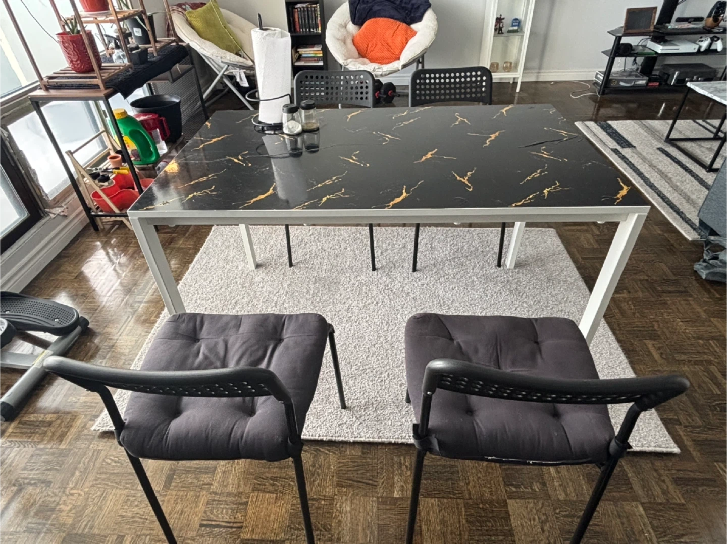 A sleek dining table with a black marble-look top and gold veining (it is a wallpaper, not original marble-top- original top is basic white). It has a sturdy white metal frame. Perfect for smaller dining spaces! Non smoking/ pet free home.