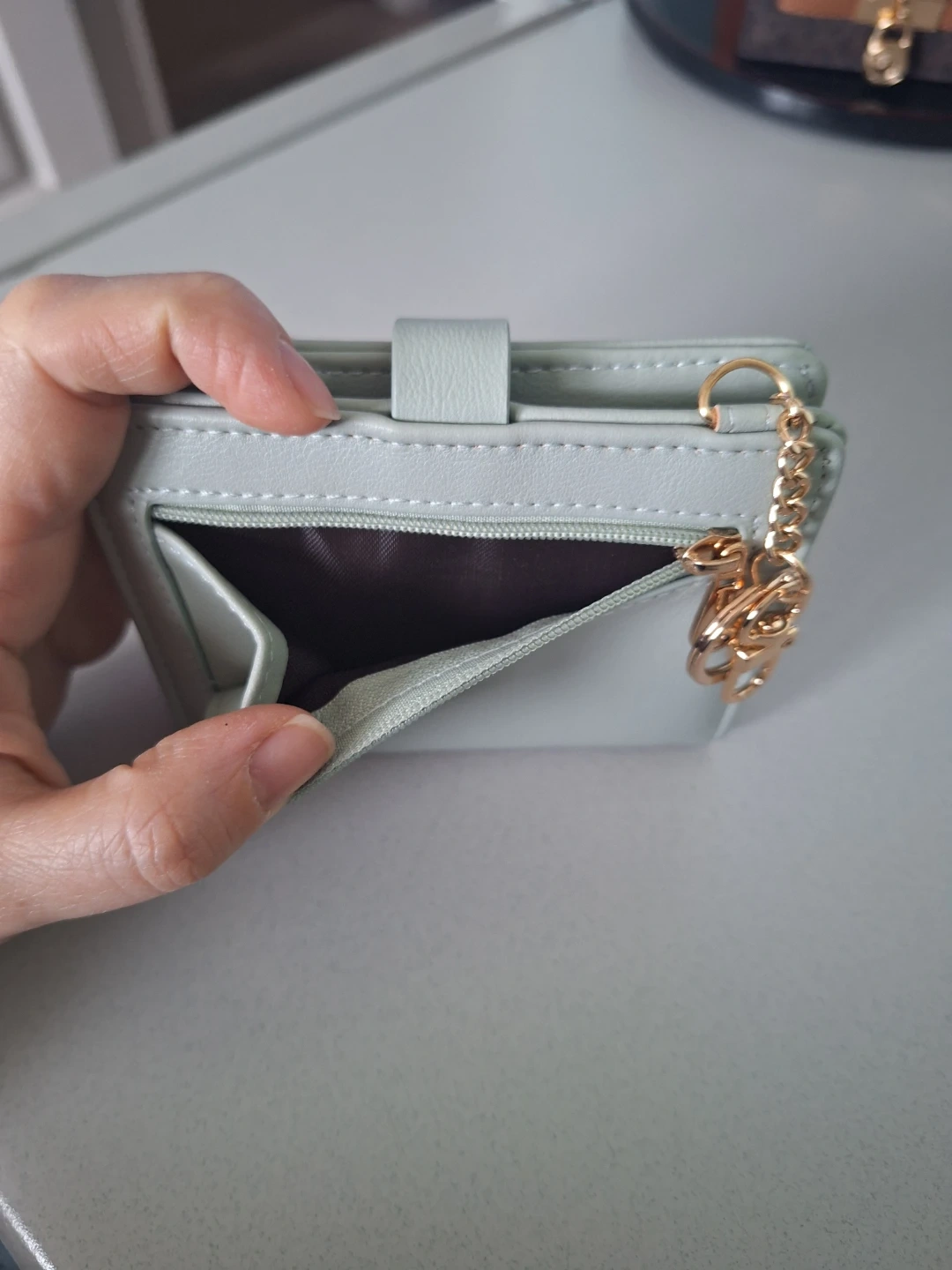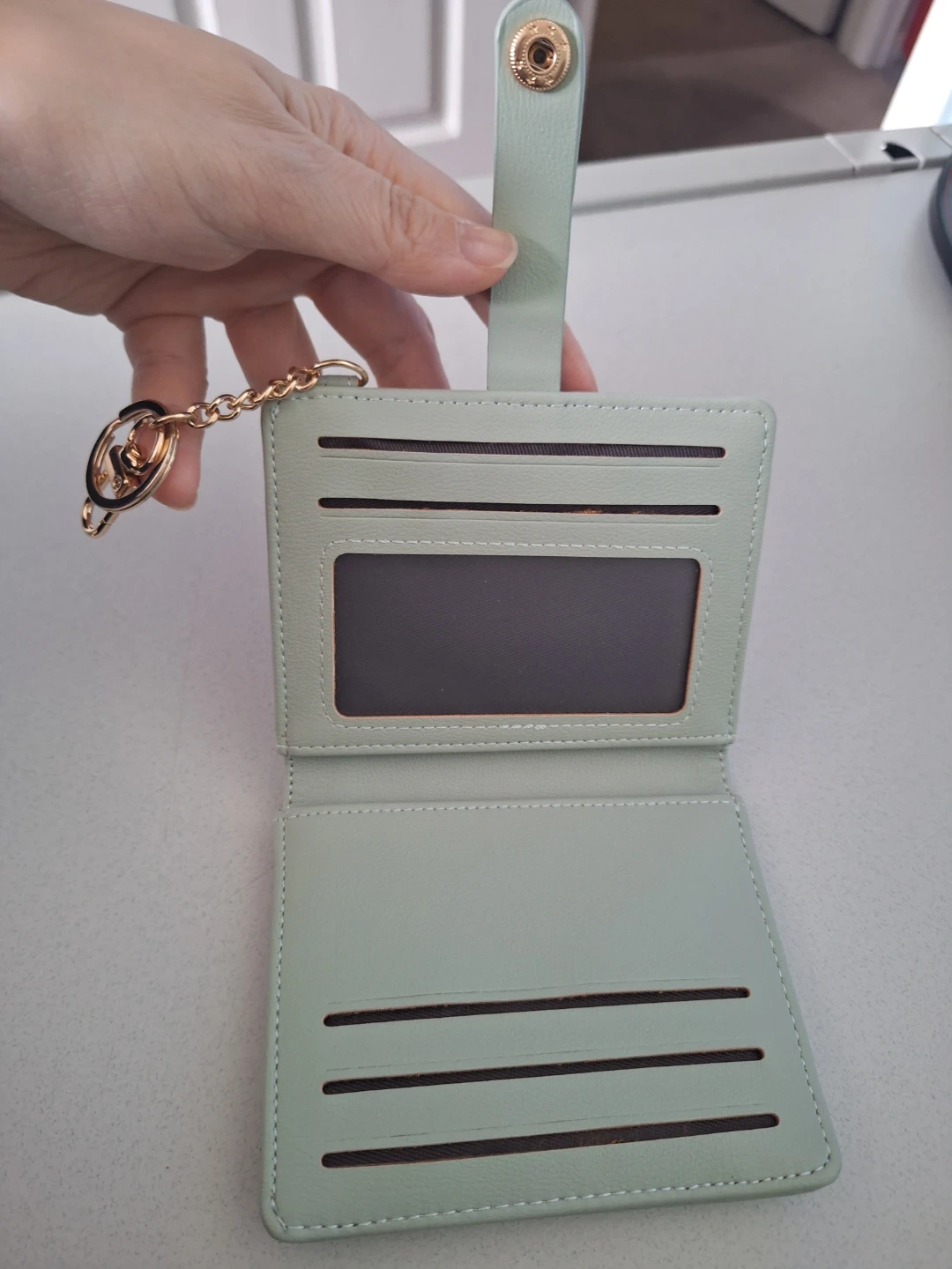 A slim green bifold wallet with multiple card slots and a zippered coin pocket. It's attached to a gold-tone keychain. This wallet is great for carrying your essentials on the go!