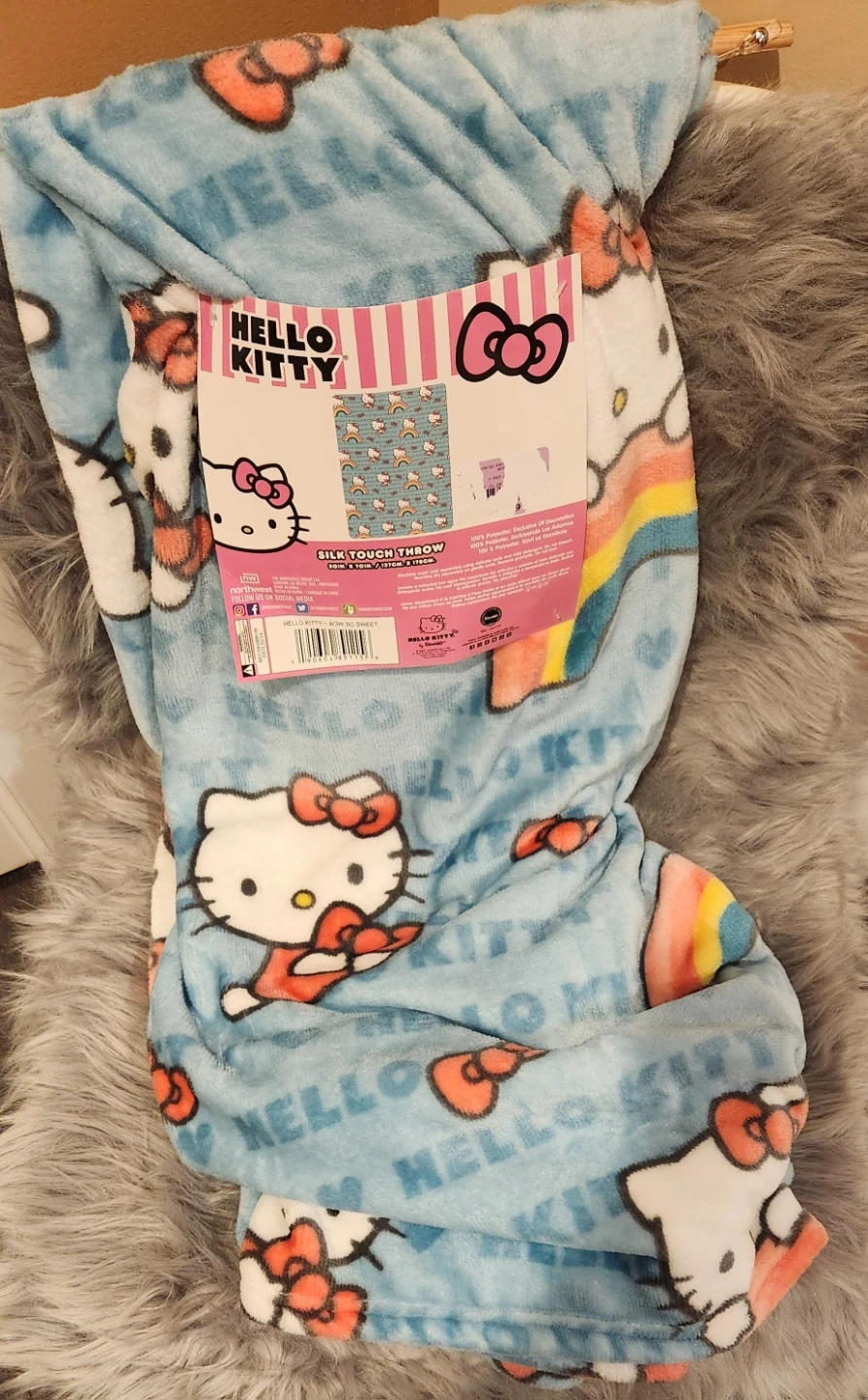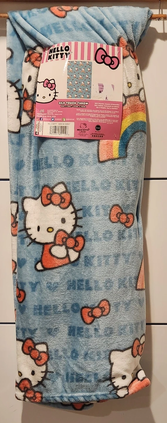 This Hello Kitty throw blanket features a fun all-over print with Hello Kitty characters and bows. It's made from a soft, silk touch material for comfort. Perfect for lounging or as an extra layer of warmth!
