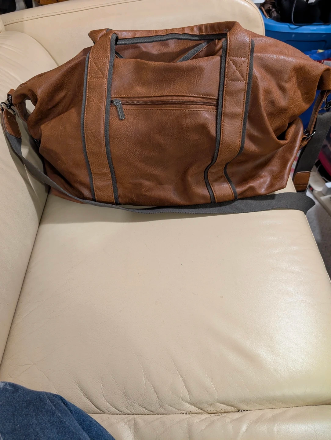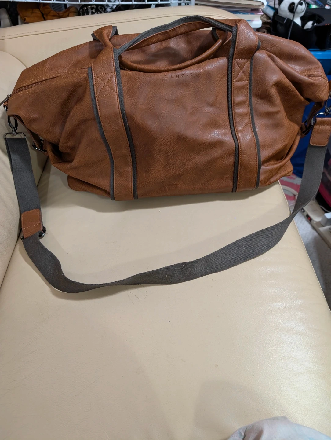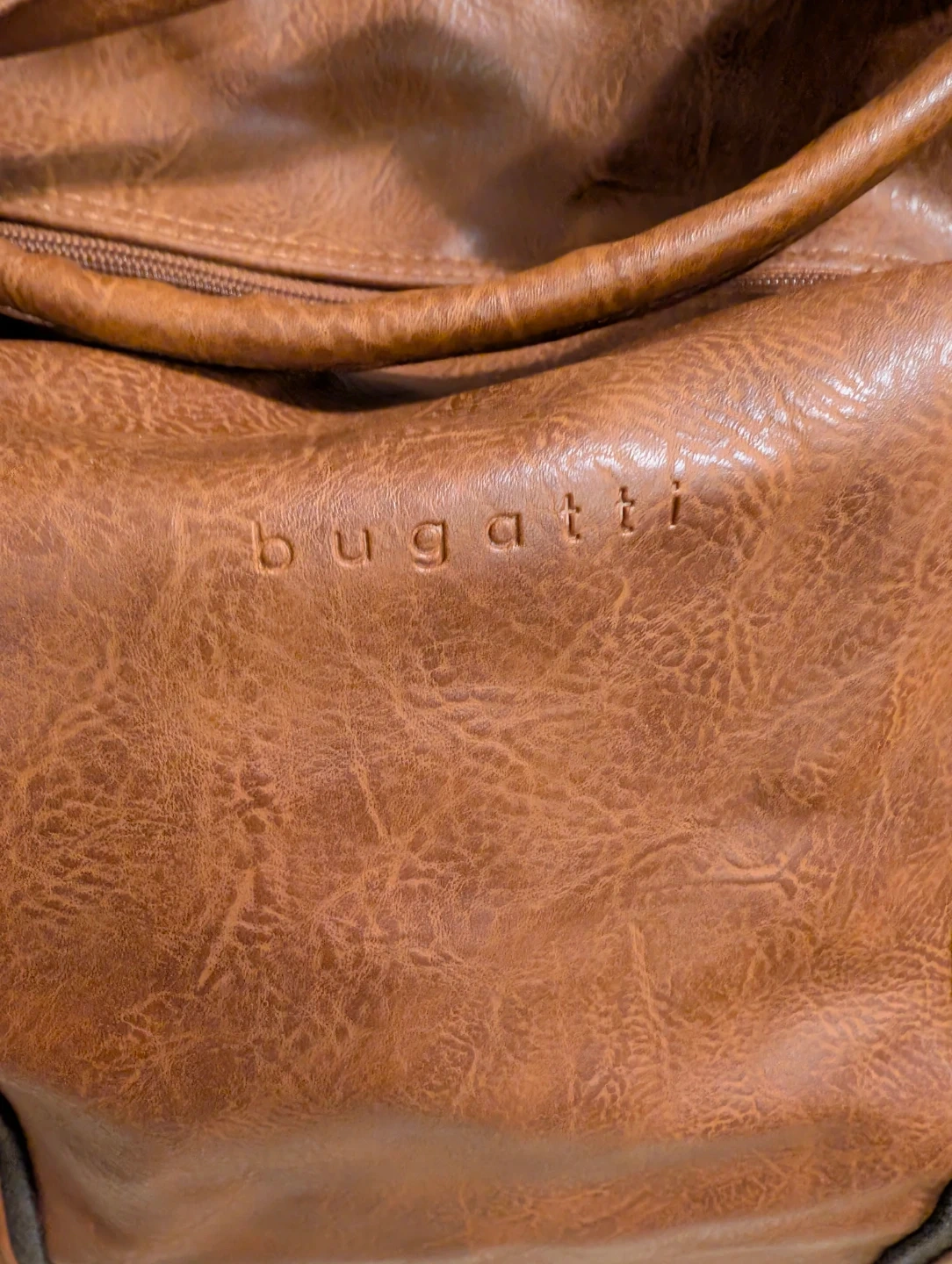 This Bugatti weekender bag is made from a brown vegan leather material. It's a stylish option for weekend trips. The bag includes a detachable shoulder strap.