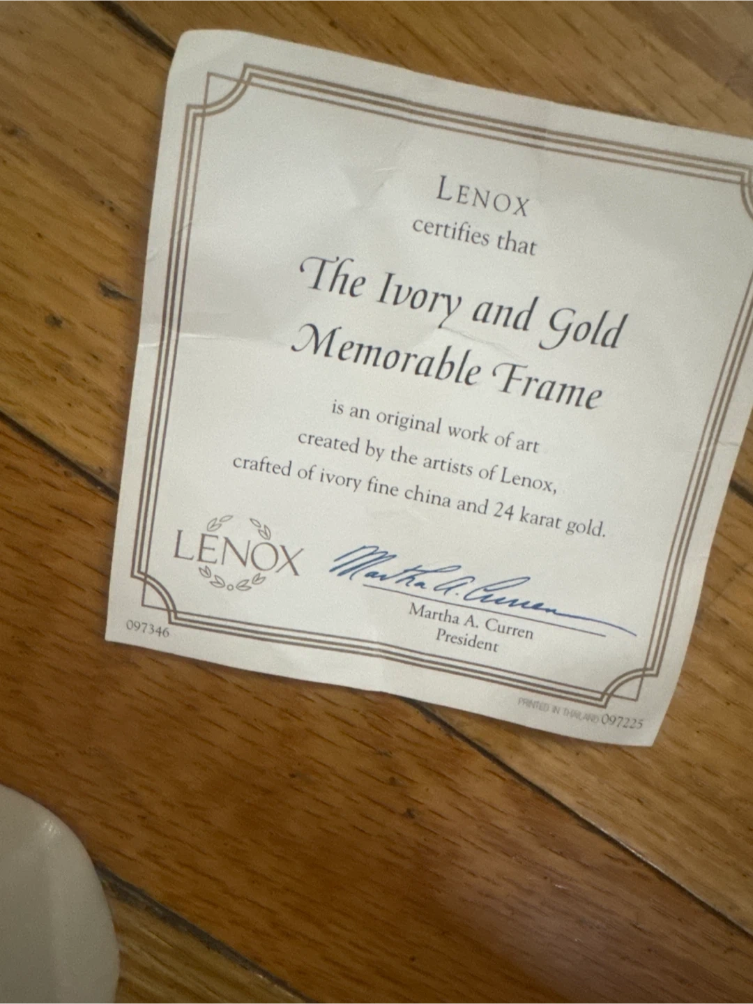 Lenox certifies this The Ivory and Gold Memorable Frame. It's an original work of art crafted from ivory fine china and 24 karat gold. This frame would make a lovely addition to any home decor.