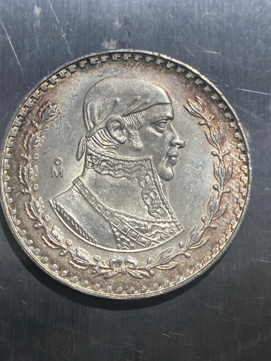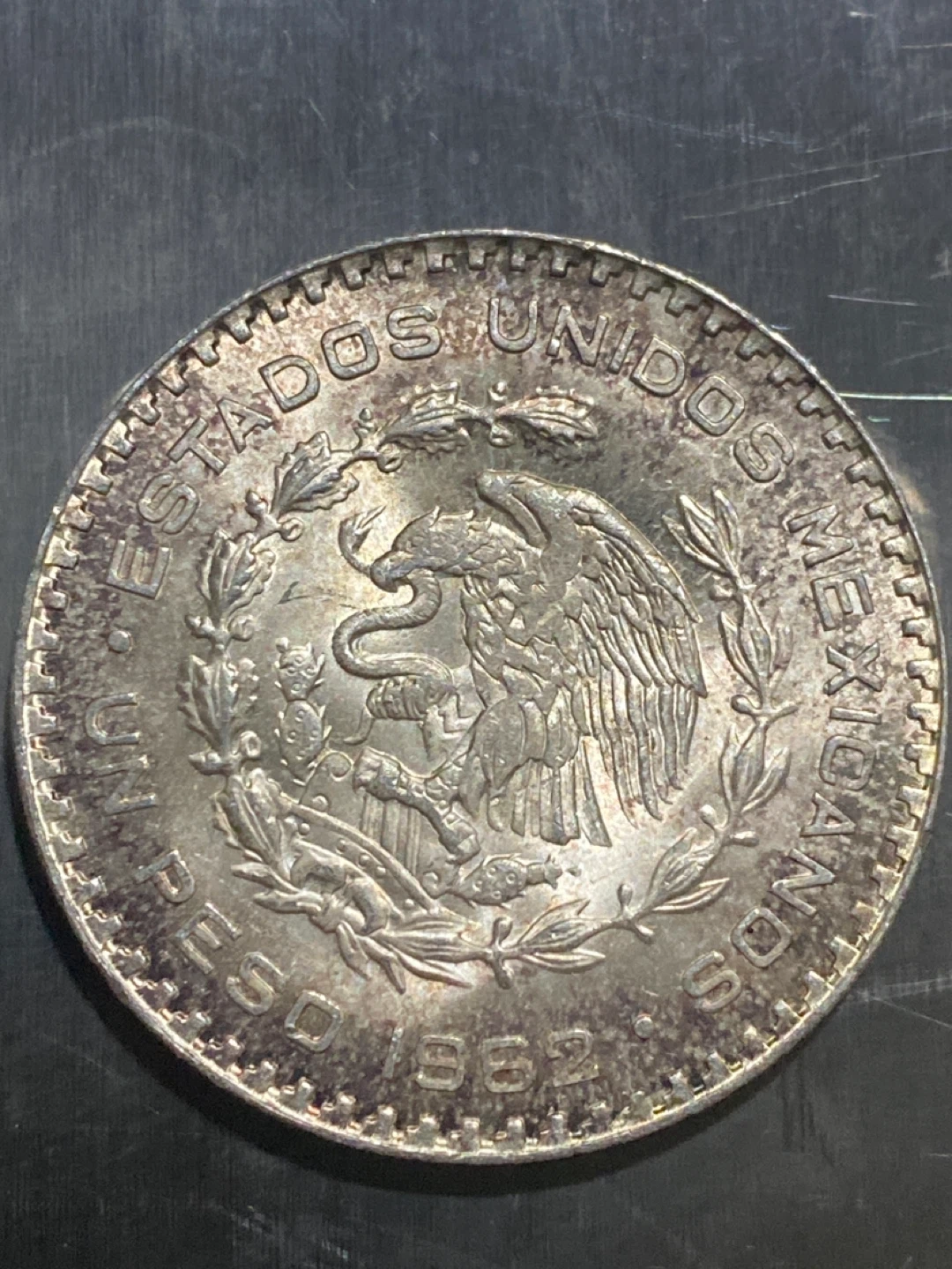 This is a 1982 Mexican silver 5Pesos coin. It weighs 16 grams. This coin features the Mexican coat of arms on one side and a portrait of Miguel Hidalgo on the other. It's a piece of Mexican history!