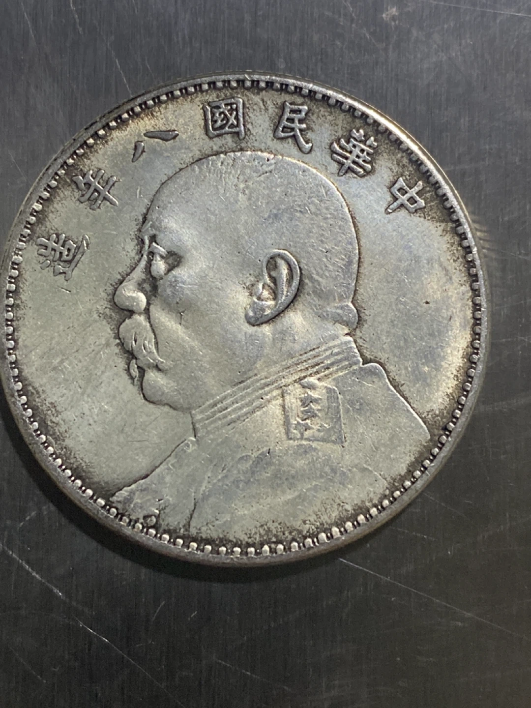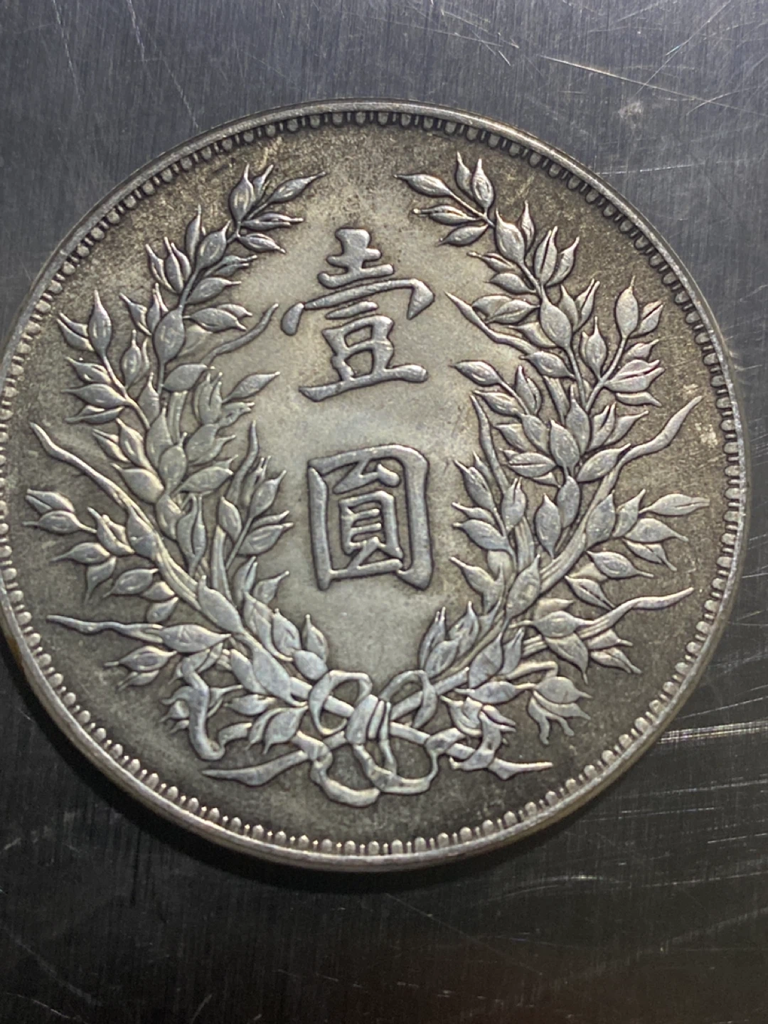 A Republic of China silver coin featuring Yuan Shikai. This coin weighs approximately 26.8 grams It's a collectible piece for numismatists. This coin would be of interest to collectors of historical currency.