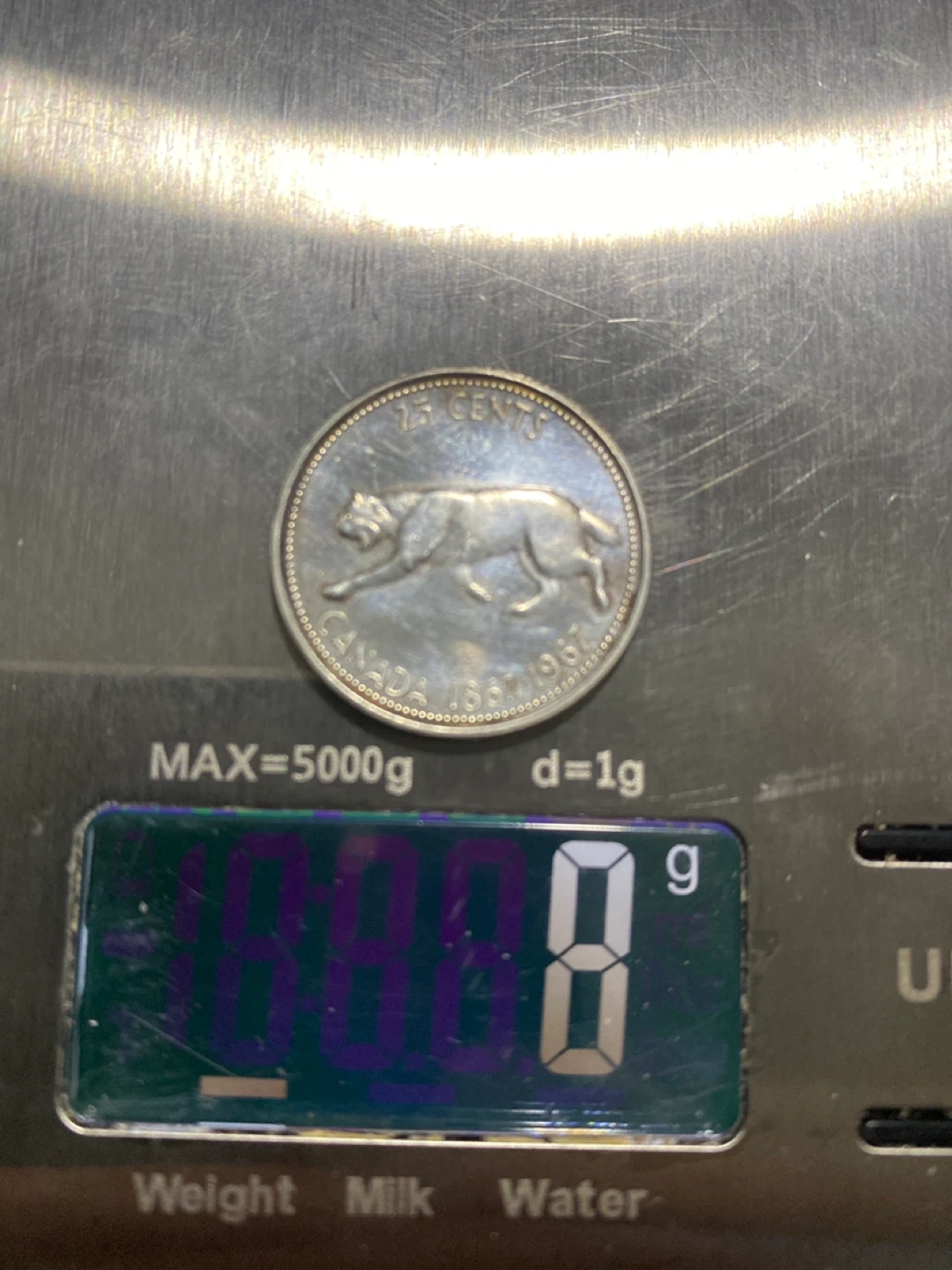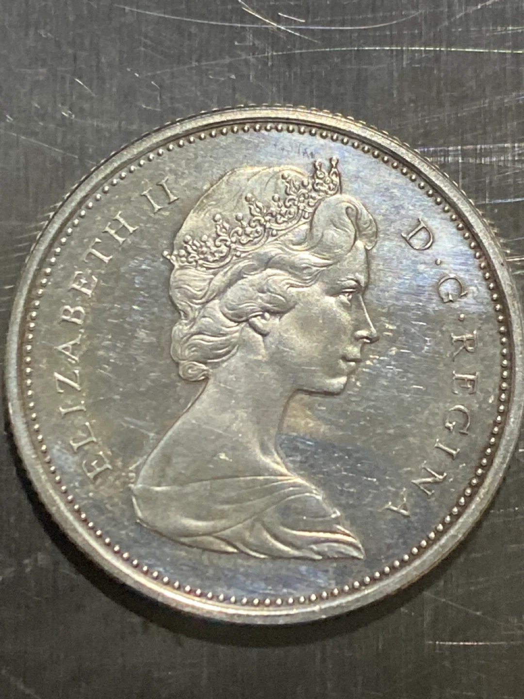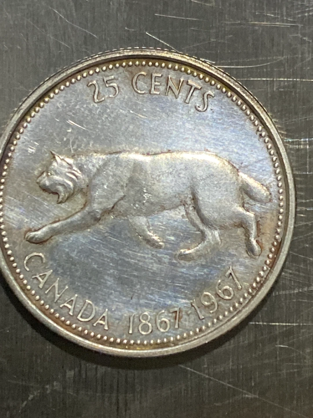 This is a Canadian 25 cent silver quarter from 1967, commemorating Canada's centennial. It features Elizabeth II on one side and a running wolf on the other. The coin is made of silver. This quarter would be a nice addition for any coin collector.