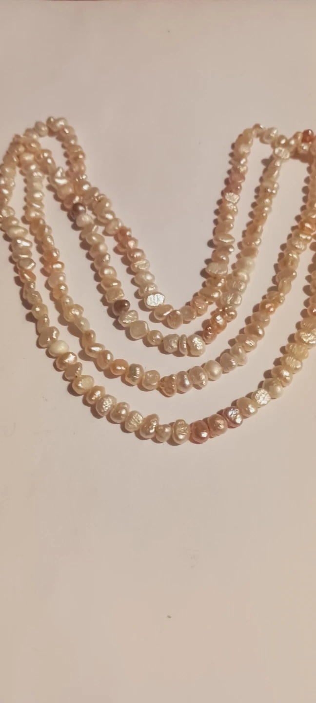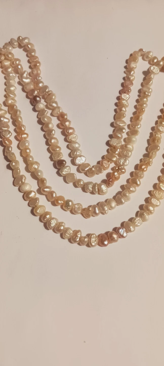 Genuine Freshwater Pearl Necklace. It's a beautiful accessory with a natural, organic look. The pearls showcase a mix of creamy white and subtle peachy-pink hues. This necklace adds a touch of elegance to any outfit! 34" long. Excellent condition. ALL MY PRICES ARE NEGOTIABLE !!