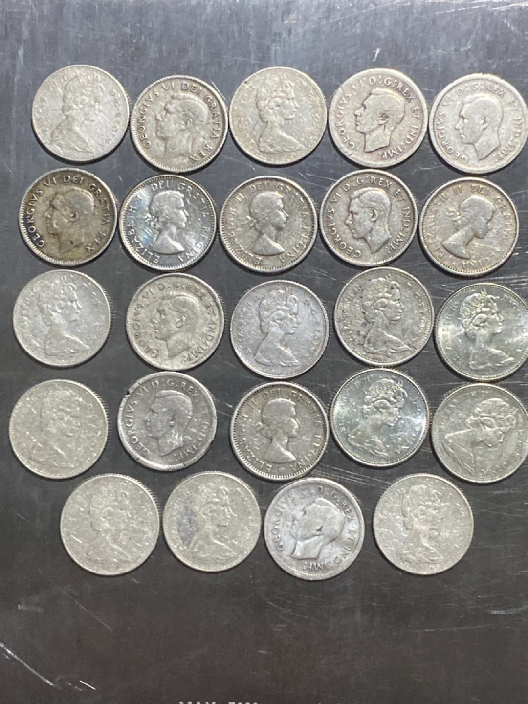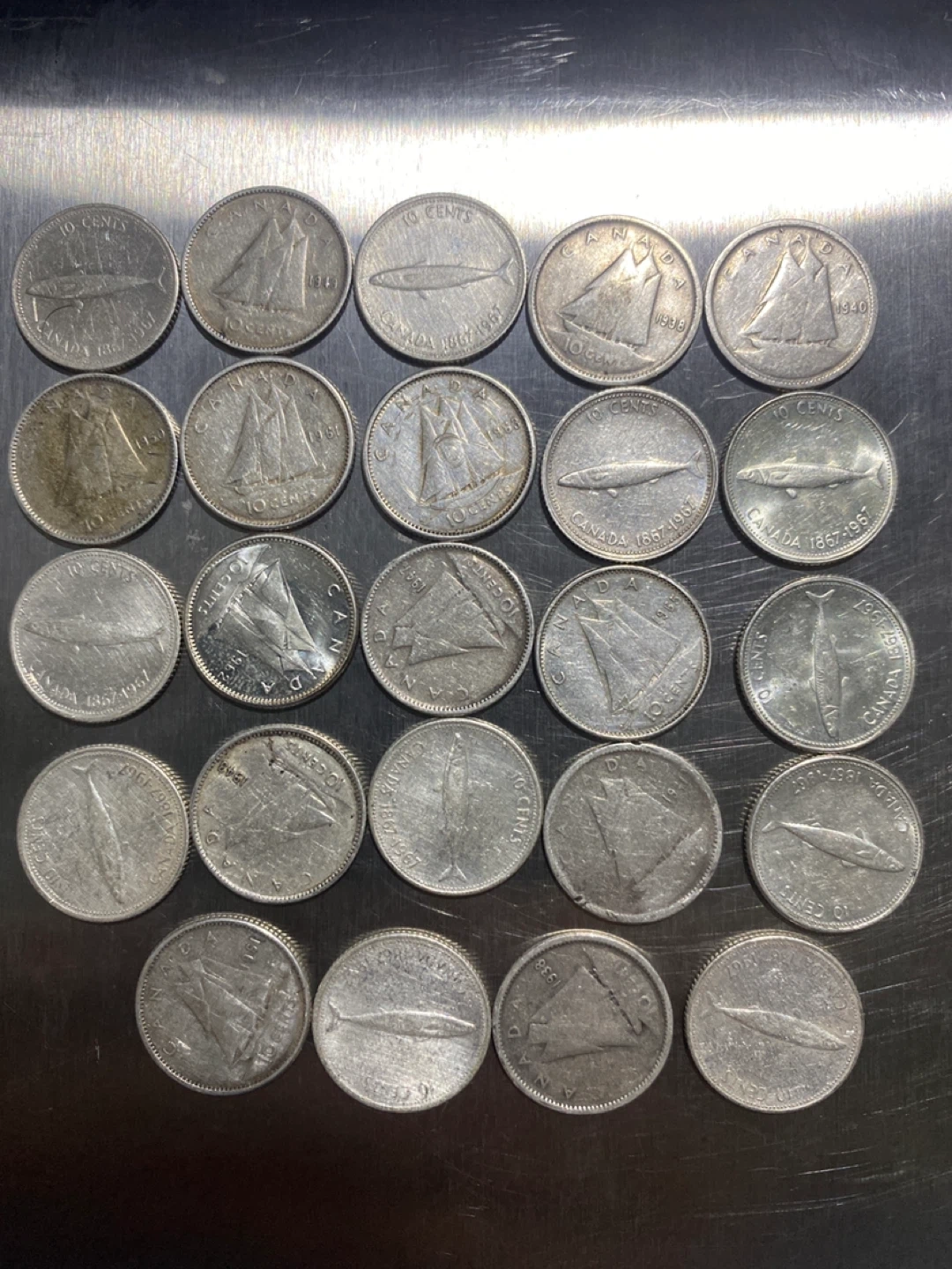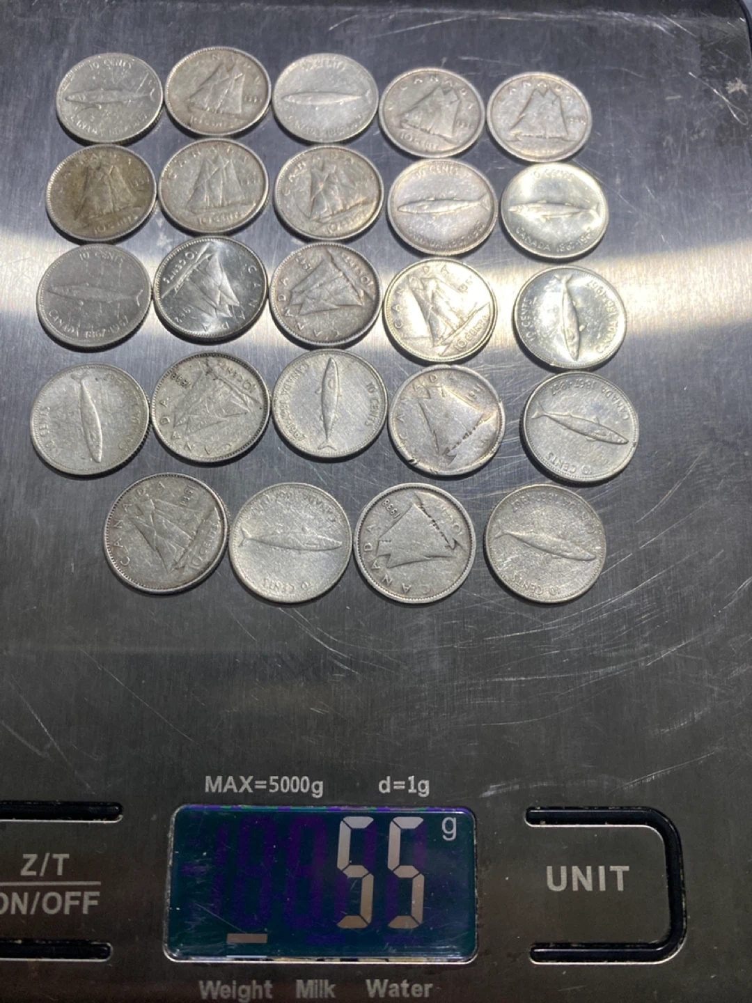 A collection of 24 pieces Canadian dimes, featuring various ship and monarch designs. These coins are a great addition for any collector interested in Canadian currency history. A weight of 55g is shown on the scale. The price per unit is $14.