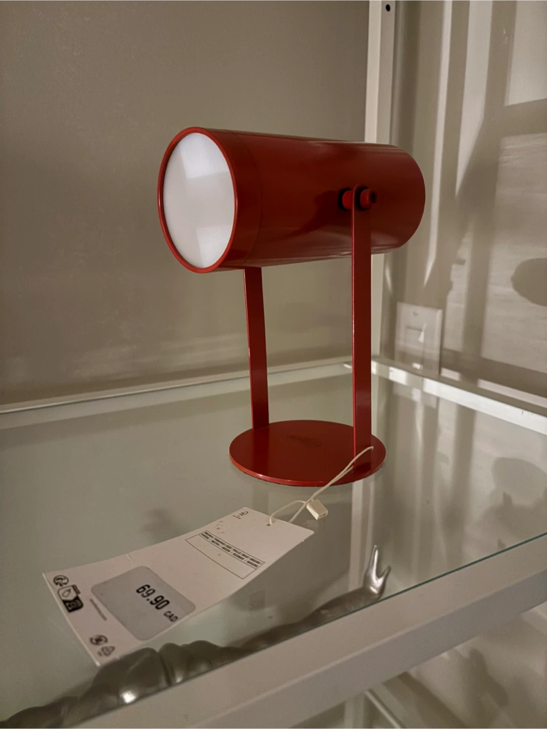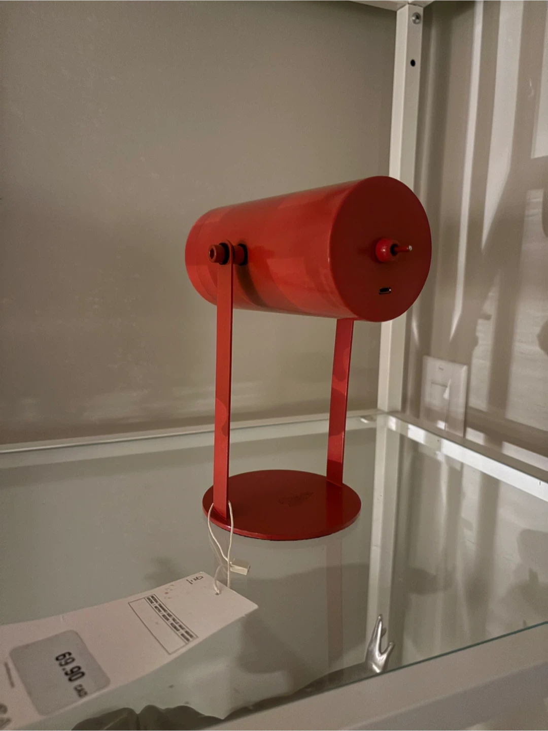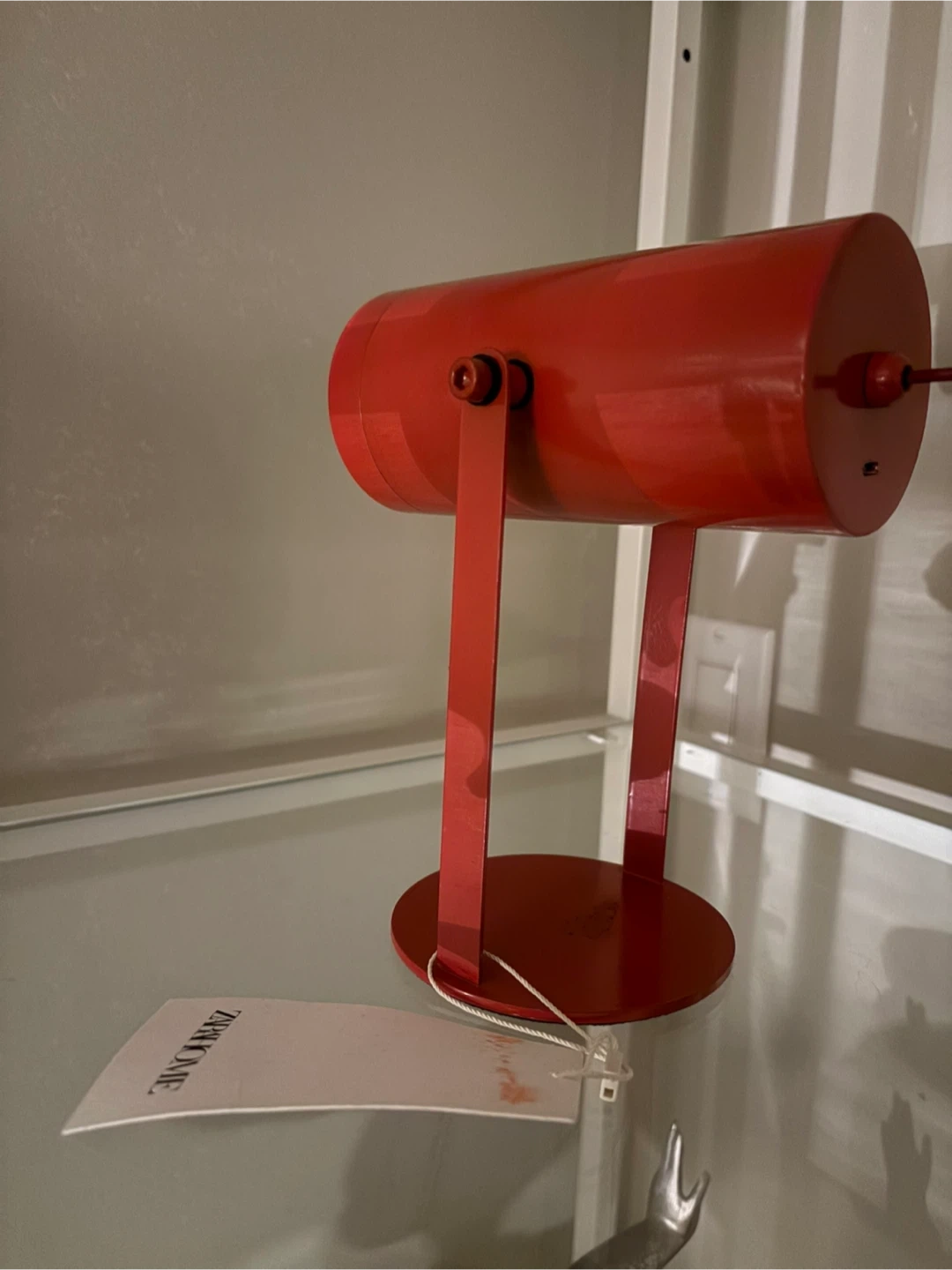 A sleek red desk lamp from Zara Home. It's made of iron metal and has a modern cylindrical design. Perfect for adding a bit of focused light to your workspace or reading nook!
