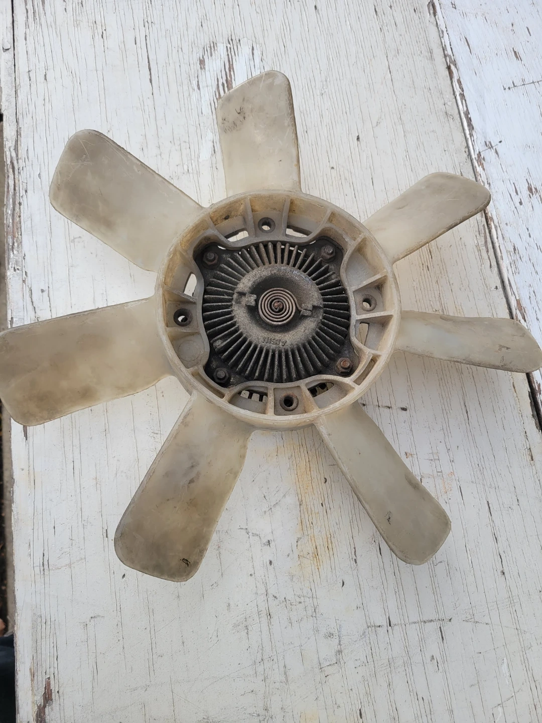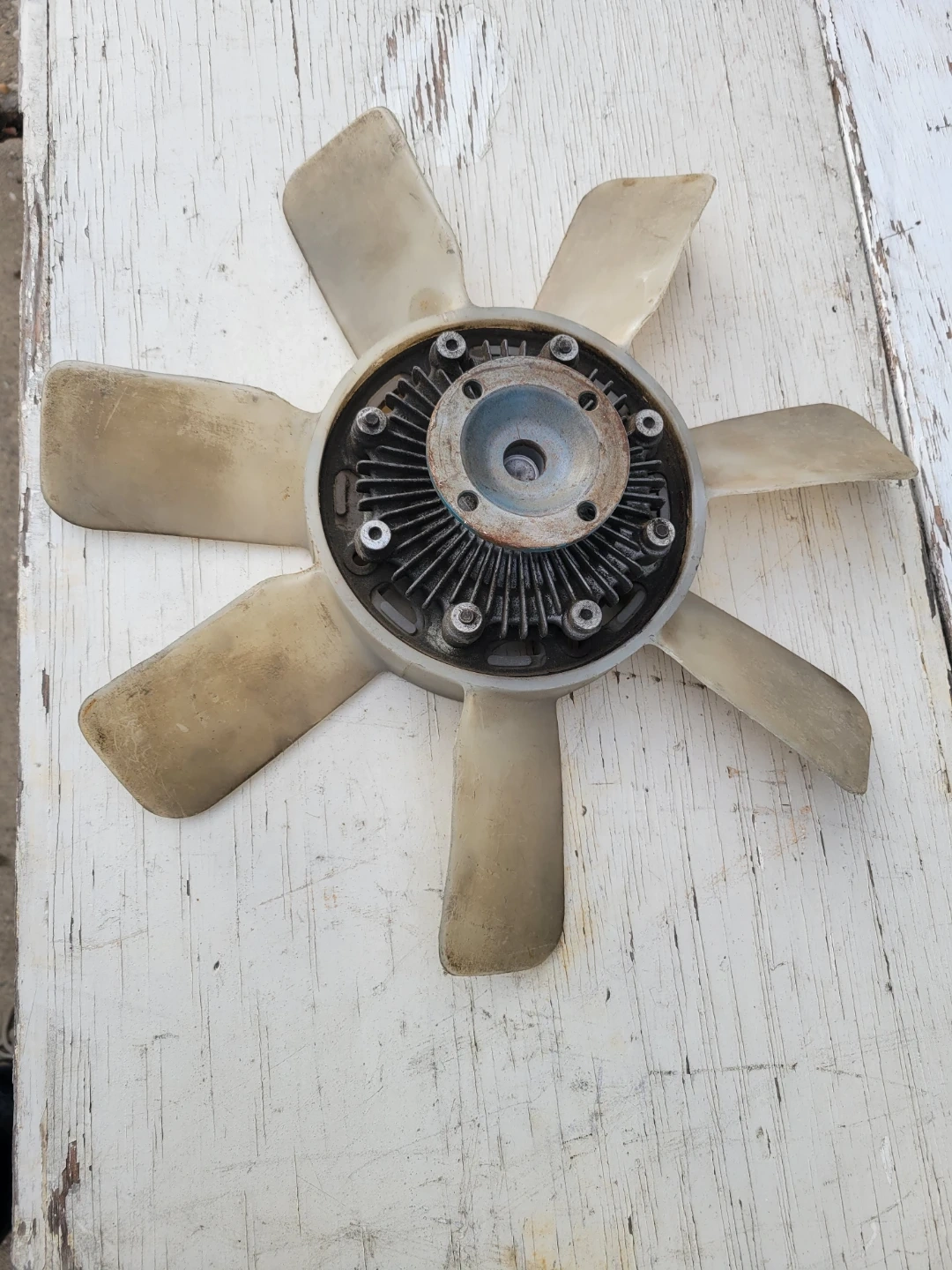 This is an ASIN brand fan clutch with 7 blades. It's designed for automotive cooling systems. The unit is made of metal and plastic. Pulled from my 1984 toyota pickup with a 22RE engine.