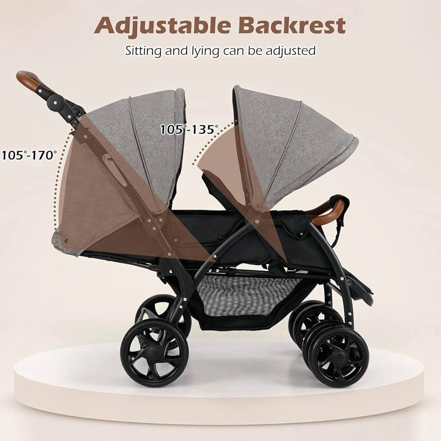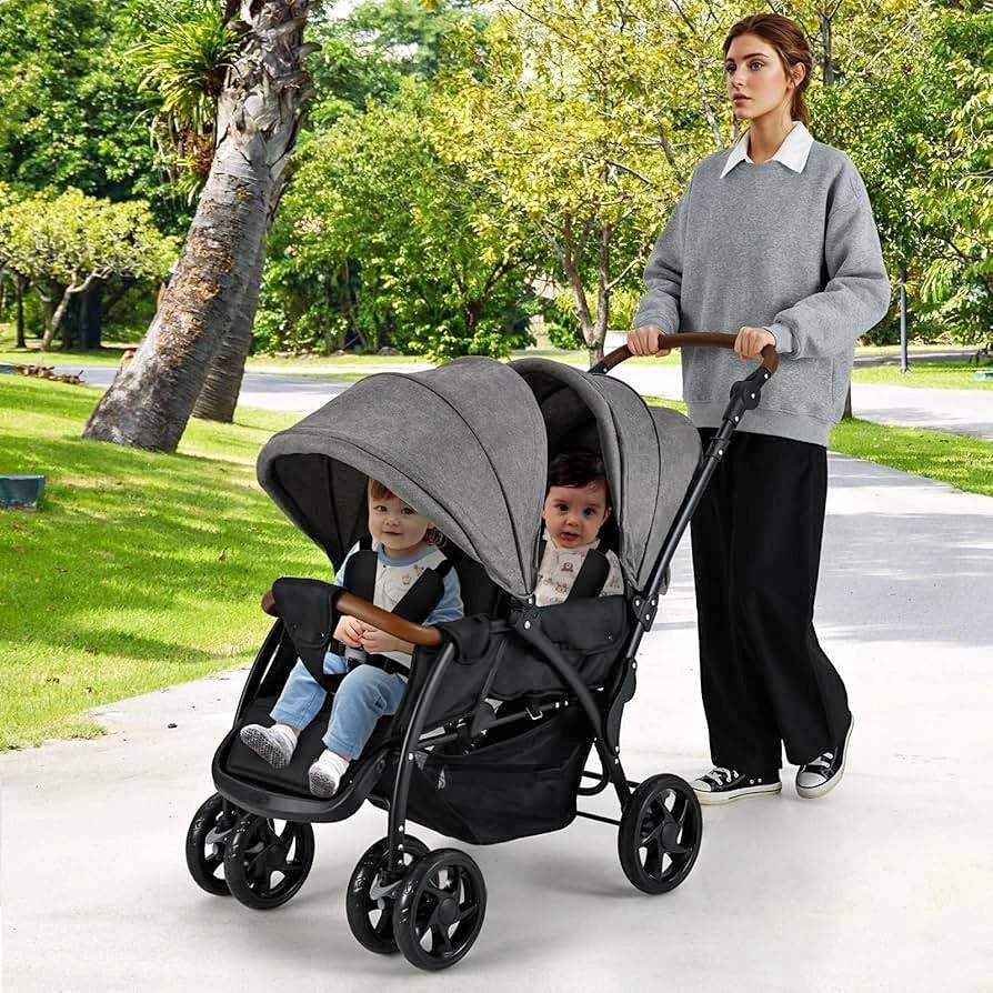 New in box INFANS double stroller. This is a foldable baby tandem stroller with an adjustable backrest, canopy, and footrest. It features a 5-point harness and a storage basket. It's a convertible, compact twin stroller suitable for infants and toddlers. Grey color.