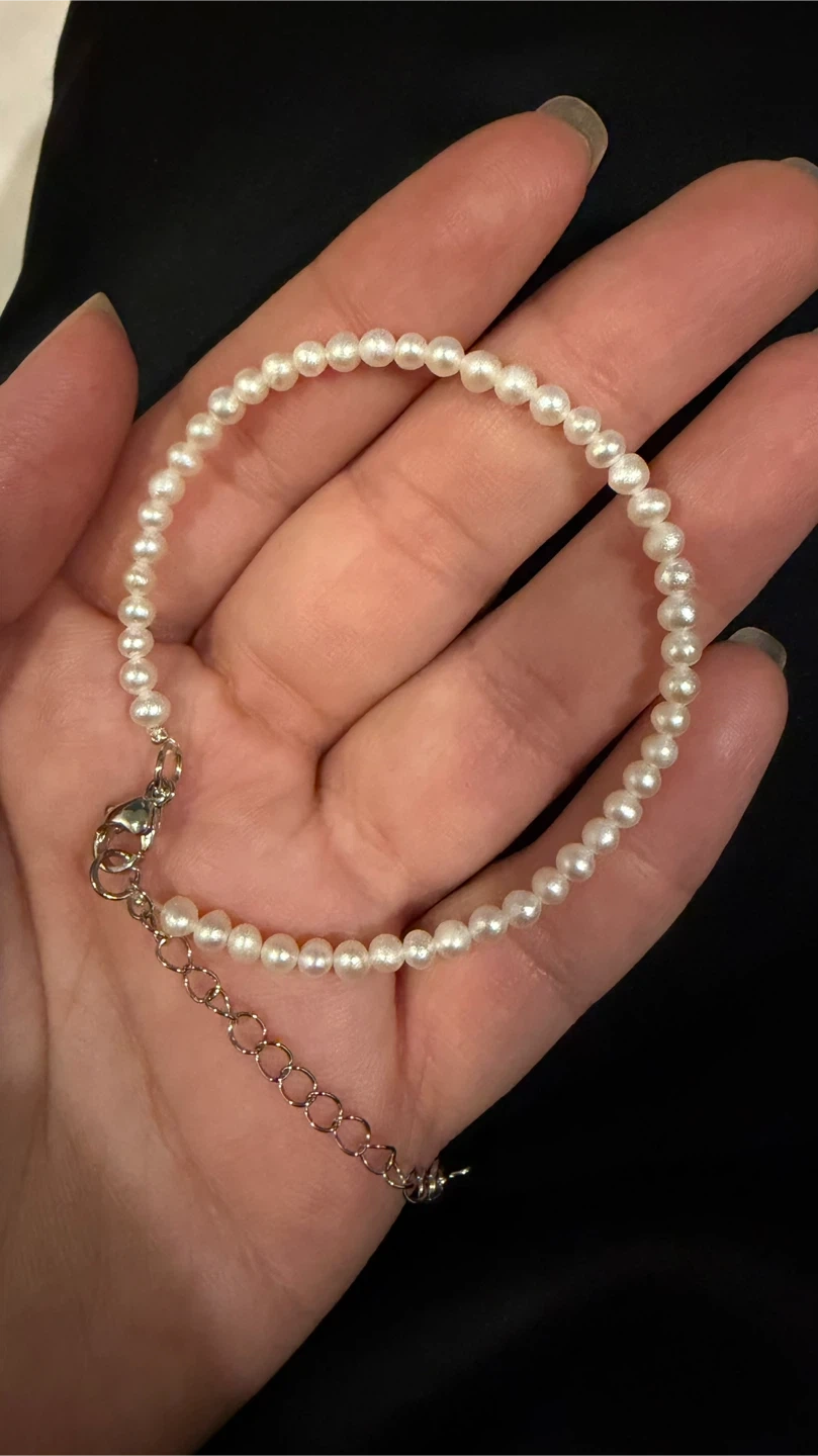 This is a lovely real pearl bracelet with small pearls. It's got a real silver clasp and an adjustable chain. Adds a classic touch to any outfit.