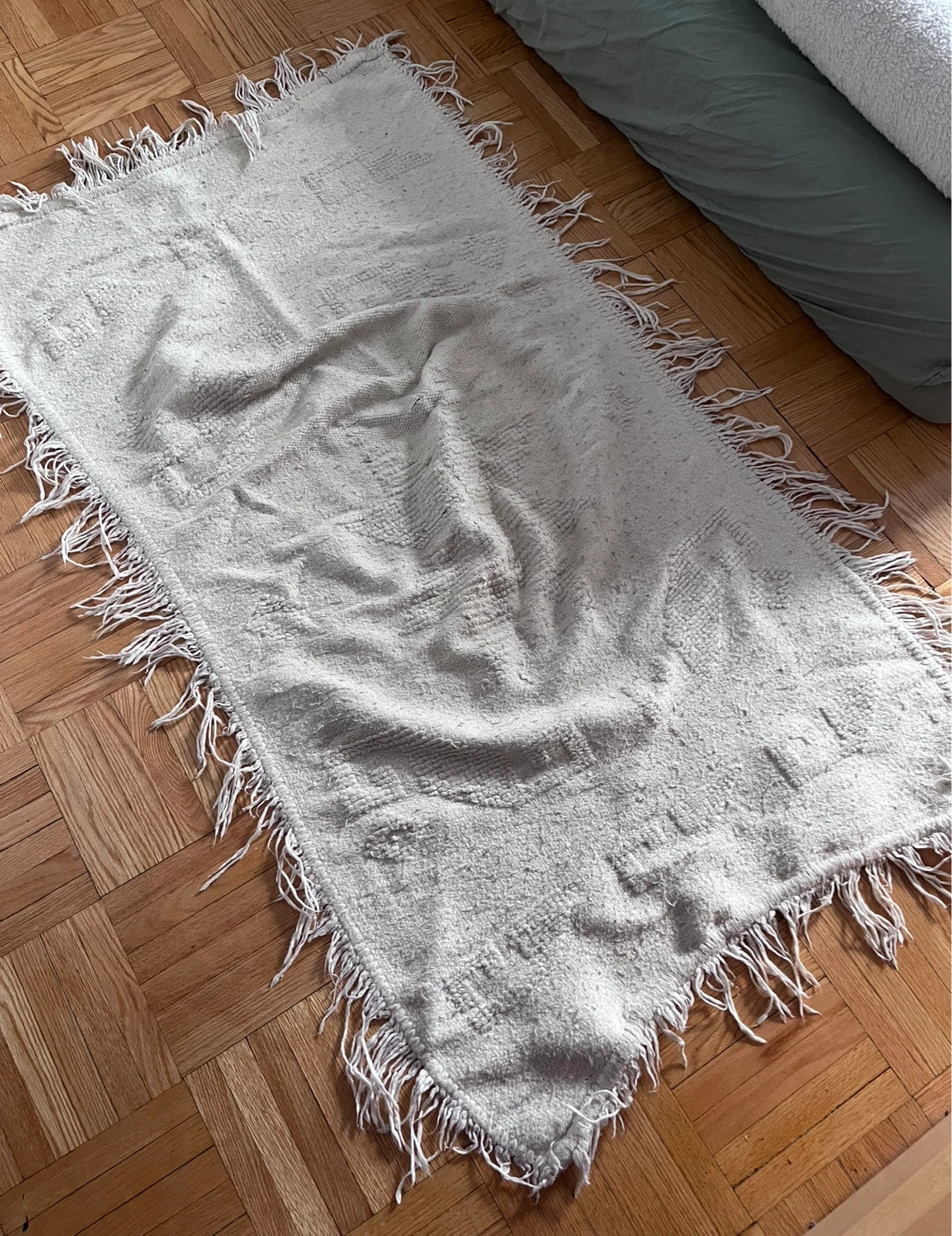 This is a neutral cream-coloured throw rug with tassels on each end. It's made from a woven material and would work well to add a bit of texture to a room. Would be a nice addition to a entryway or hallway.
