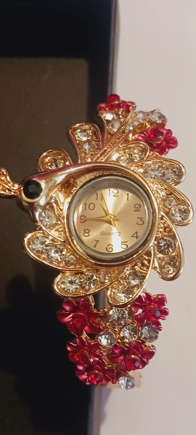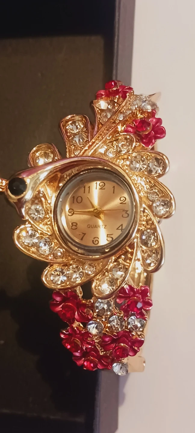 New !! This decorative bracelet watch is gold-tone adorned with red and clear rhinestones. The watch face has a quartz movement and a champagne dial. It's a stylish accessory that adds a pop of color and sparkle!! Watch needs a battery, selling as is.