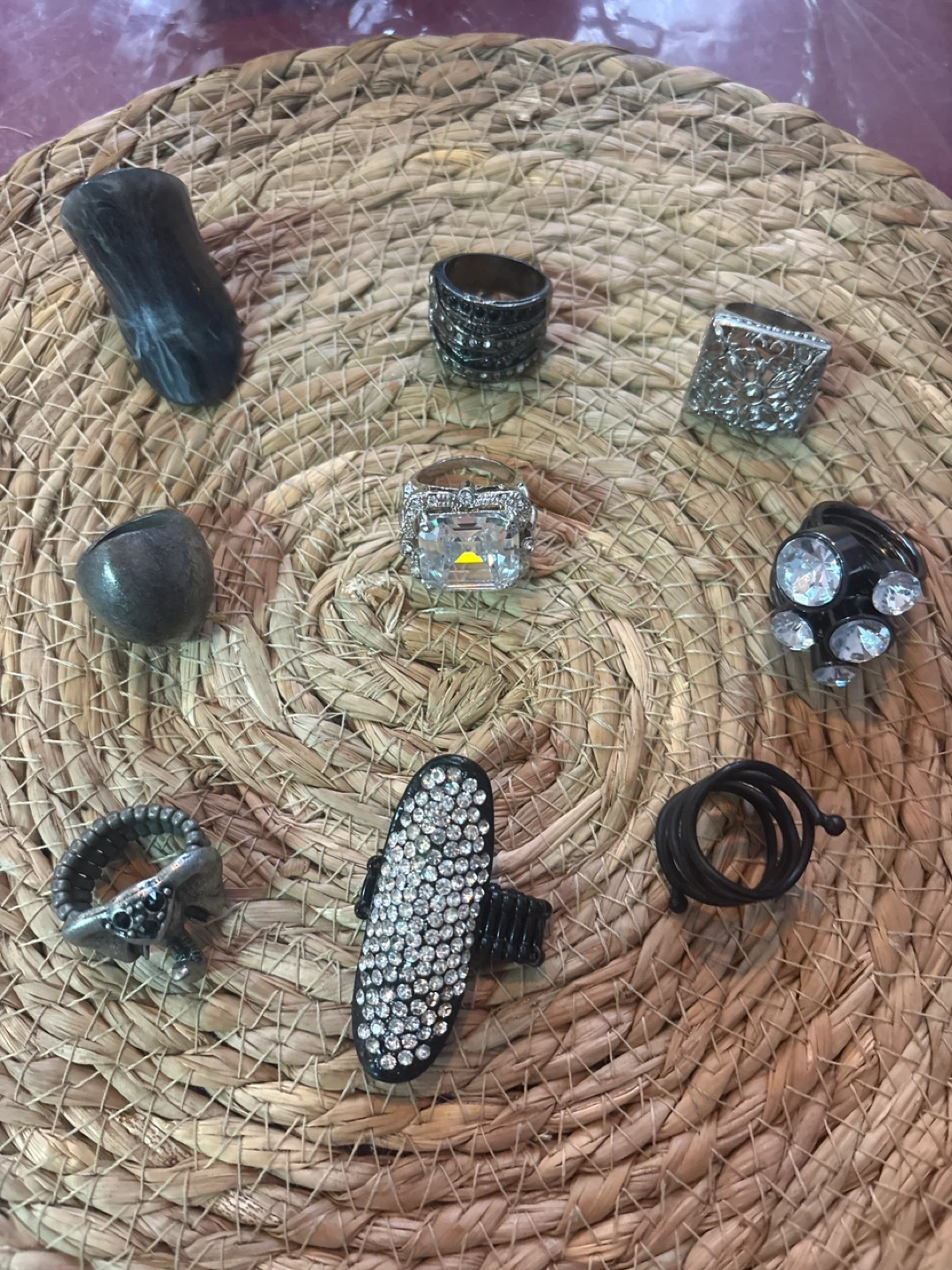 Includes a variety of rings, necklaces, and bracelets. Some pieces feature rhinestones and intricate designs. Great for accessorizing any outfit!