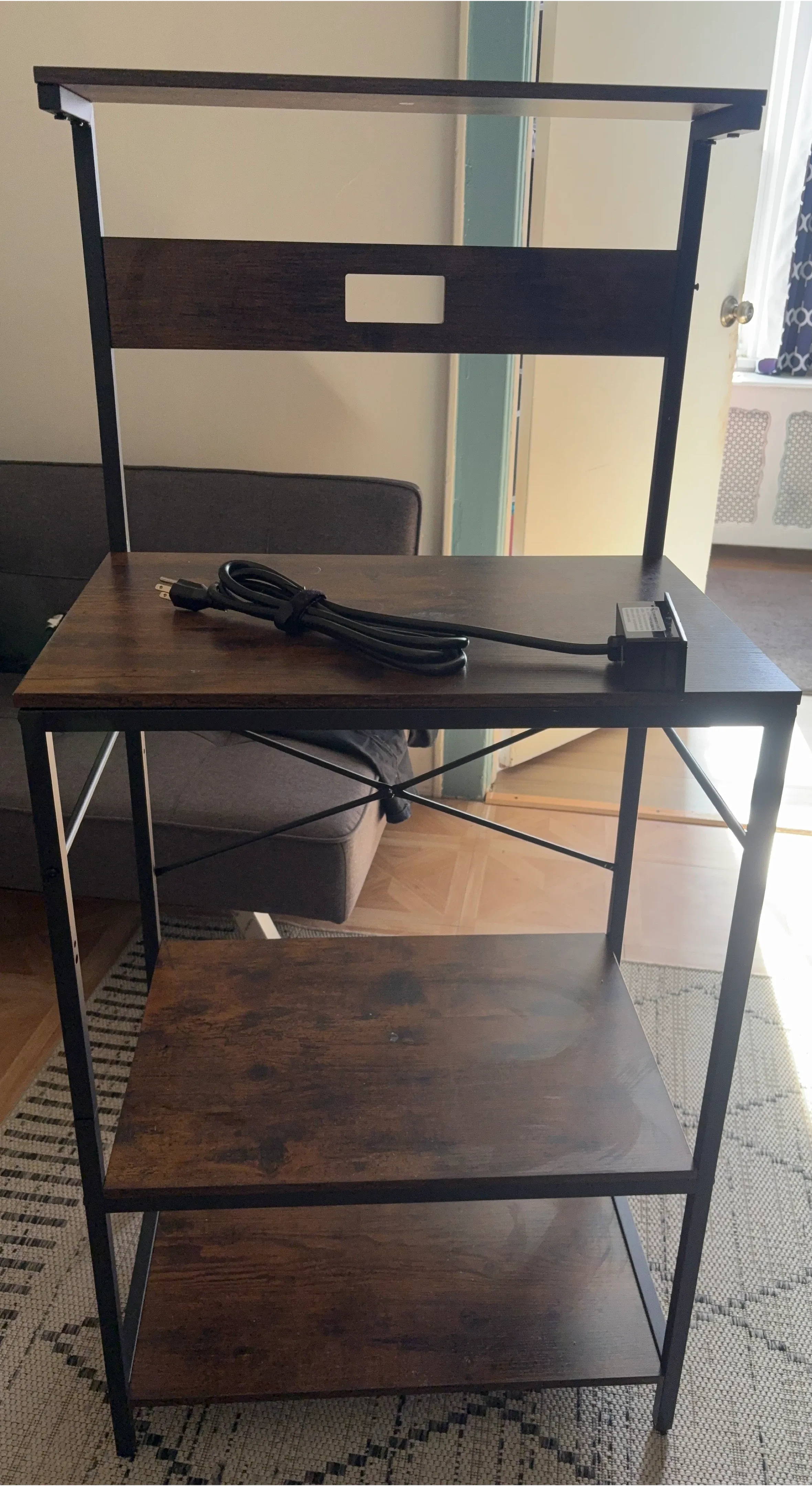 This is a 3-tier shelving unit with a rustic wood finish and black metal frame. It's designed to offer storage and display space. The unit includes a power strip with a cord.