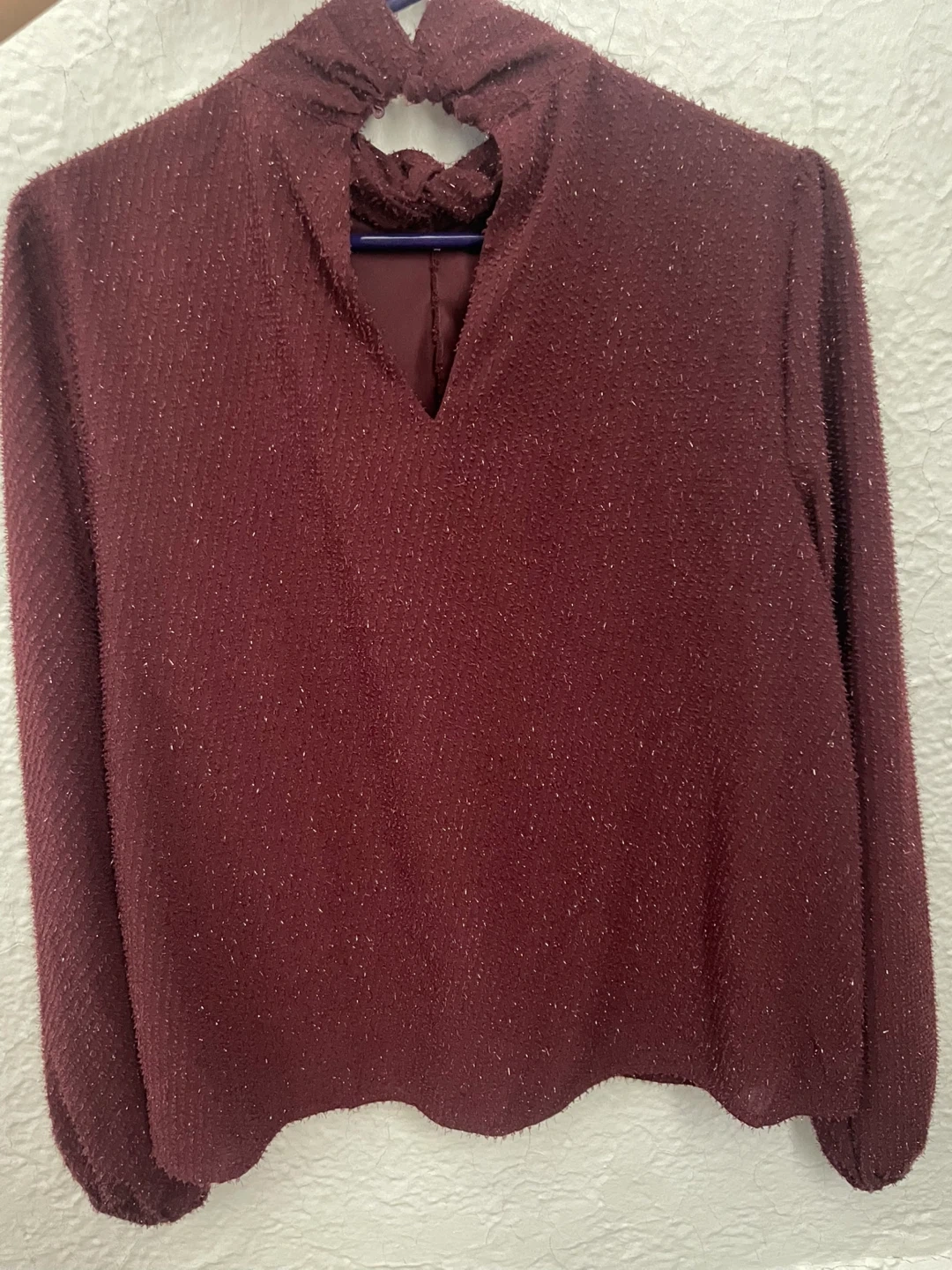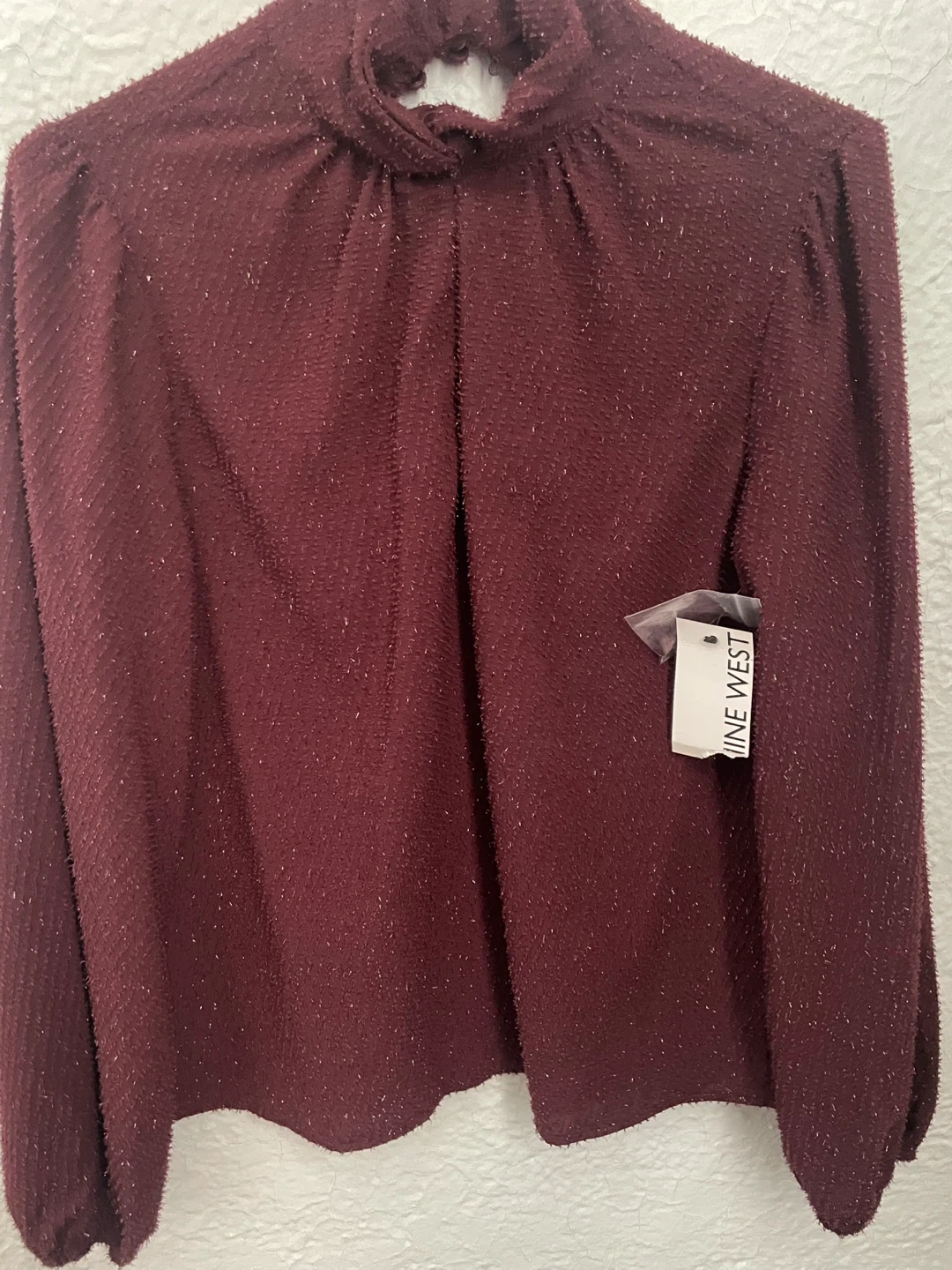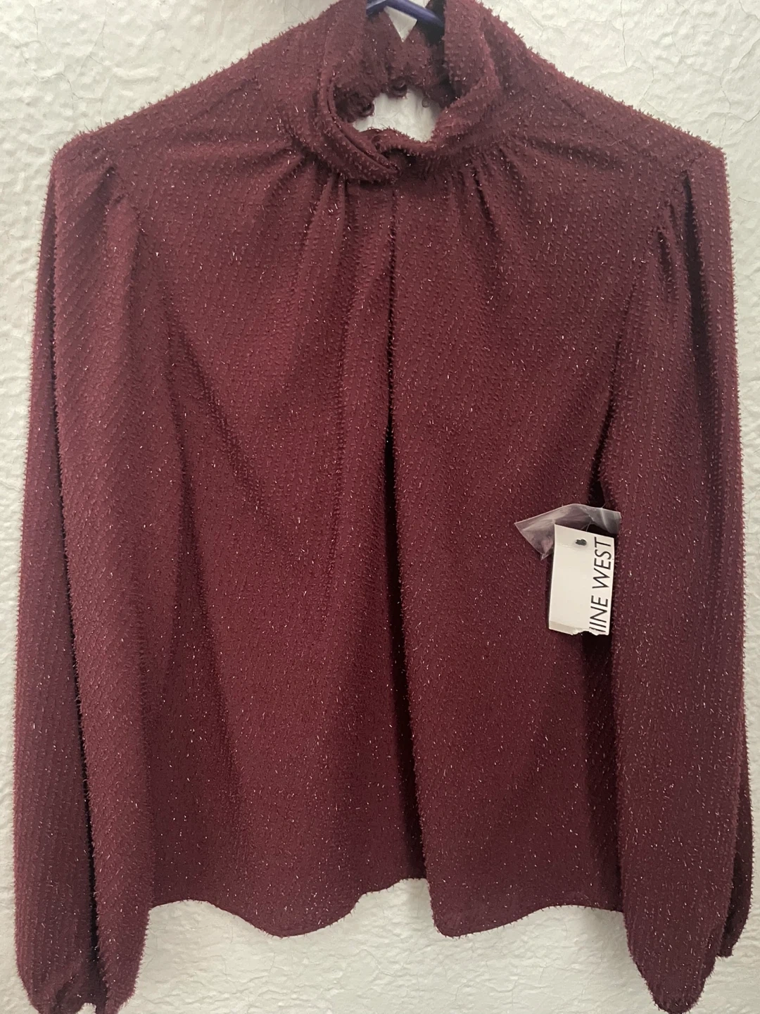 This is a burgundy mock neck top from Nine West with a subtle sparkle texture. It's a long-sleeved blouse with a keyhole back detail. It's a great addition to your wardrobe for a touch of shine!