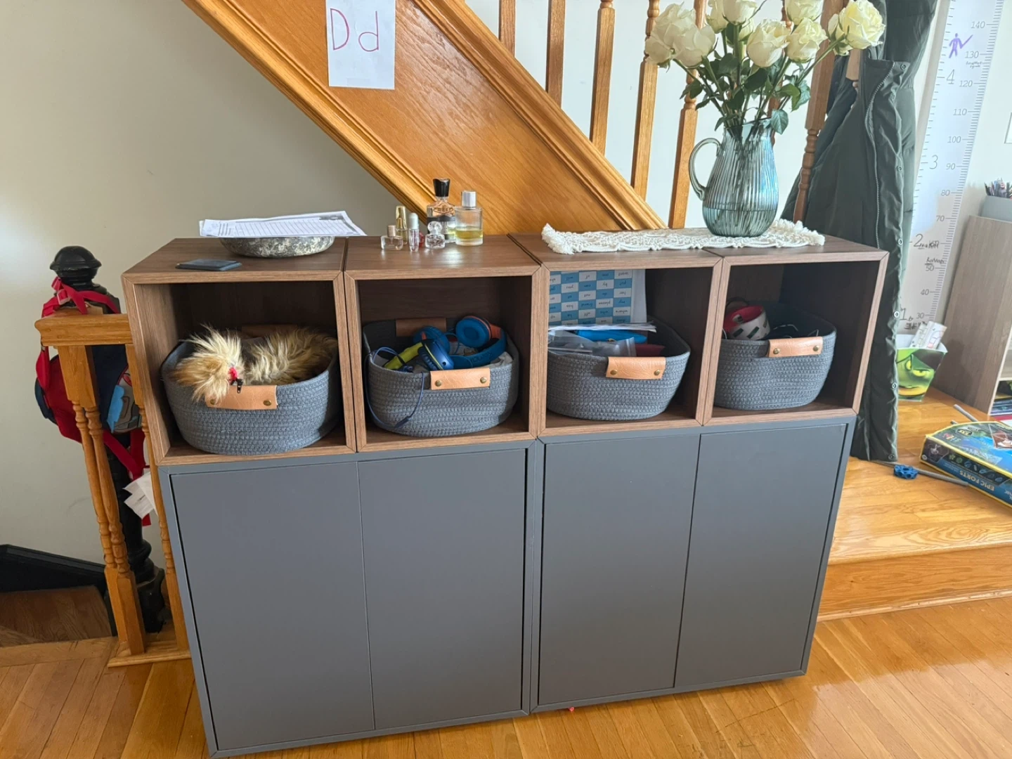 IKEA Stackable storage unit with four open cube shelves. Includes four grey woven baskets with leather handles. Unit has two lower cabinet doors for concealed storage. Assembly required.