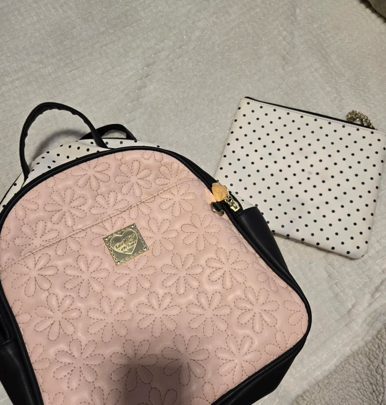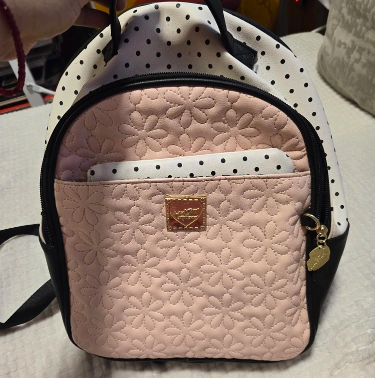 Cute Betsey Johnson backpack with a quilted pink front featuring embroidered daisies. It's black and white polka dot material on the sides and straps. Includes a matching polka dot pouch. Great for everyday use! (Big capacity!)