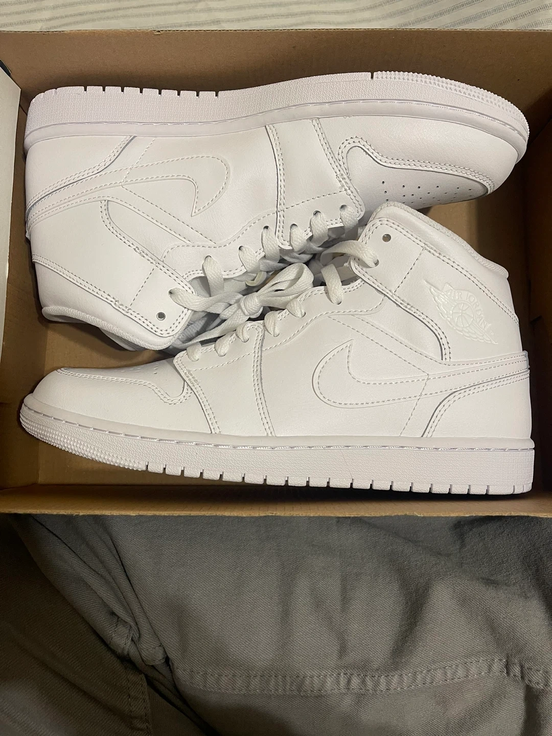 These are Air Jordan 1 Mid sneakers in a clean white colorway. They feature a mid-top silhouette and leather construction. The iconic Air Jordan wings logo is embossed on the ankle collar.