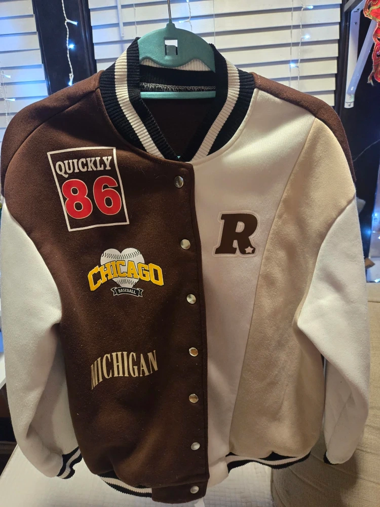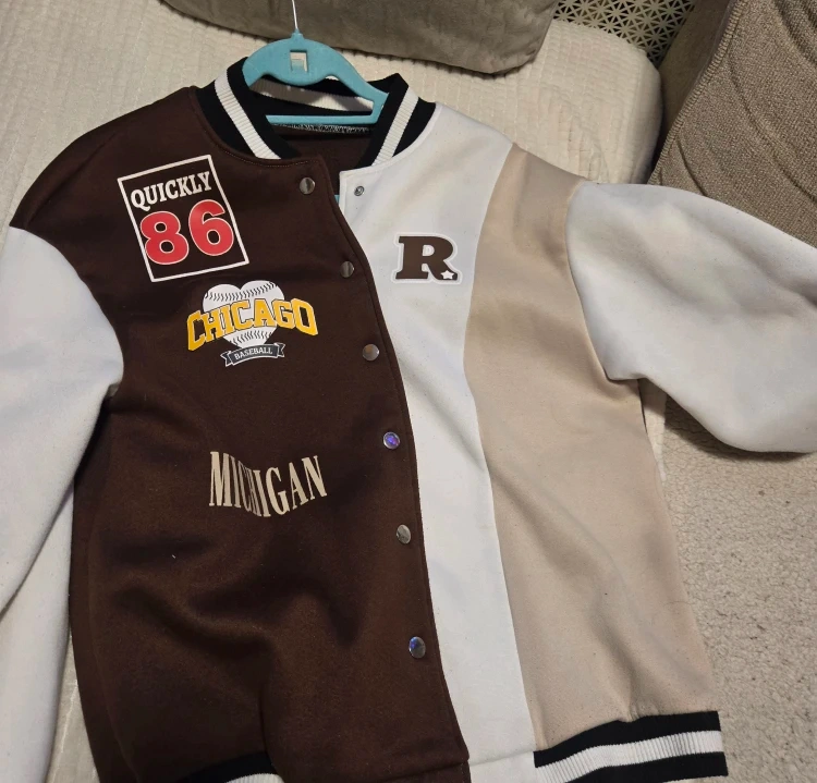 This is a stylish letterman jacket with a patchwork design. It's a great piece for a casual look! (Only worn twice, material isnt that thick!)